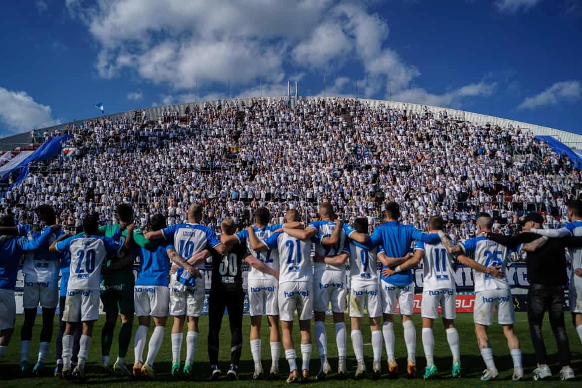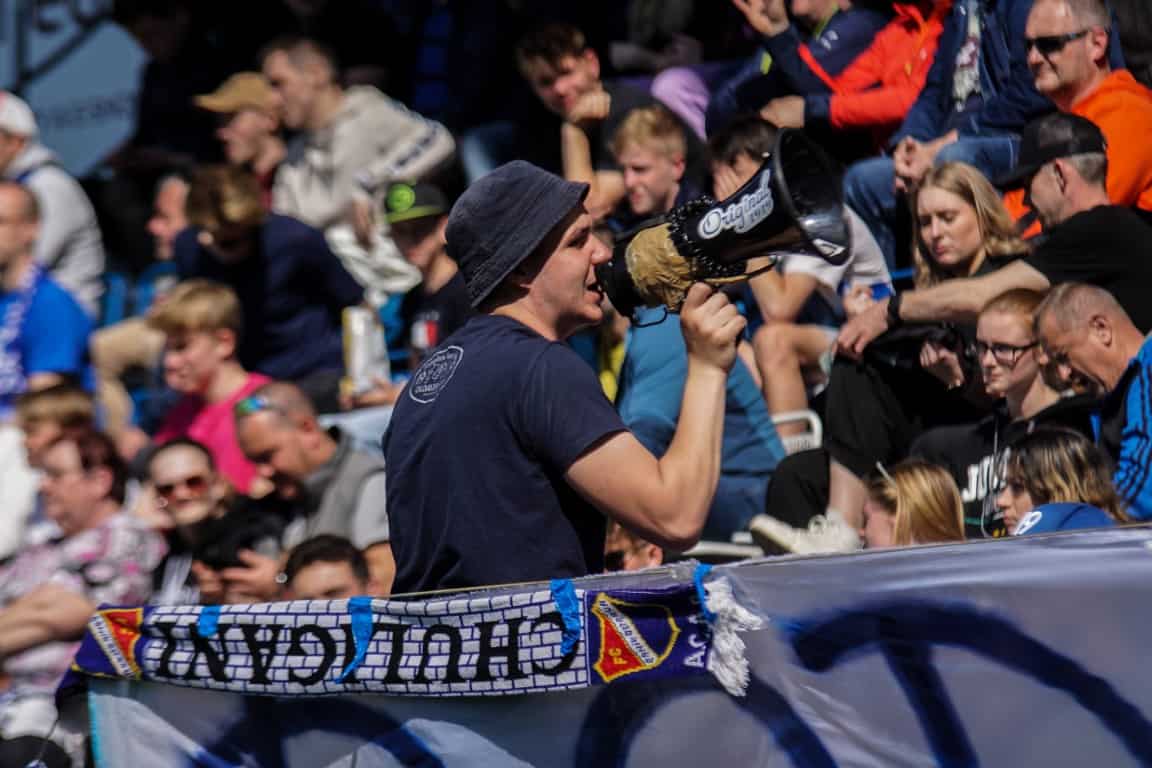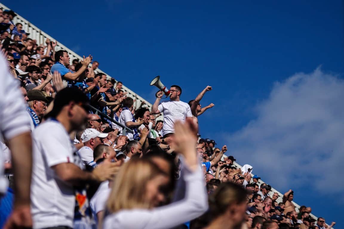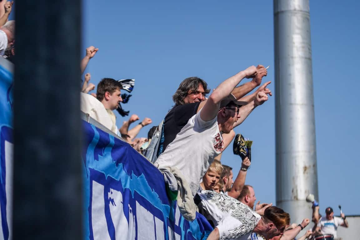Na één minuut blessuretijd voor het idee fluit de scheidsrechter definitief af. Bovenin het bezoekersvak wordt nog een blauwe rookbom afgestoken om de winst te vieren. De spelers haasten zich naar het uitvak en blijven daar nog lang staan. Meerdere liedjes worden er gezamenlijk door het publiek en de spelers gezongen. De spelers klappen mee, haken net als de supporters in en springen enthousiast op en neer. We hebben wel eens selecties gezien die dit soort momenten als een verplicht nummertje lijken te zien, maar daar is vandaag geen sprake van. De spelers en supporters zijn oprecht blij met het belangrijke resultaat en deze schitterende voetbaldag.