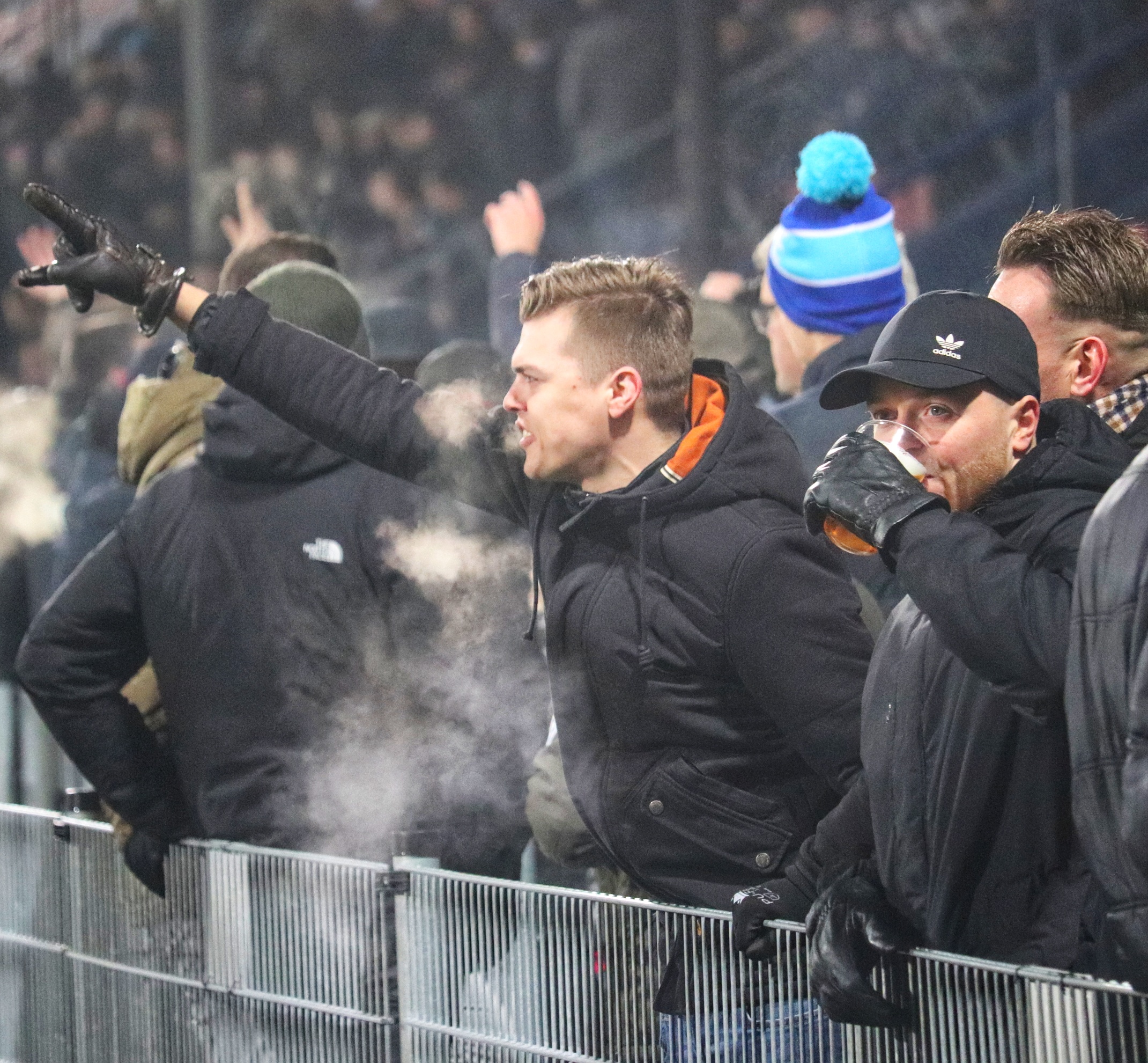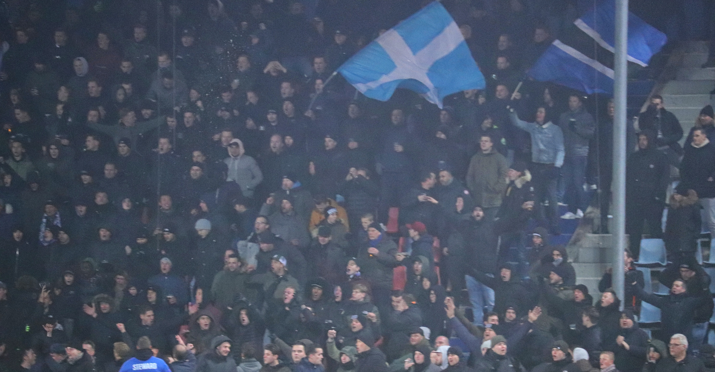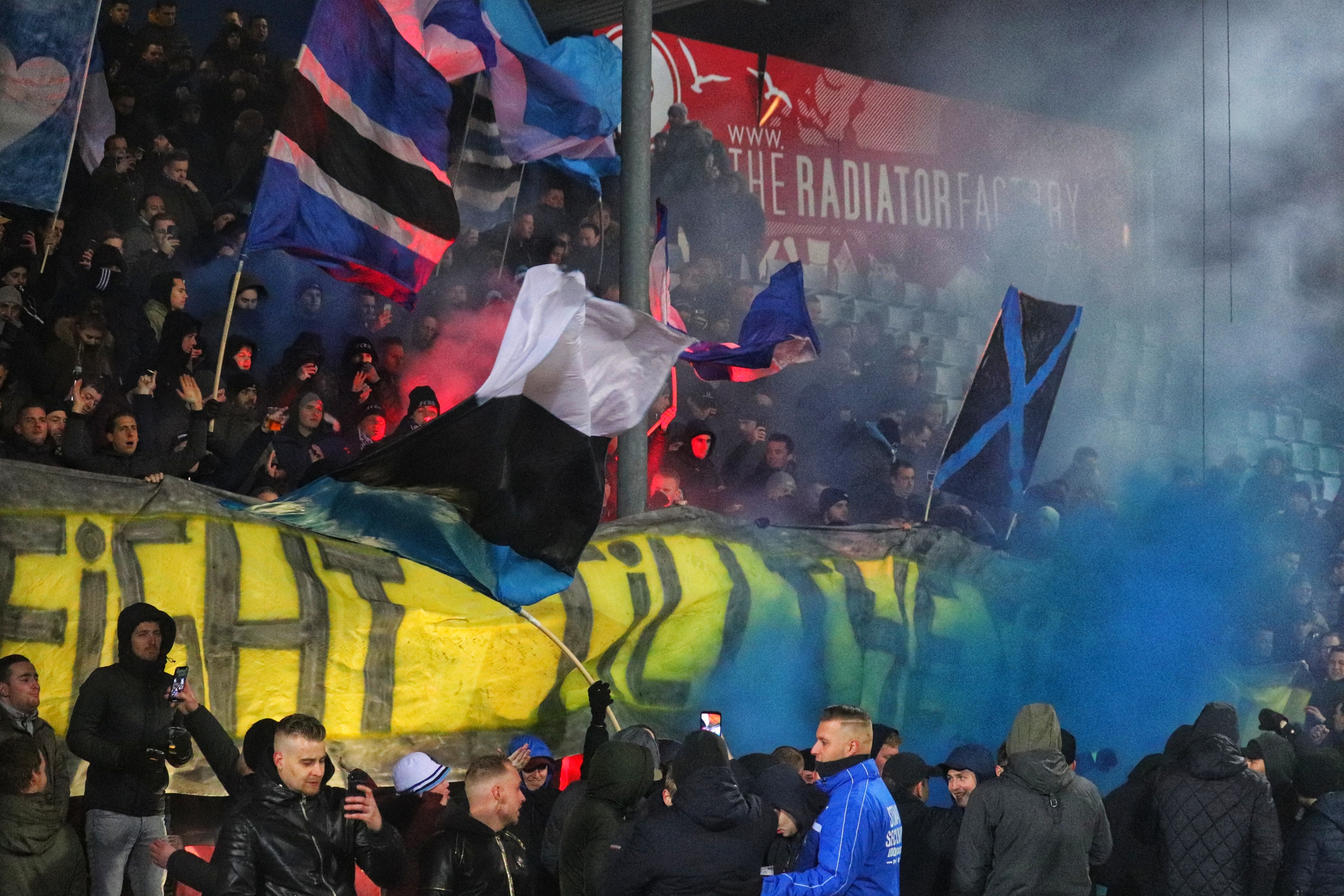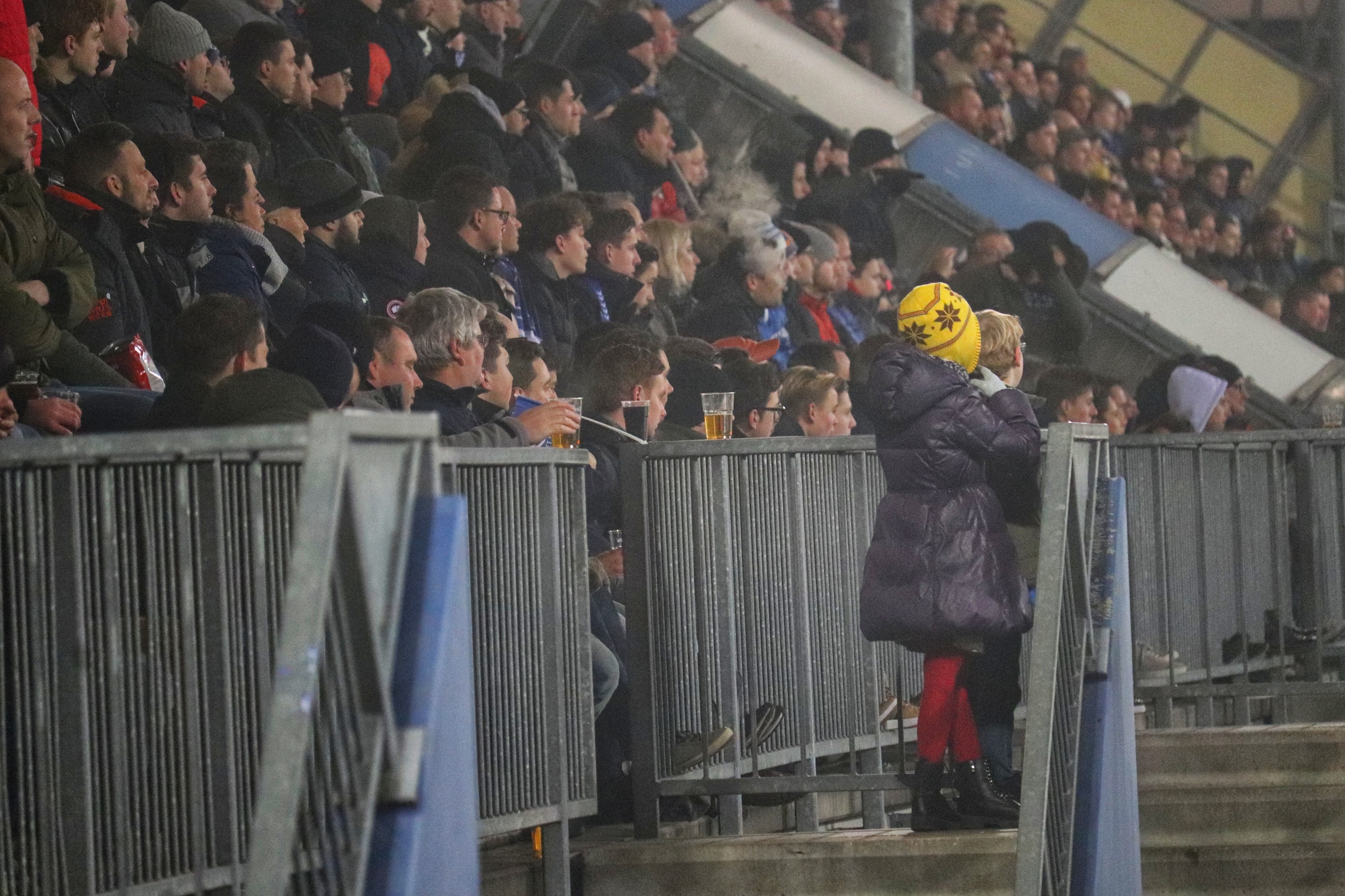 Bij de opkomst wordt er door de FC Den Bosch supporters verschillende soorten pyro afgestoken, in combinatie met de vlaggen een prachtig gezicht. De sfeer is prachtig, maar slaat na de aftrap niet over naar het veld. Er zijn, mede door het ku(ns)tgras, weinig felle duels. De eerste kans ontstaat pas na 23 minuten als de Blauw-Witten opeens voor het doel van Top Oss opduiken en de lat raken. De sfeer kakt in en ik ben dan ook blij als er na 45 ijskoude minuten wordt afgefloten.