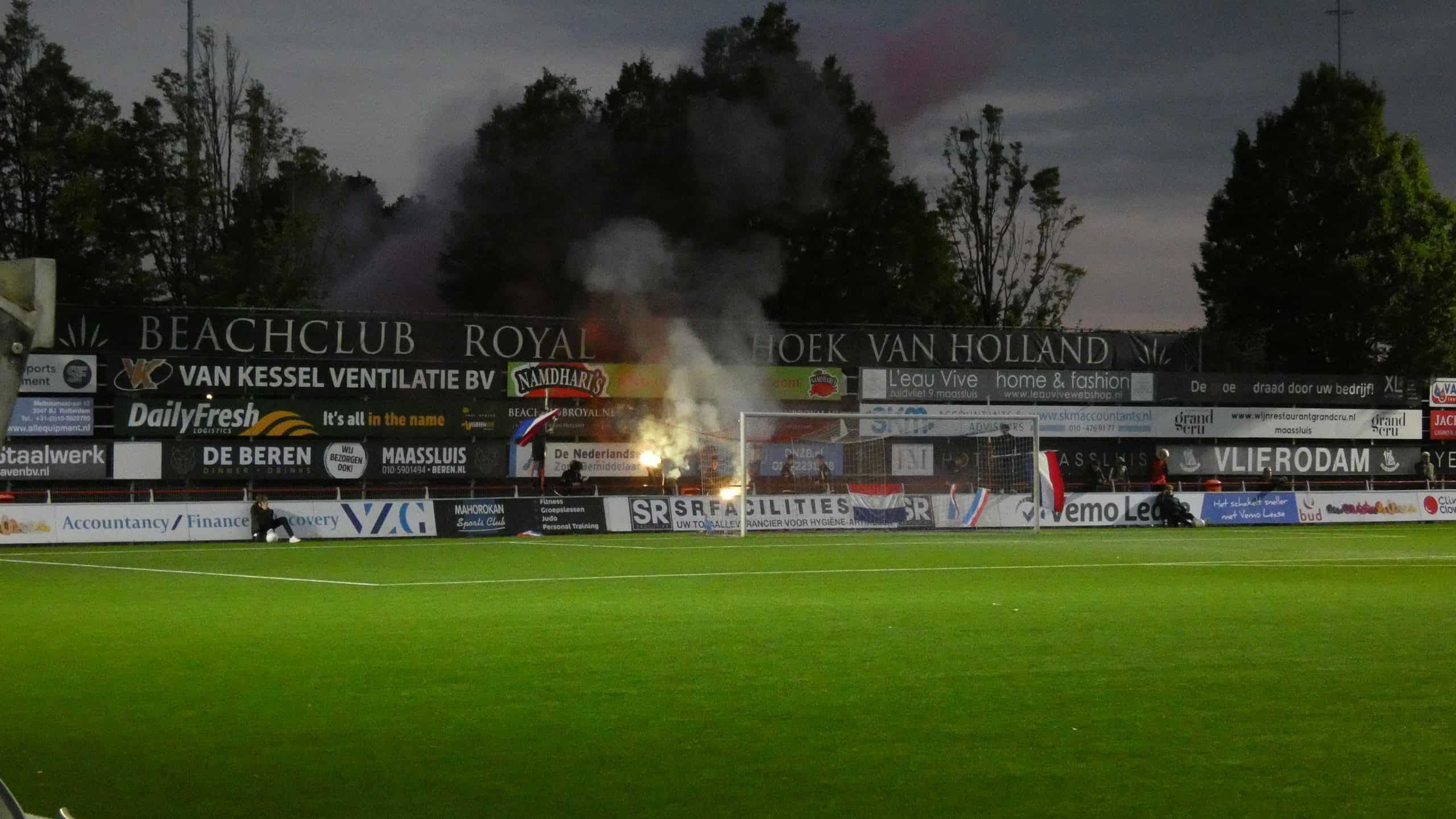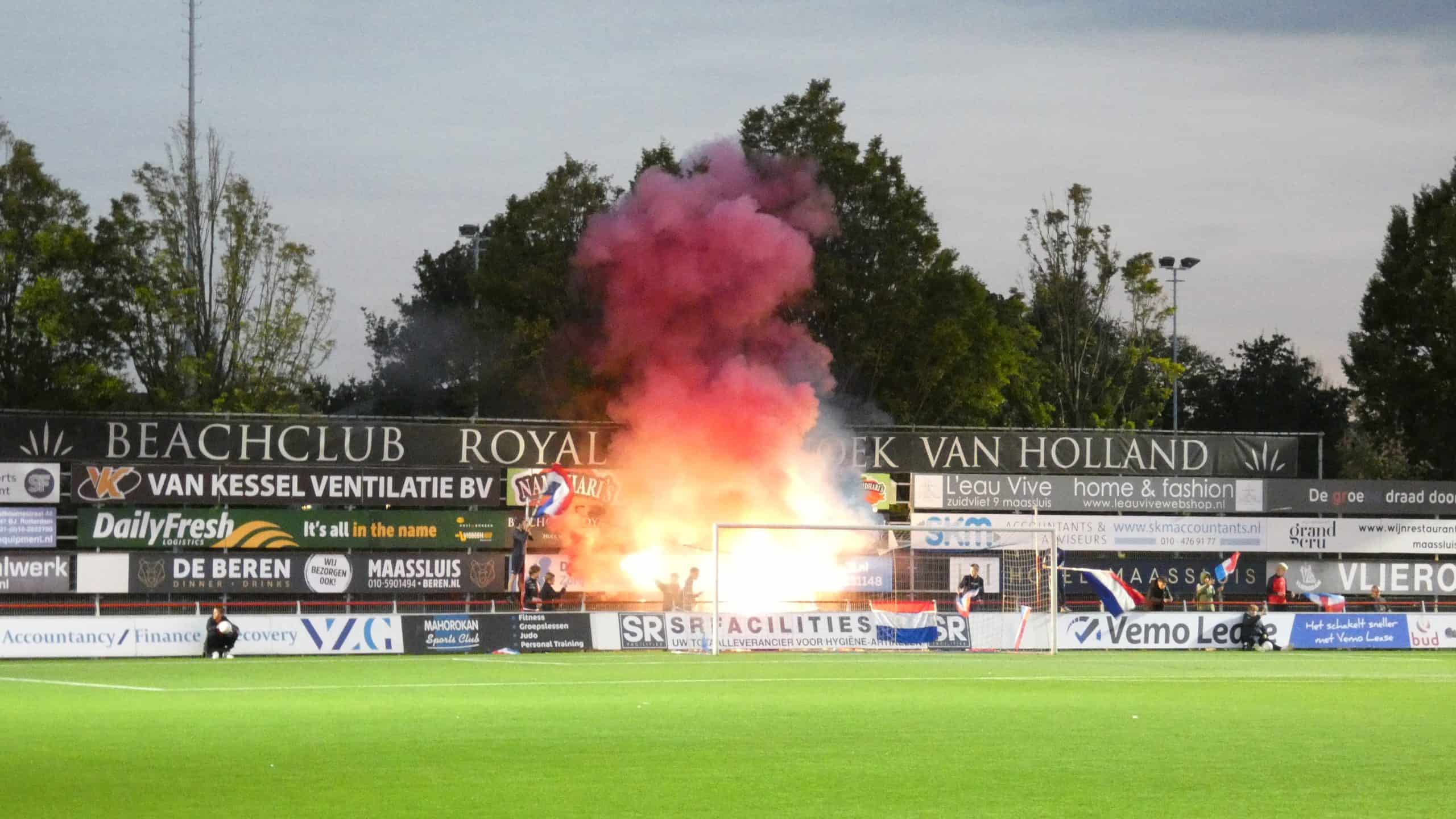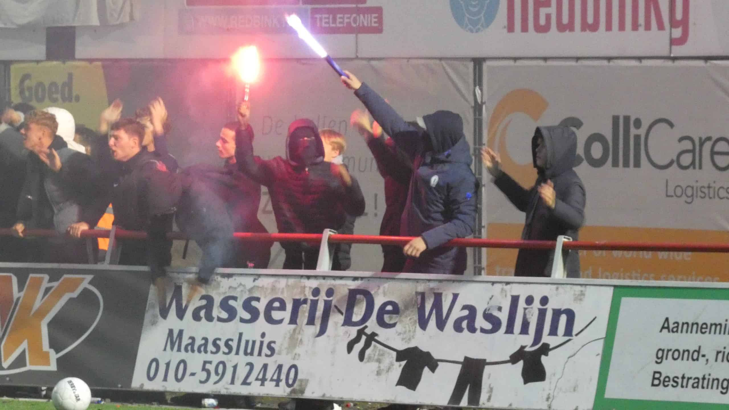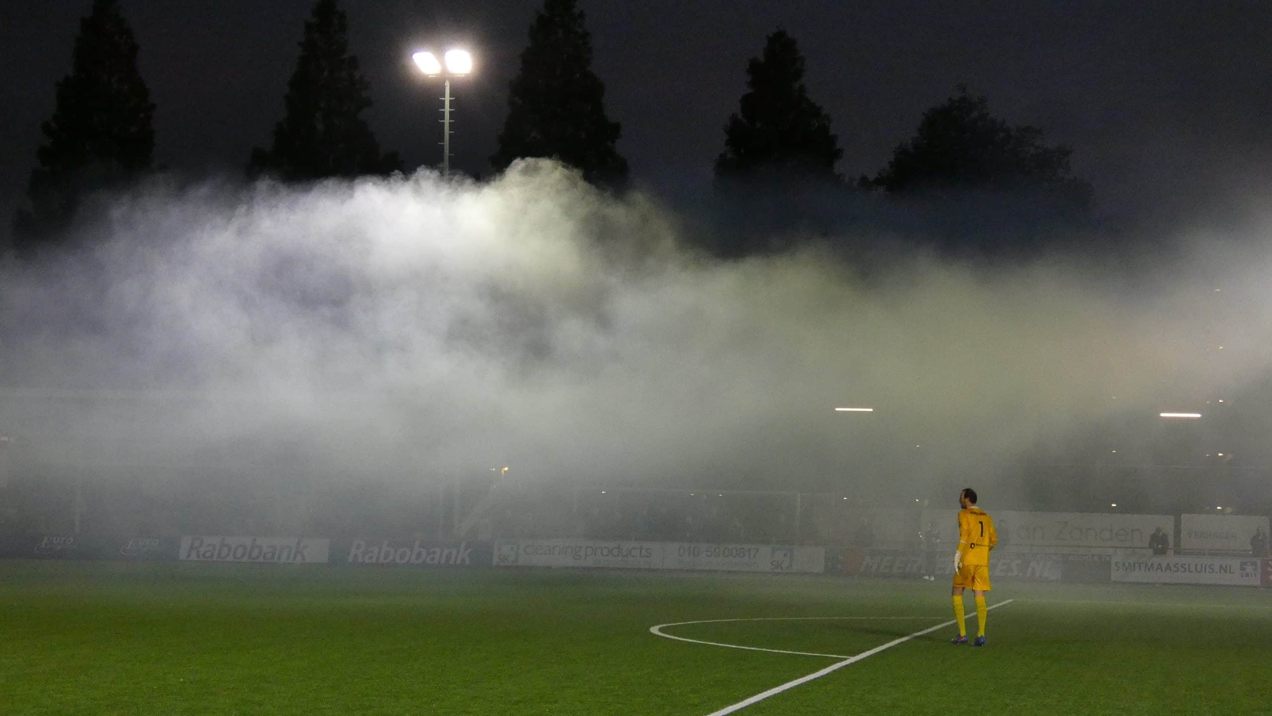 Het vuurwerk langs de lijn hebben we gehad, dus is het tijd voor het vuurwerk op het veld. Dat krijgen we de eerste twintig minuten ook zeker te zien. Excelsior Maassluis komt in de vijftiende minuut op een 1-0 voorsprong, maar kan daar niet lang van genieten. Drie minuten later staat het alweer 1-1. Dat vieren de uitsupporters wederom met vuurwerk en dat is reden genoeg voor de scheids om het spel een aantal minuten stil te leggen. Dit is meteen de laatste waarschuwing voordat de wedstrijd helemaal stilgelegd wordt.