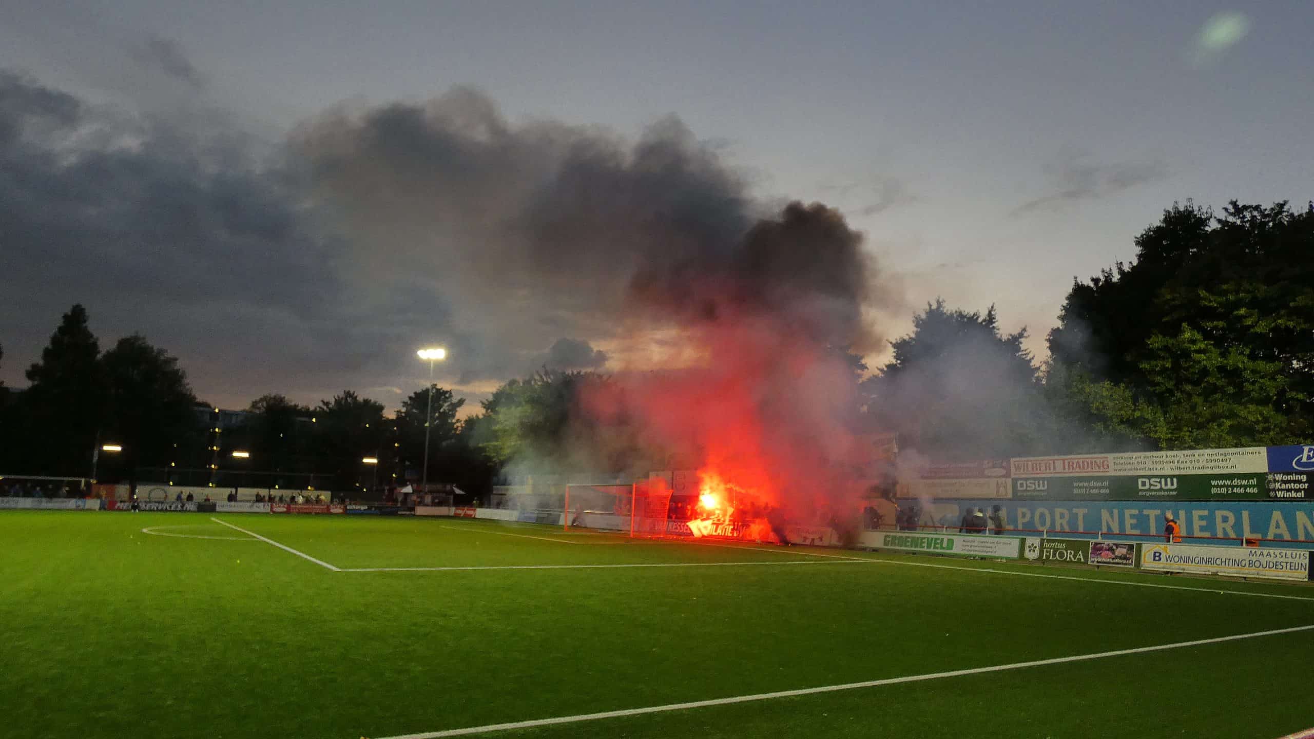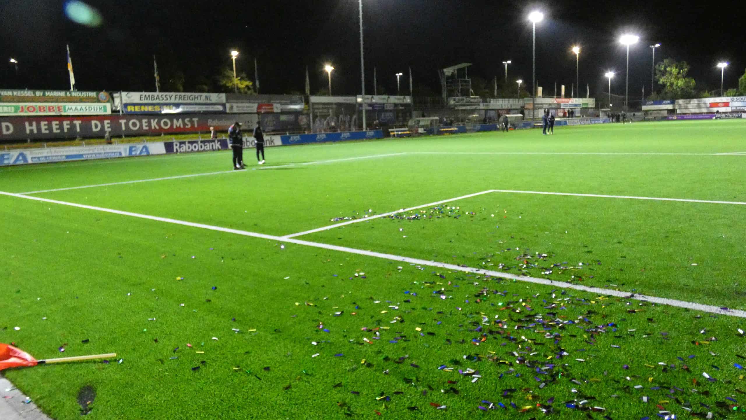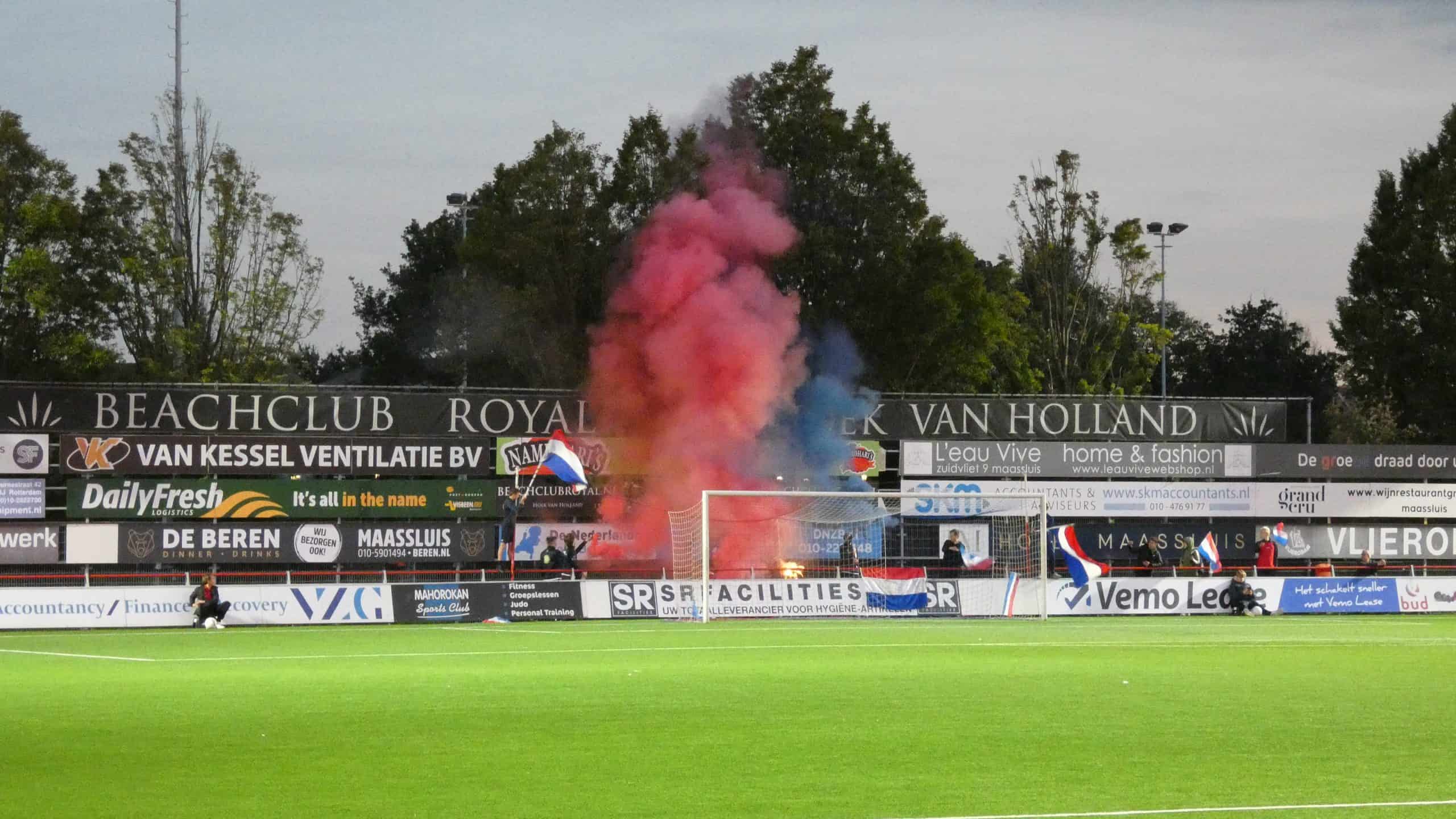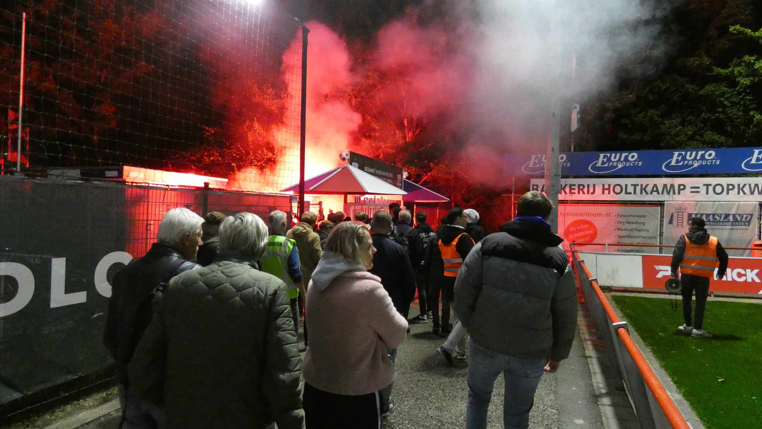 Het vuurwerk langs de lijn hebben we gehad, dus is het tijd voor het vuurwerk op het veld. Dat krijgen we de eerste twintig minuten ook zeker te zien. Excelsior Maassluis komt in de vijftiende minuut op een 1-0 voorsprong, maar kan daar niet lang van genieten. Drie minuten later staat het alweer 1-1. Dat vieren de uitsupporters wederom met vuurwerk en dat is reden genoeg voor de scheids om het spel een aantal minuten stil te leggen. Dit is meteen de laatste waarschuwing voordat de wedstrijd helemaal stilgelegd wordt.