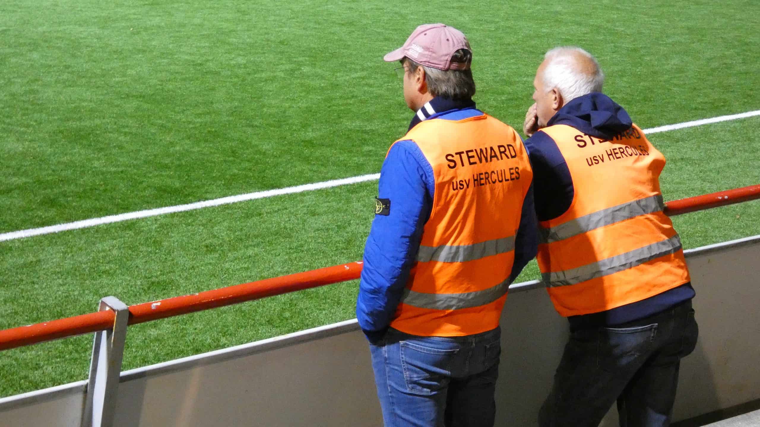 In de rij om het sportpark op te komen wordt iedereen goed gefouilleerd. De stewards die opgetrommeld zijn nemen hun werk uiterst serieus. De tassen van de Hercules supporters die aankomen worden binnenstebuiten gekeerd. Het doel is om zoveel mogelijk vuurwerk buiten het sportpark te houden. Een tas met een confettikanon en een zogenaamde vlaggenstok wordt eruit gehaald. ‘’Inspecteer deze tas even goed’’ wordt er geroepen. De tas en de jongeman mogen het sportpark op. Hierna volgen alleen nog maar meer tassen en zelfs twee trommels en een megafoon mogen niet ontbreken.