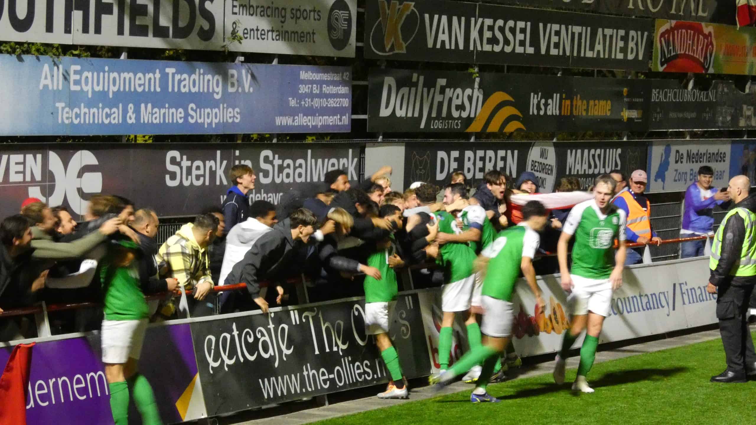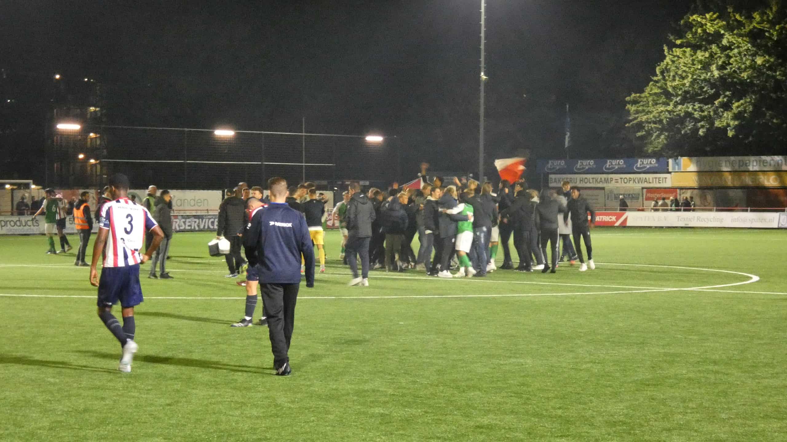 Alle supporters die negentig minute lang vocaal te horen waren sprinten het veld op. Wederom wordt het feest samen met hun spelers gevierd. Het contrast tussen winnaar en verliezer zijn hier enkele meters van elkaar verwijderd. De knock-outs schieten de lucht in en menig nitraat mag niet ontbreken. Als het feest op het veld voorbij is zoekt de uitploeg de kleedkamer op. Al die supporters zien een mogelijkheid om mee te feesten in de kleedkamer en duiken massaal de kleedkamer in. Het ziet er prachtig uit en supporter voor supporter wordt bedankt door de spelers in de kleedkamer.