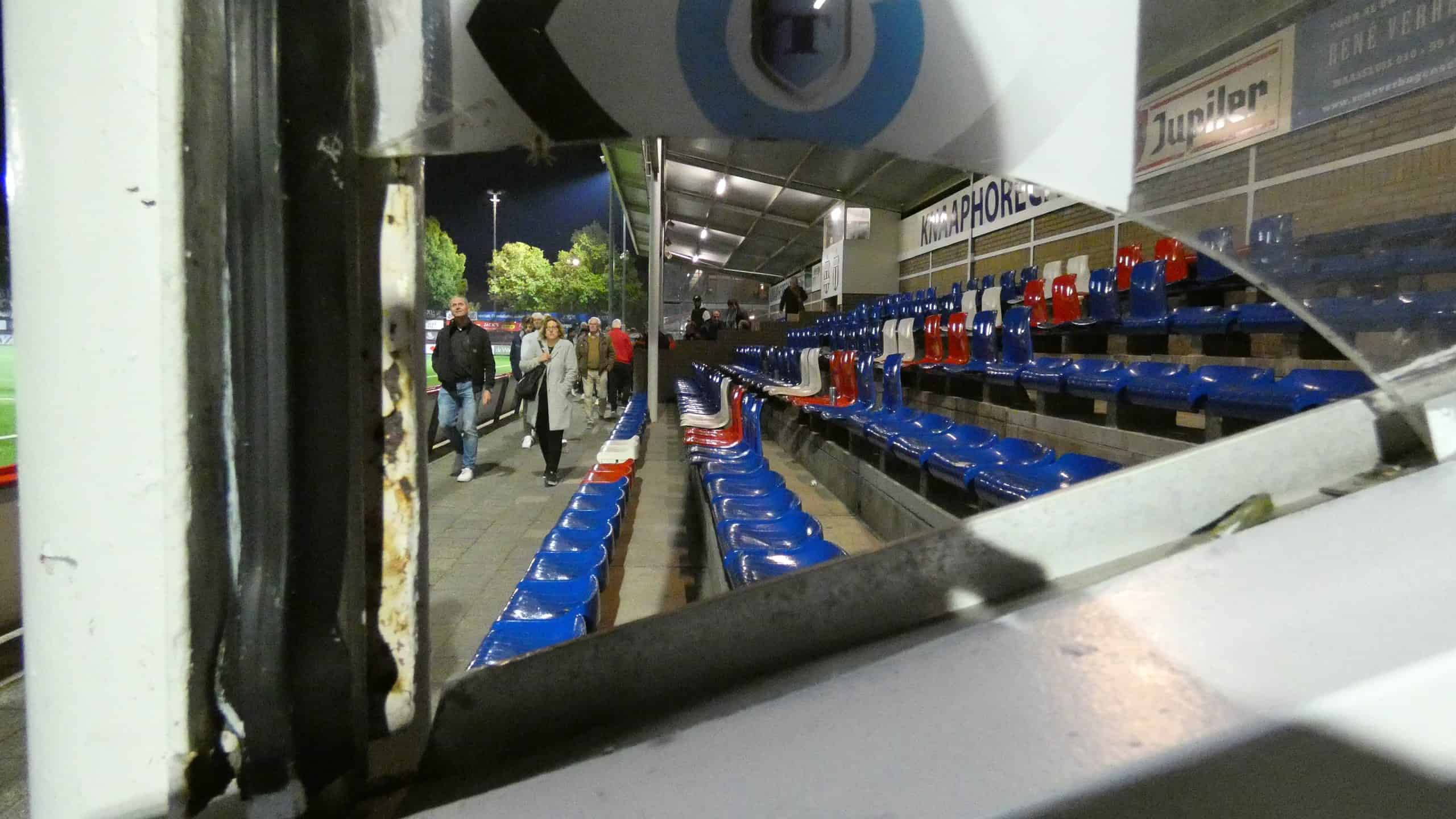Als iedereen binnen is wordt er snel een plek gezocht. Achter één van de doelen gaat de groep Hercules supporters staan. De vlaggen worden opgehangen, maar mogen op aanwijzing van de stewards niet aan de sponsorboarding hangen. Dan blijft er nog één mogelijkheid over en dat is in het vangnet achter het doel. Al snel klimmen twee gasten in de hekken om de laatste vlag op te hangen. Aan de overkant van het doel staat wat jeugd van Excelsior Maassluis. Zij hebben vlaggen in de kleuren van hun ploeg en hebben de rookpotten al klaar gezet.