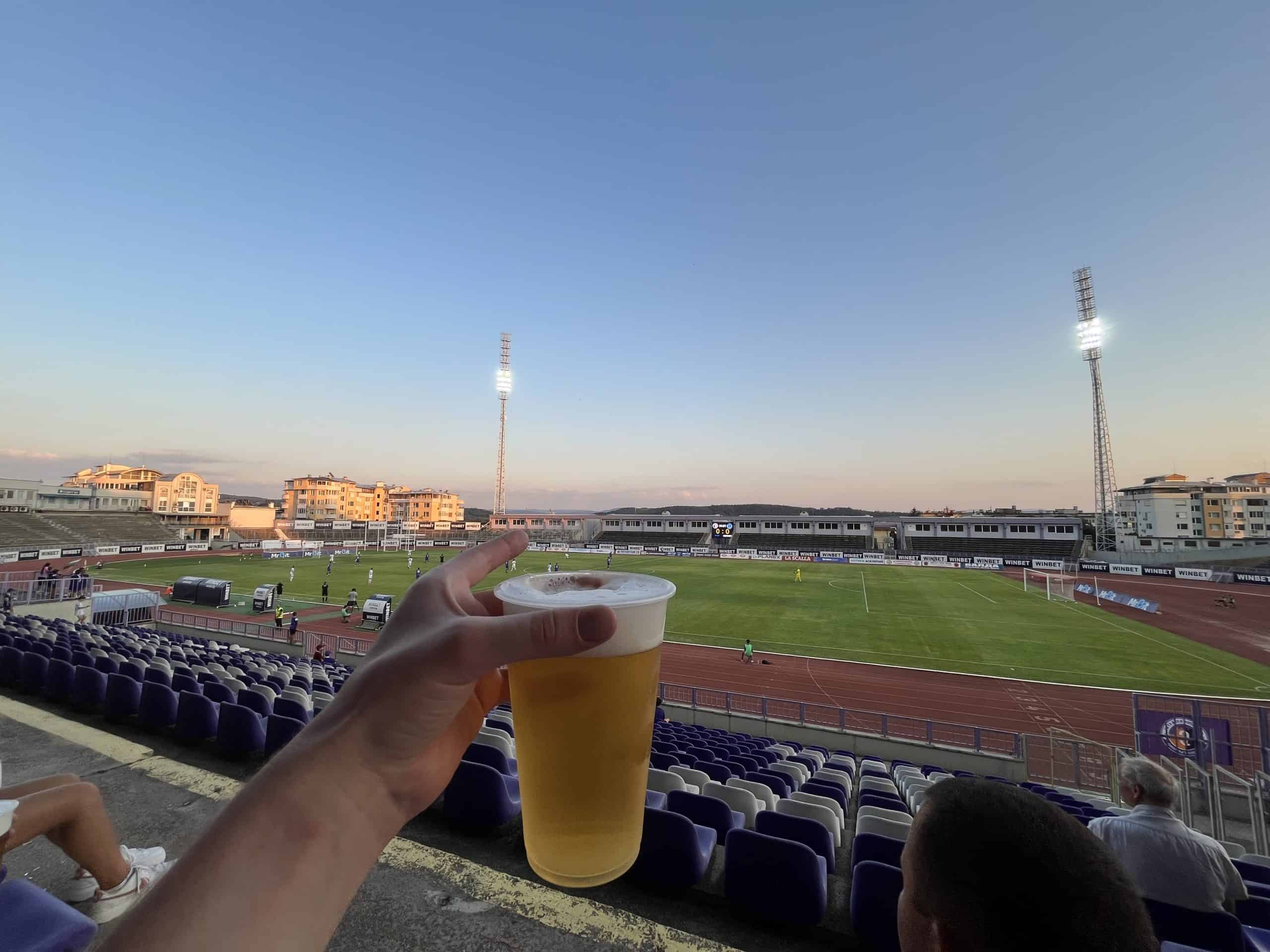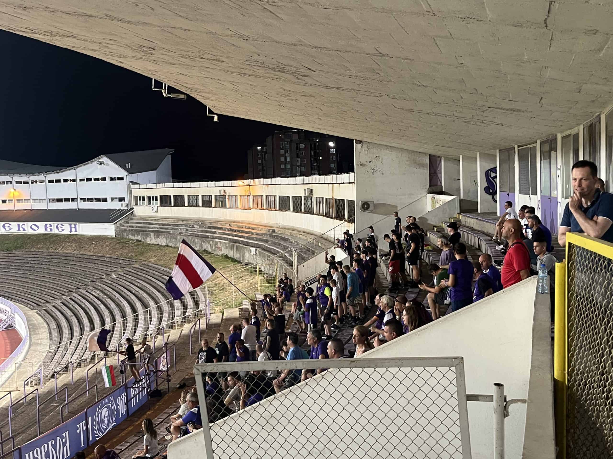 Als het donker begint te worden gaan de lichten aan en begint direct de elektriciteit te knetteren. Een hoogspanningslijn begeeft het en weet van geen ophouden. Dit gaat een helft lang zo door, met gevaar voor eigen leven. Bovenaan de tribune in een kleine inham staan een vader en twee zonen supporters te serveren. Er is één tap, waar je voor een euro bier krijgt. In de rust is de tap op en zijn er enkel nog cola, water en zonnebloempitten. Ook dat is Bulgarije.