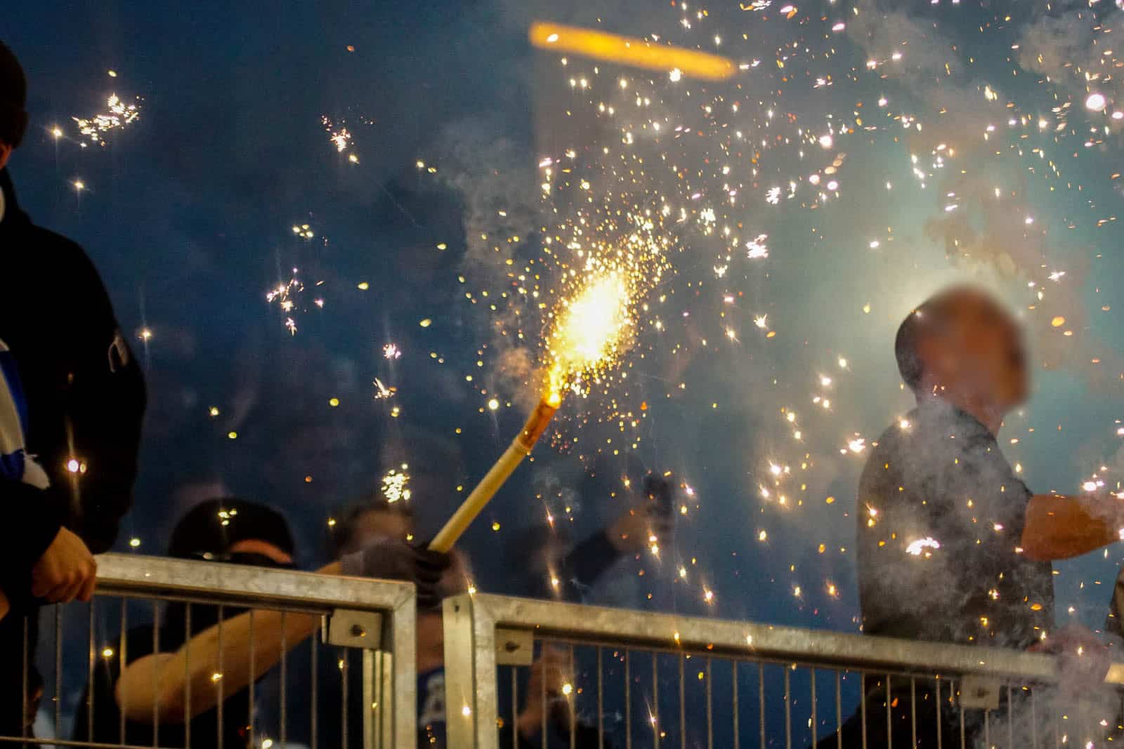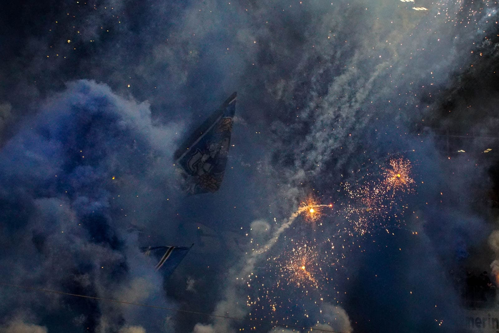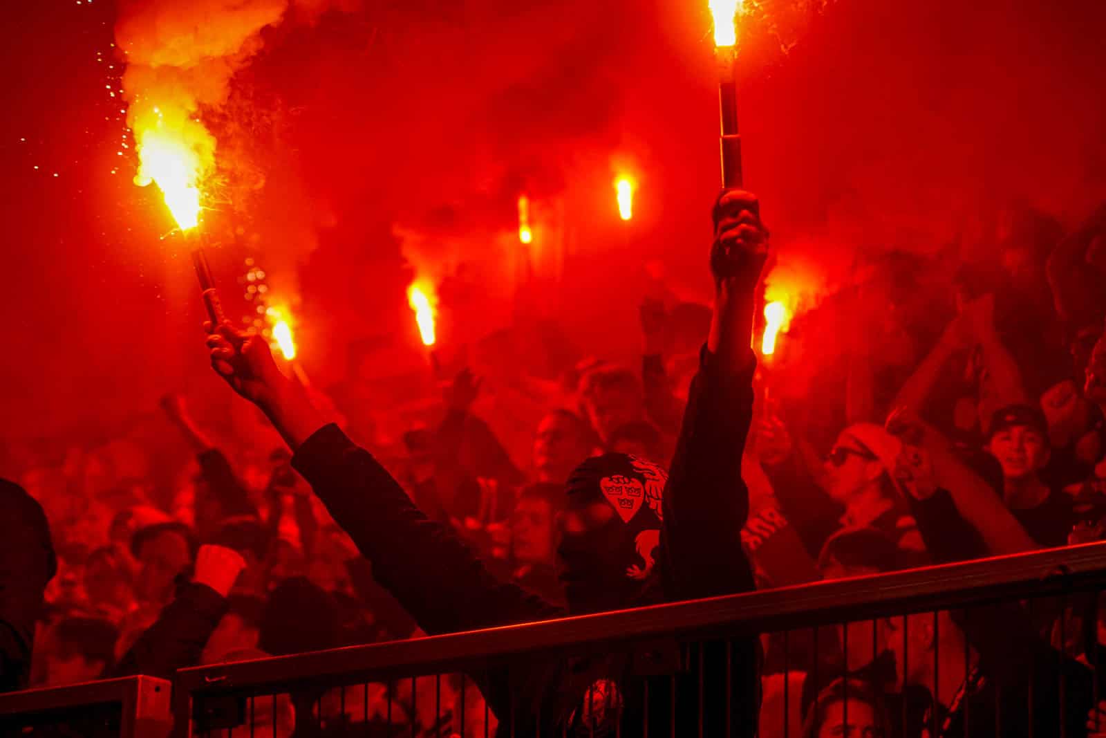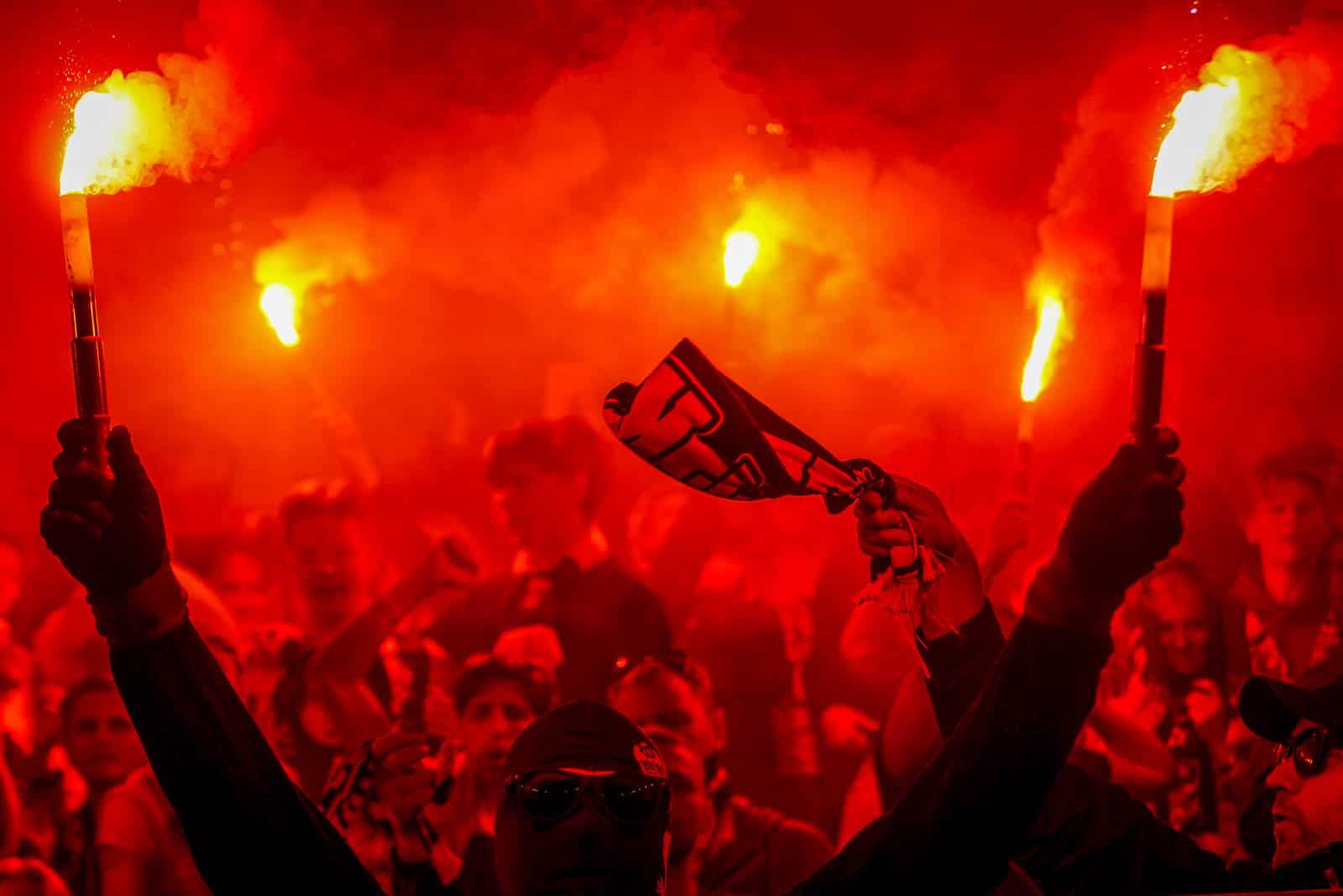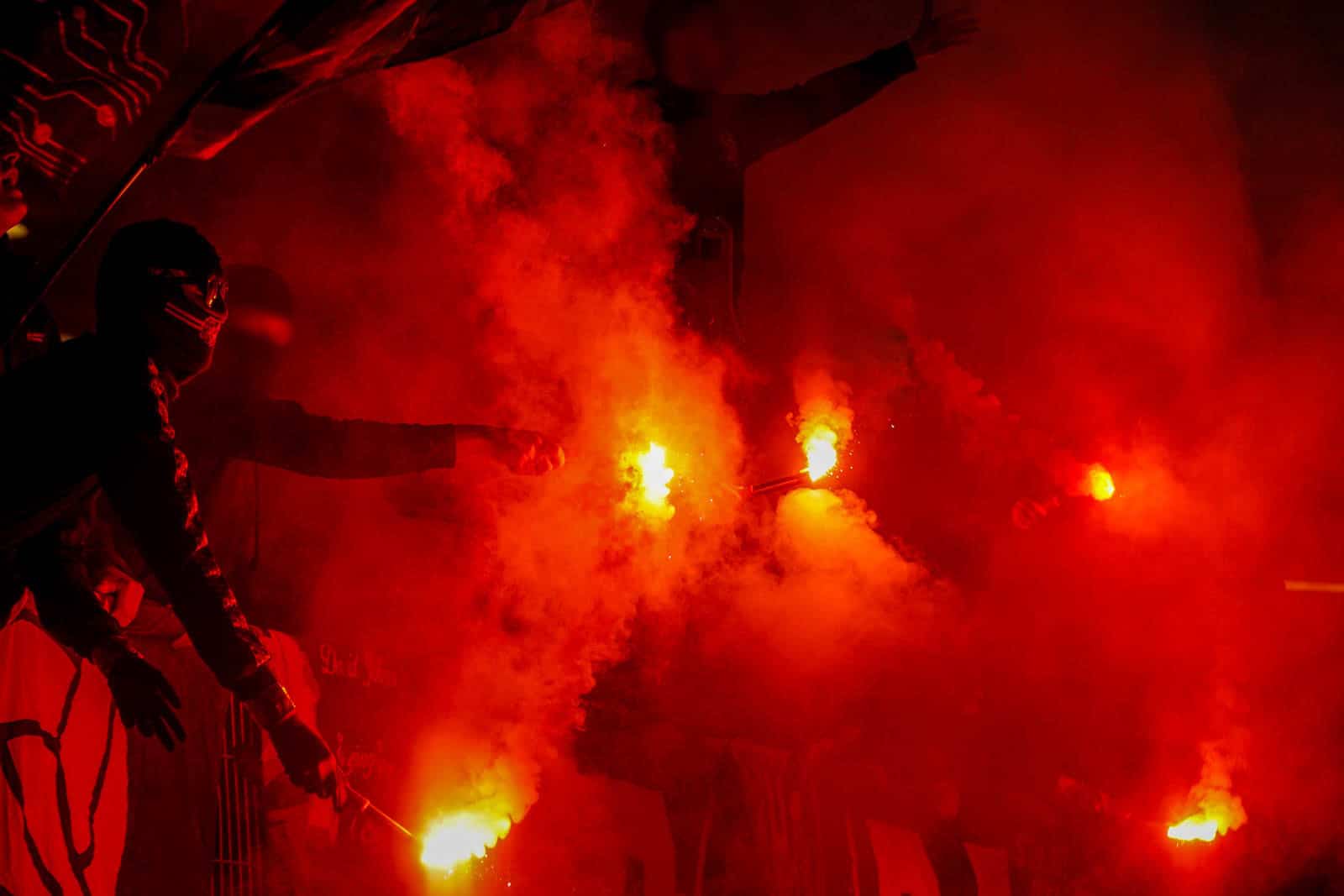Hierna is het tijd voor de kers op de taart. Waar het in het uitvak blijft bij een handjevol fakkels, gaat het er op het blauw-witte vak iets georganiseerder aan toe. Tegelijkertijd ontsteken tientallen supporters fakkels over beide zijdes verdeeld. Het zorgt voor een heerlijke rode vuurzee, passend bij een derby van dit formaat.