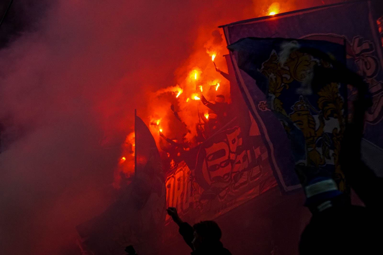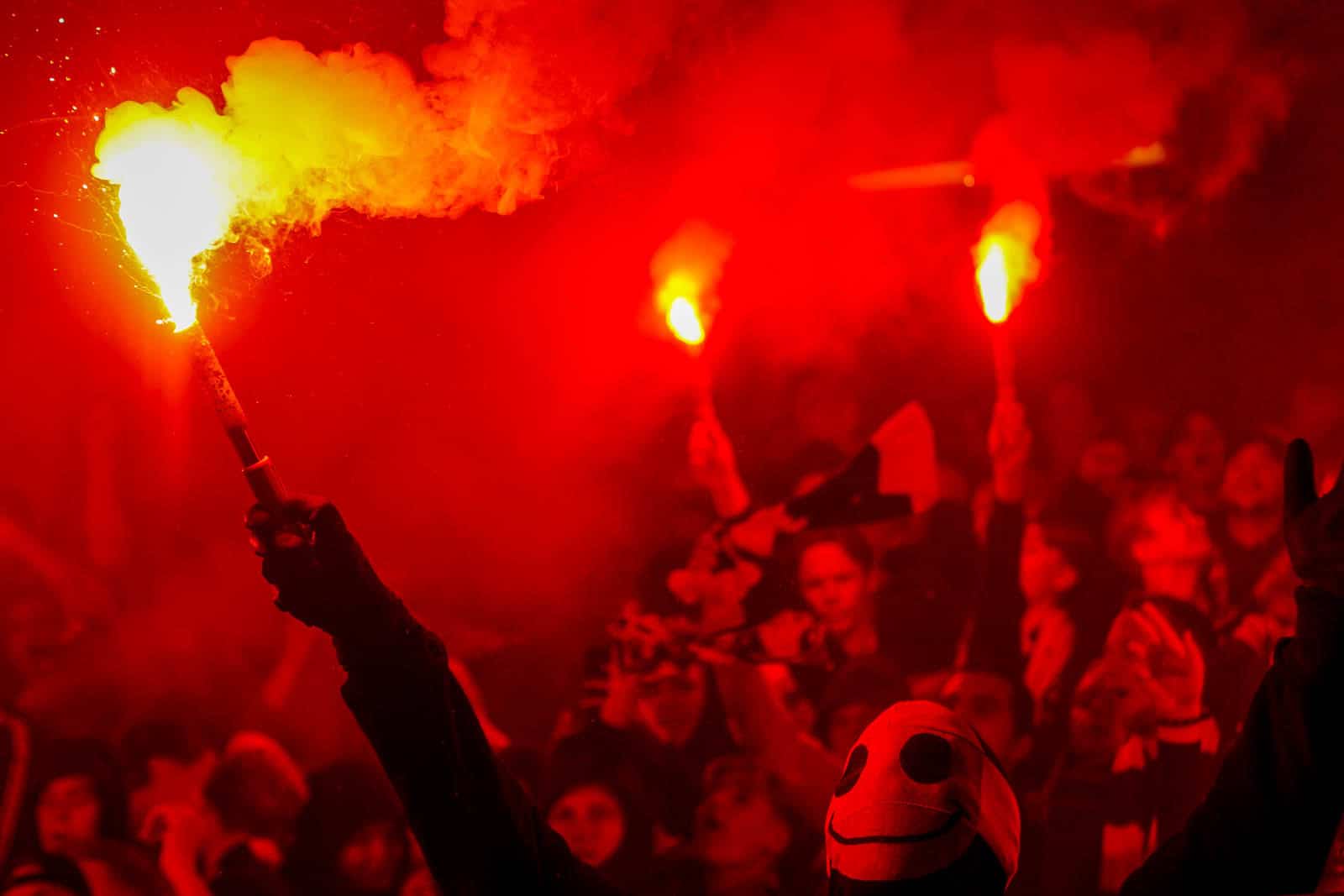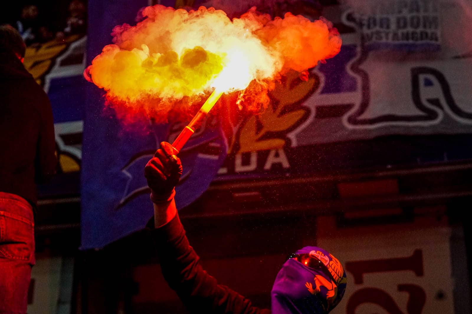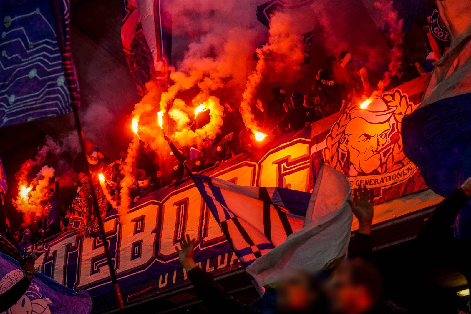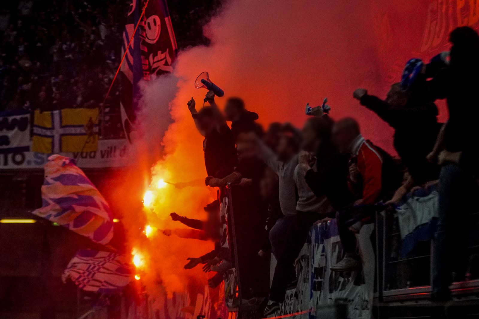 Hierna is het tijd voor de kers op de taart. Waar het in het uitvak blijft bij een handjevol fakkels, gaat het er op het blauw-witte vak iets georganiseerder aan toe. Tegelijkertijd ontsteken tientallen supporters fakkels over beide zijdes verdeeld. Het zorgt voor een heerlijke rode vuurzee, passend bij een derby van dit formaat.