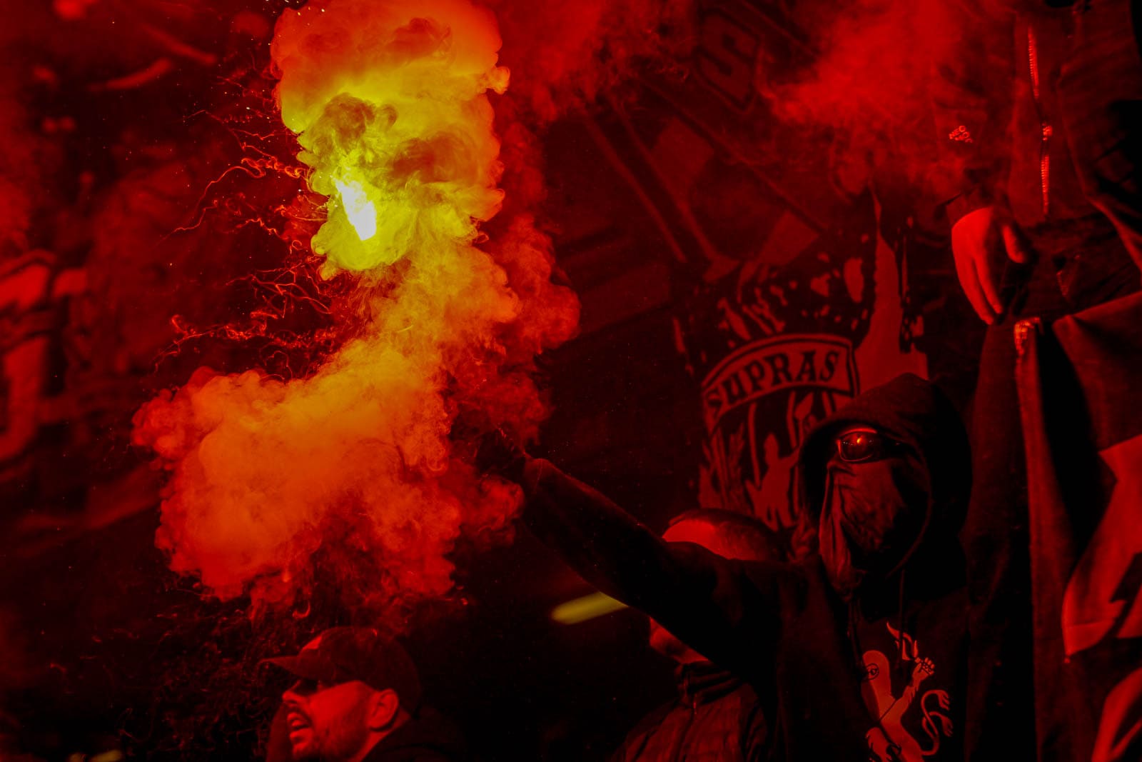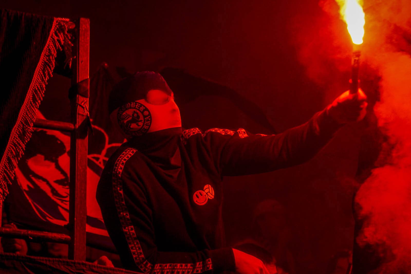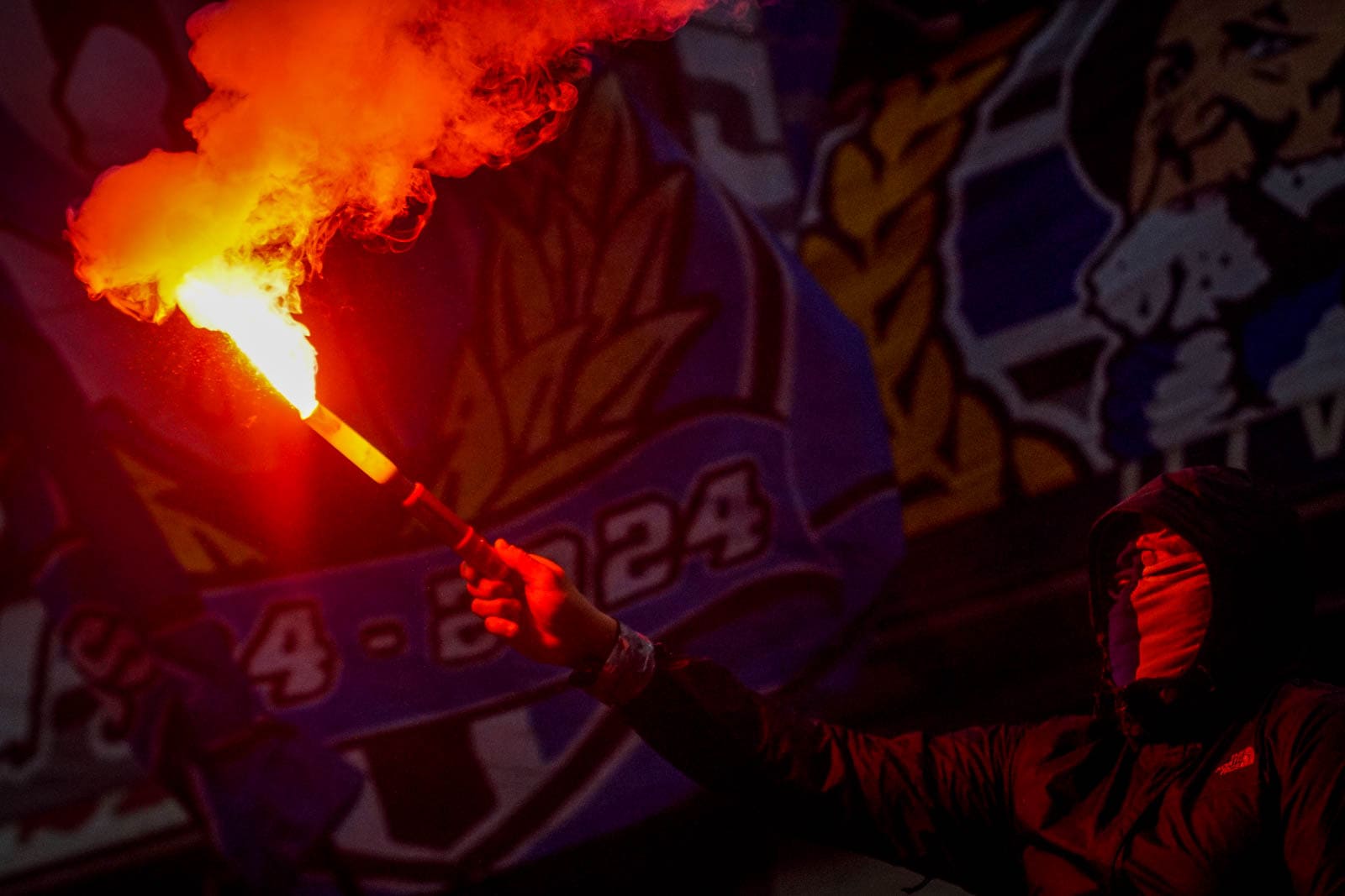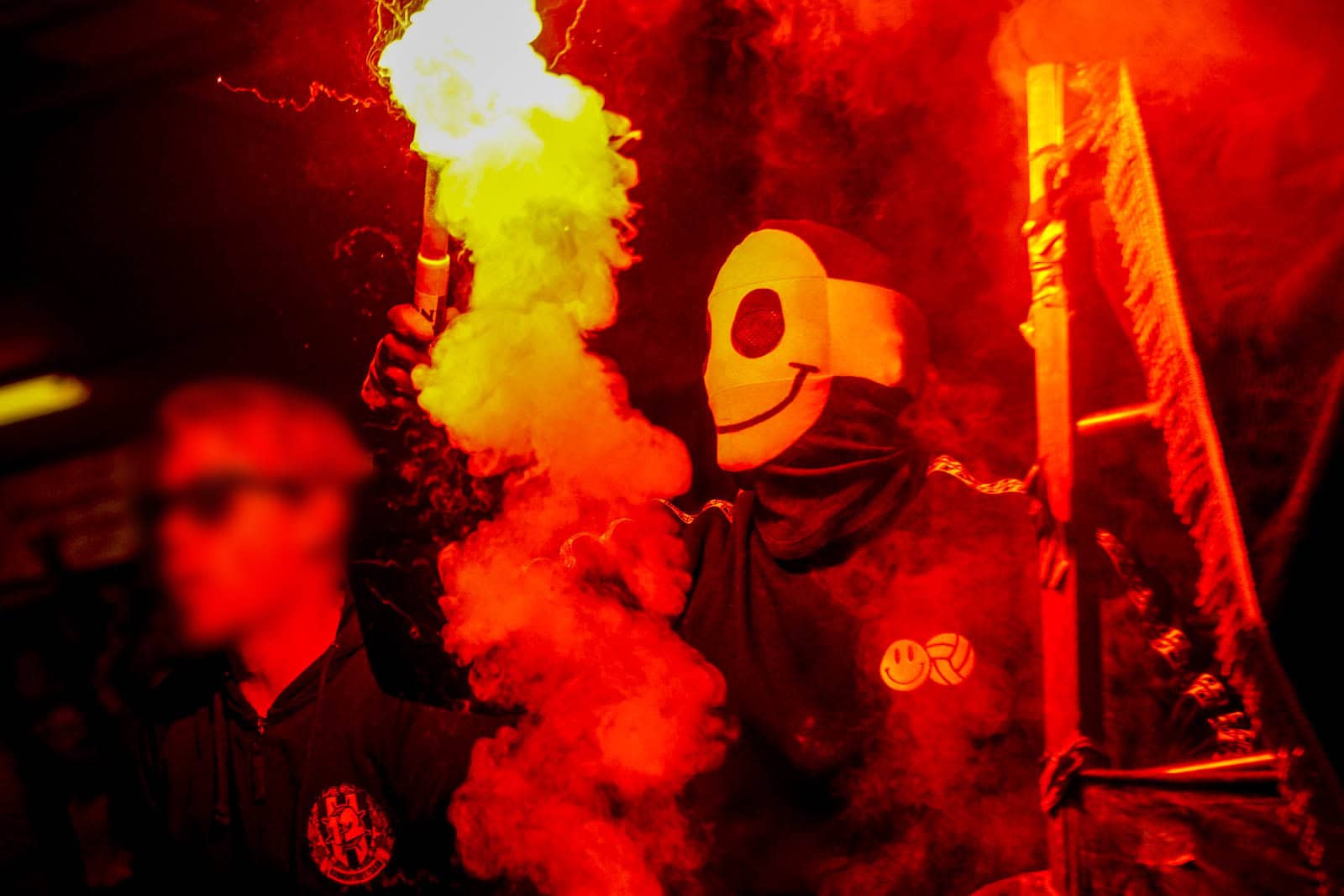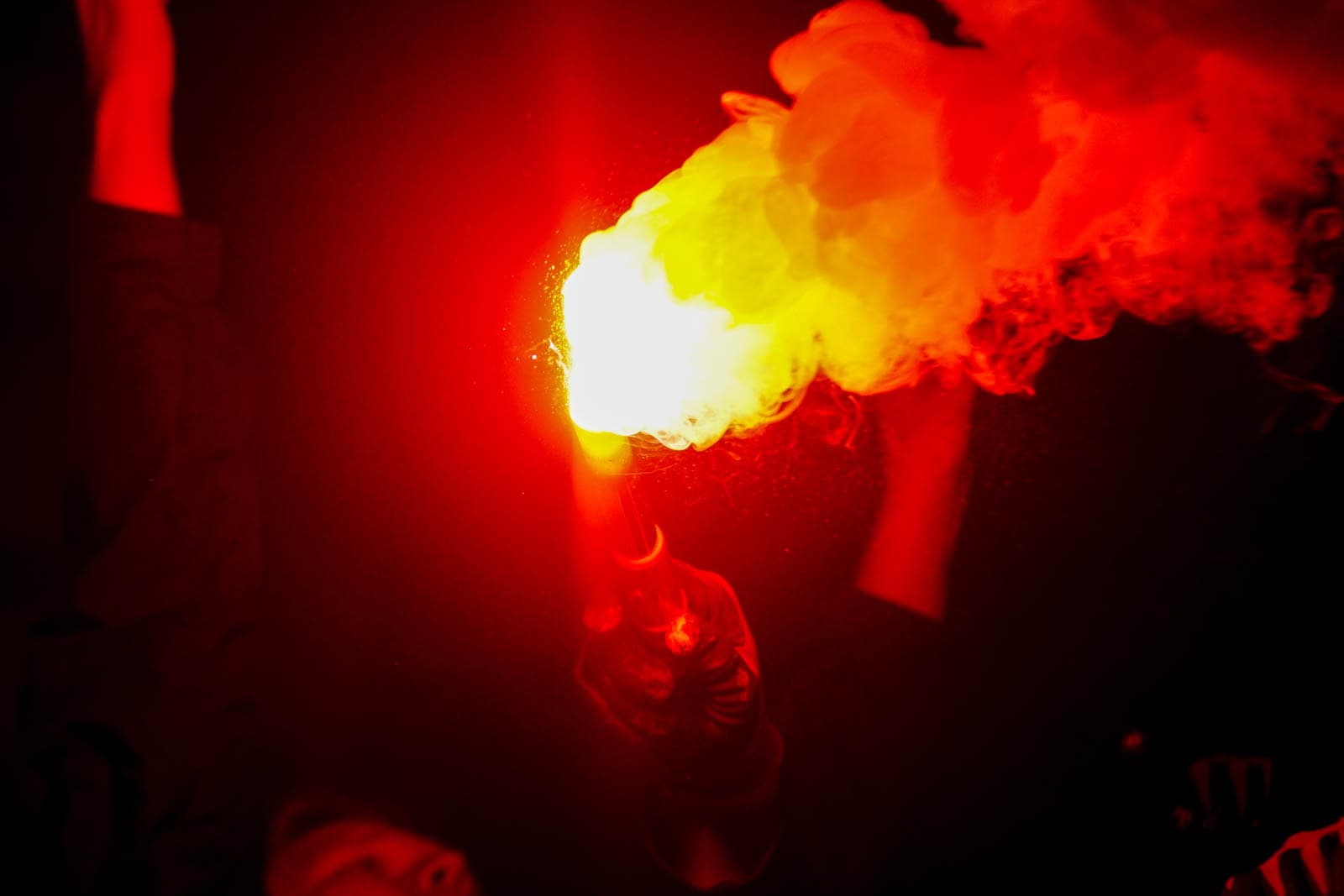 Hierna is het tijd voor de kers op de taart. Waar het in het uitvak blijft bij een handjevol fakkels, gaat het er op het blauw-witte vak iets georganiseerder aan toe. Tegelijkertijd ontsteken tientallen supporters fakkels over beide zijdes verdeeld. Het zorgt voor een heerlijke rode vuurzee, passend bij een derby van dit formaat.