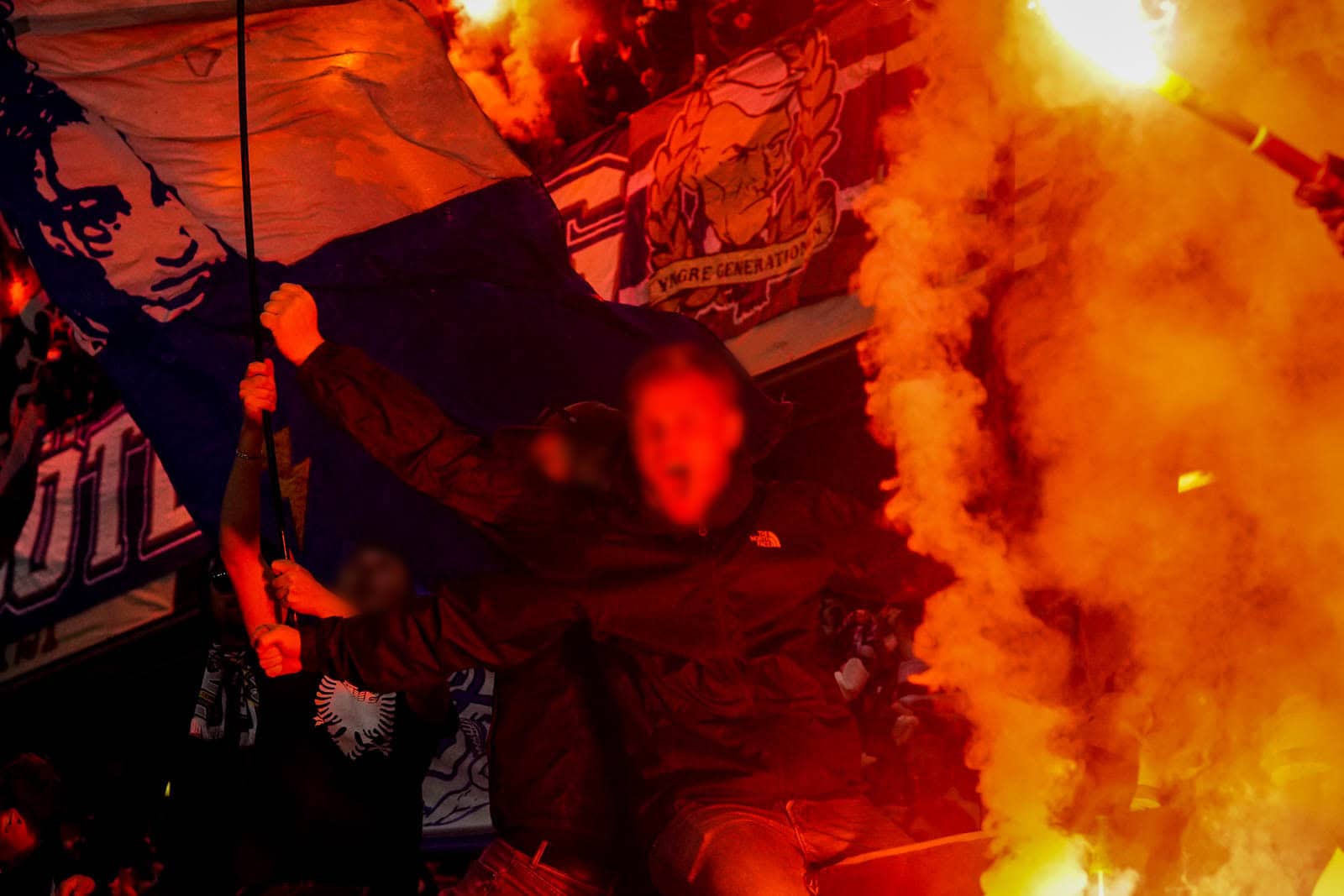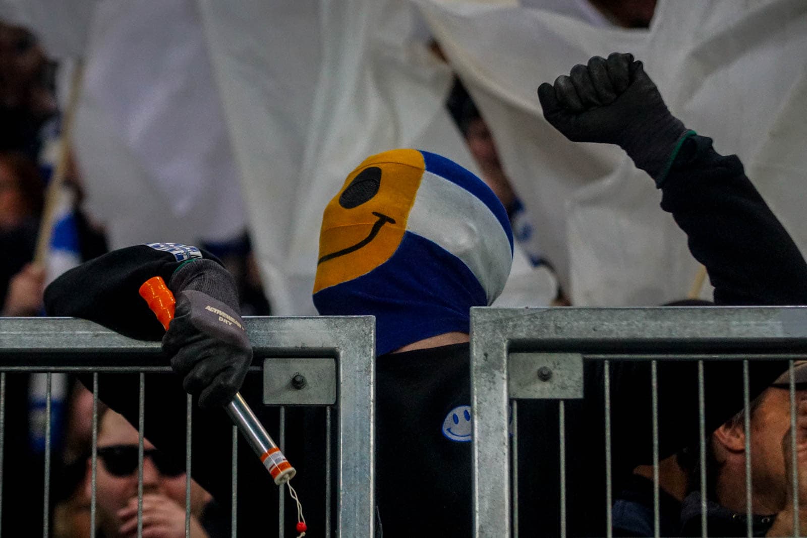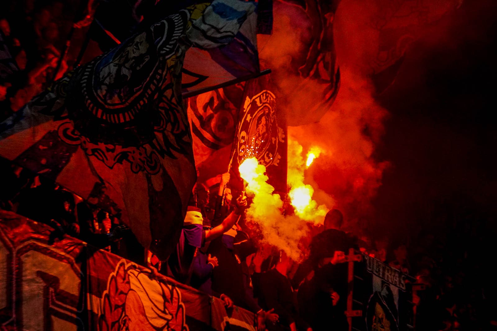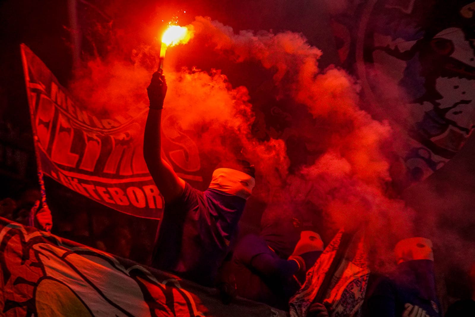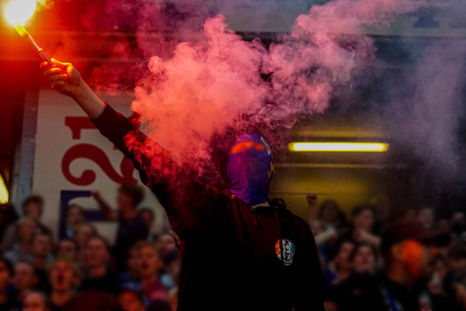Hierna is het tijd voor de kers op de taart. Waar het in het uitvak blijft bij een handjevol fakkels, gaat het er op het blauw-witte vak iets georganiseerder aan toe. Tegelijkertijd ontsteken tientallen supporters fakkels over beide zijdes verdeeld. Het zorgt voor een heerlijke rode vuurzee, passend bij een derby van dit formaat.
