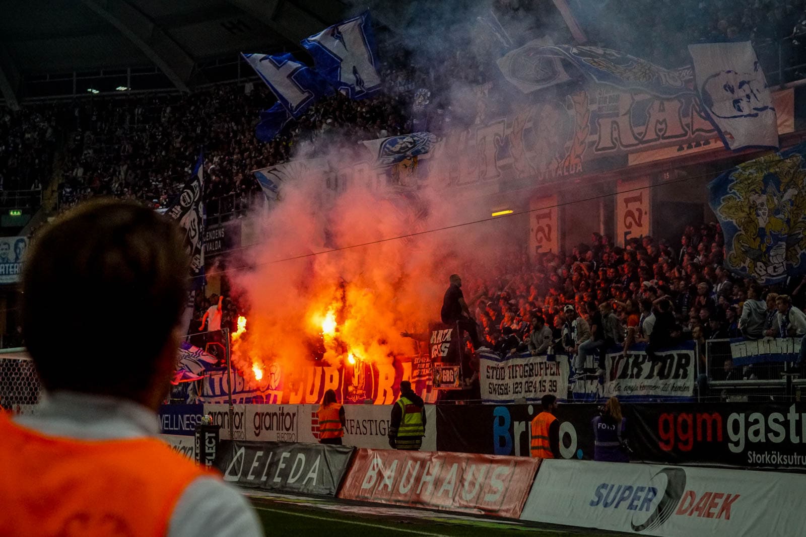 De tweede helft betekent ook een tweede pyroshow. Ditmaal is het het uitvak van GAIS dat de fakkels ontsteekt over de gehele tribune op beide zijdes. Bij de ultras van IFK wordt gekozen voor blauwe rook in combinatie met kleurrijke shooters. Ook dit geeft weer een heerlijk sterk beeld, waarbij de autoriteiten het vuurwerk rustig laten uitbranden om vervolgens met het voetbal te beginnen. Geen problemen en iedereen tevreden.