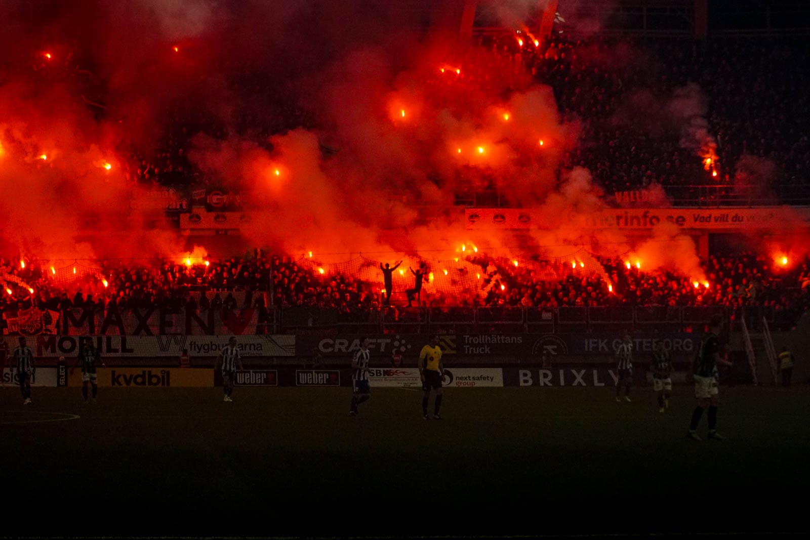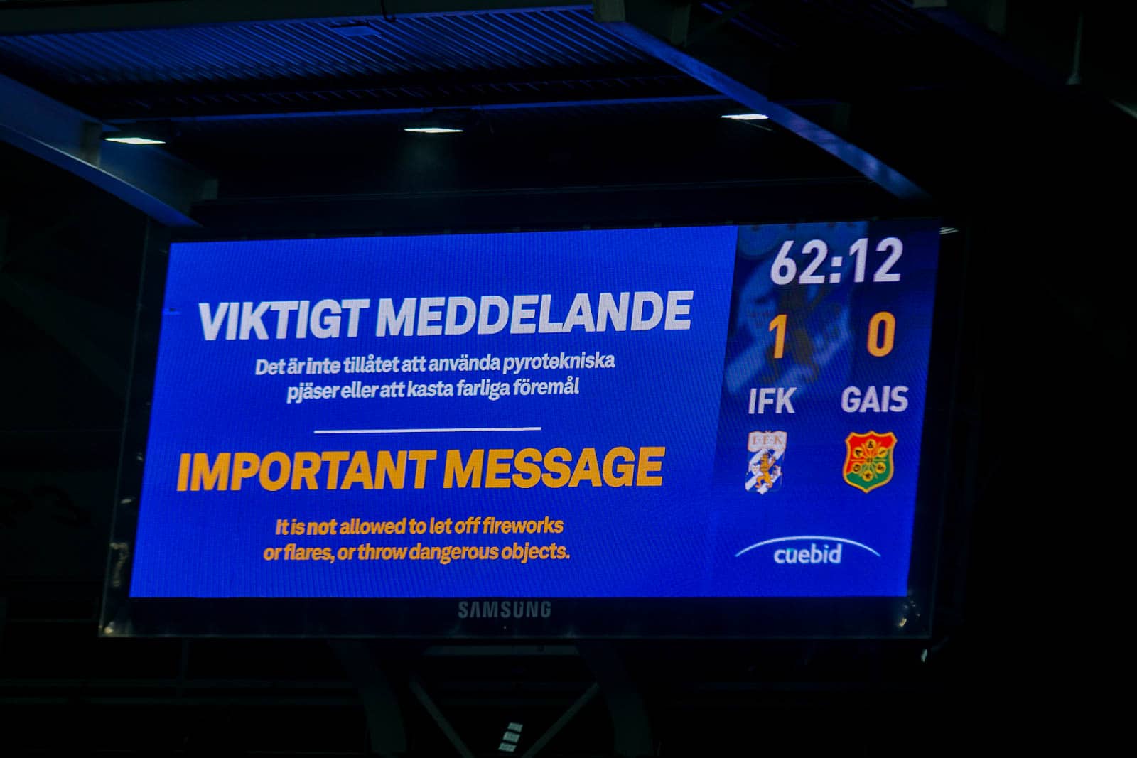 Waar even ervoor alles lijkt te kunnen is nu een grens bereikt en wordt de wedstrijd voor maar liefst 40 minuten stilgelegd. Ze zijn in Zweden geen fan van knalvuurwerk… Ondanks dit houden de supporters de sfeer er goed in en wordt er constant gezongen. Zeker door de IFK-supporters die de 1-0 voorsprong op het scorebord zien staan.