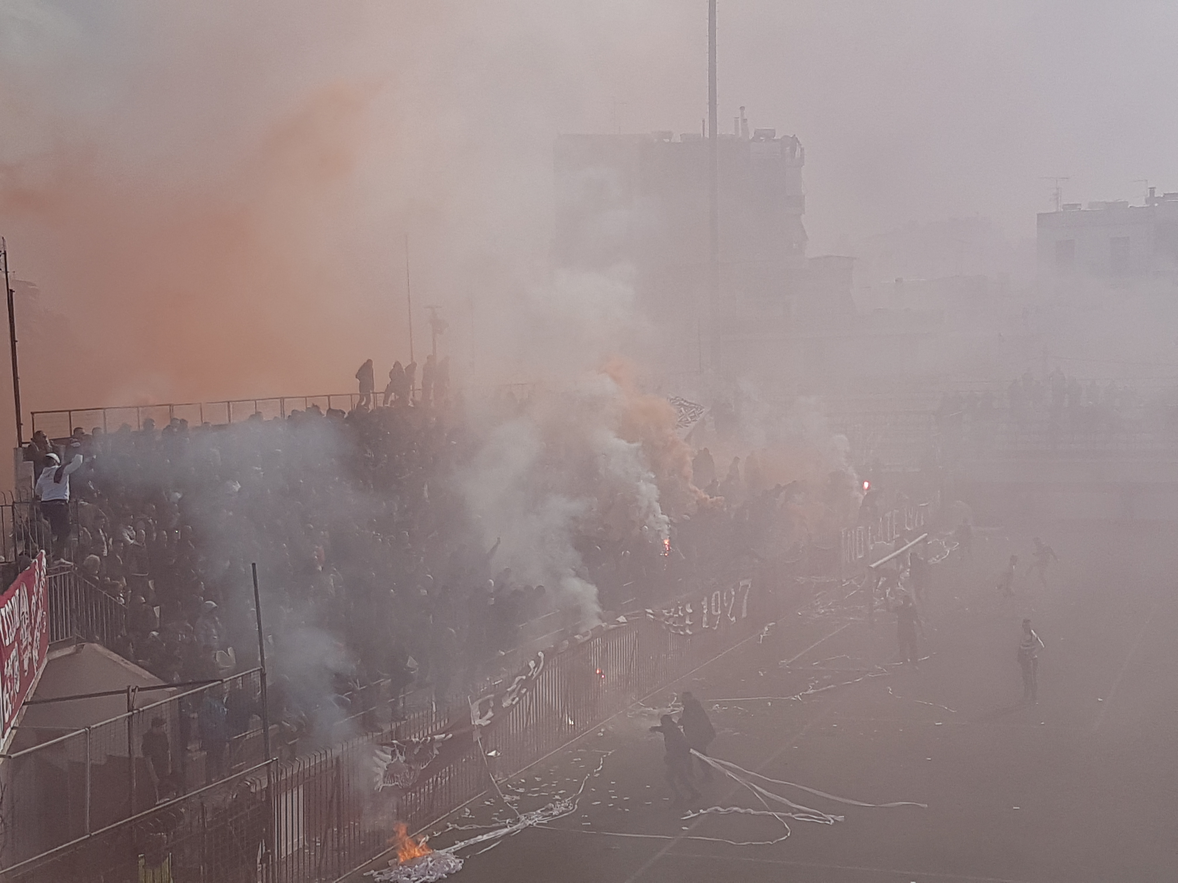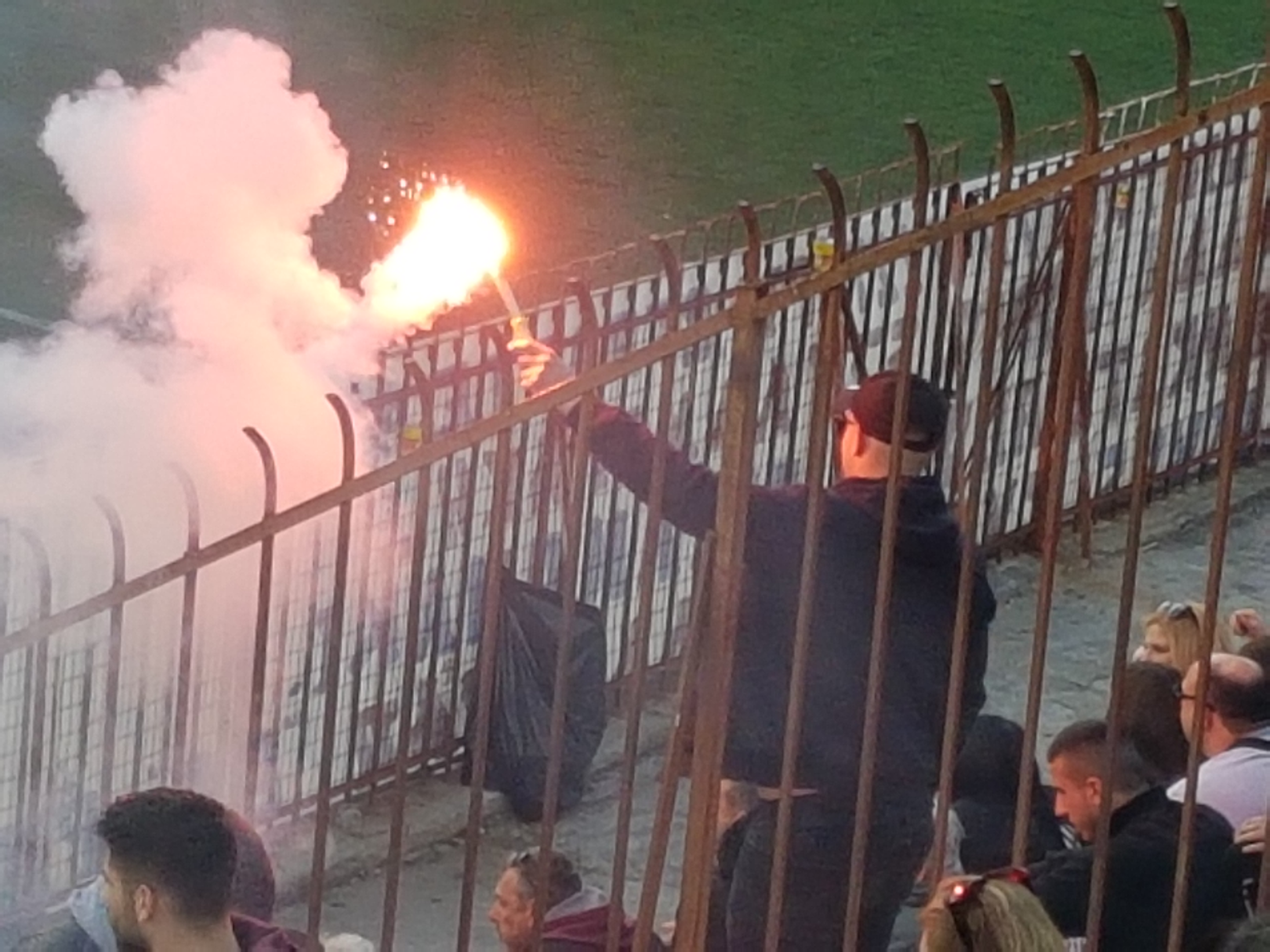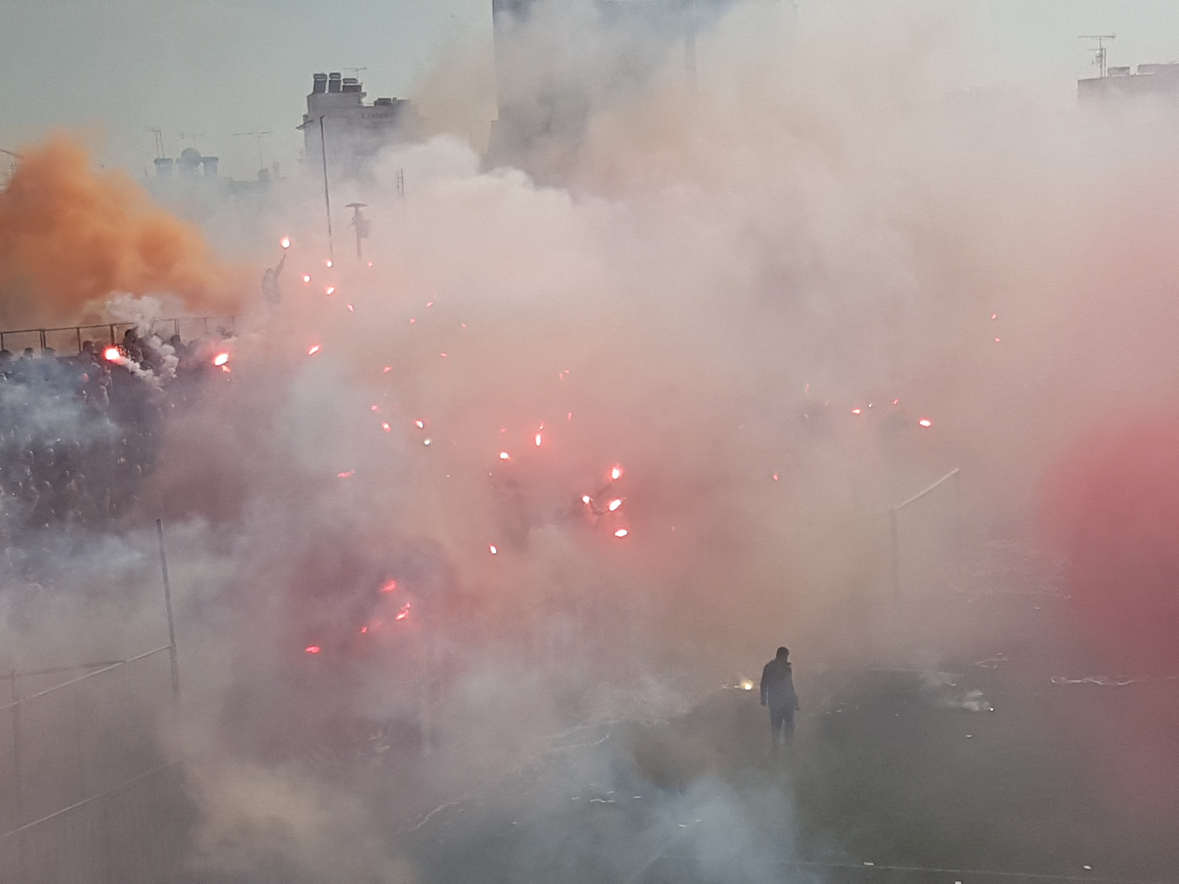 Dan neemt de 2e helft een aanvang. Erg lang duurt dat niet, want blijkbaar hebben de ultras nog wat rookpotten bewaard. Binnen de kortste keren zie ik door de rook de pyro niet meer. Het oponthoud duurt ditmaal niet zo lang en na een minuut of tien wordt de wedstrijd weer op gang geblazen door de leidsman. Na ruim een uur spelen stormen een mannetje of twintig ineens van de tribune. Enkele van hun kameraden worden achter het stadion door de ‘geliefde’ politie in het nauw gedreven. Er worden wat tikken uitgedeeld, maar korte tijd later keert de rust weer terug.