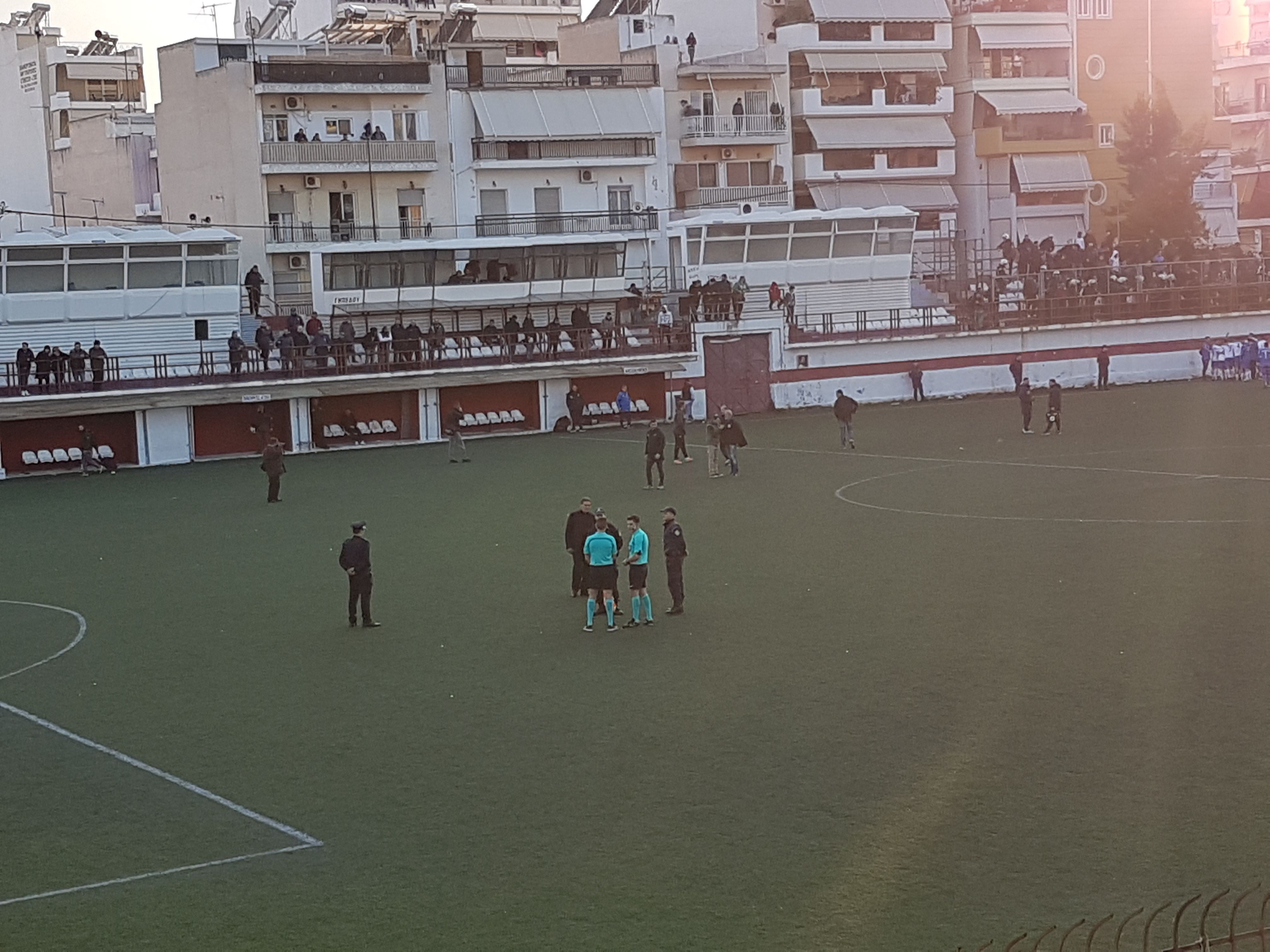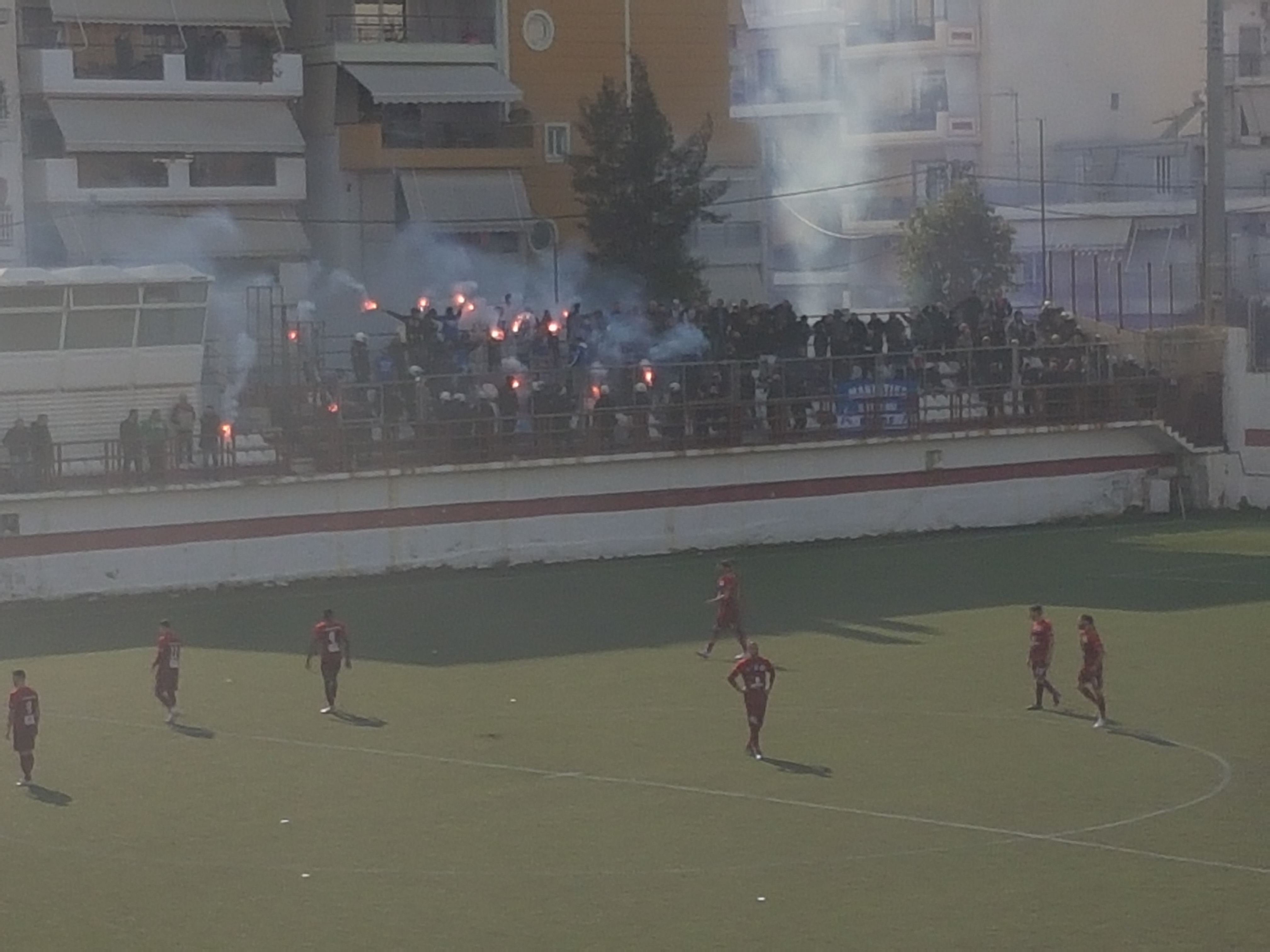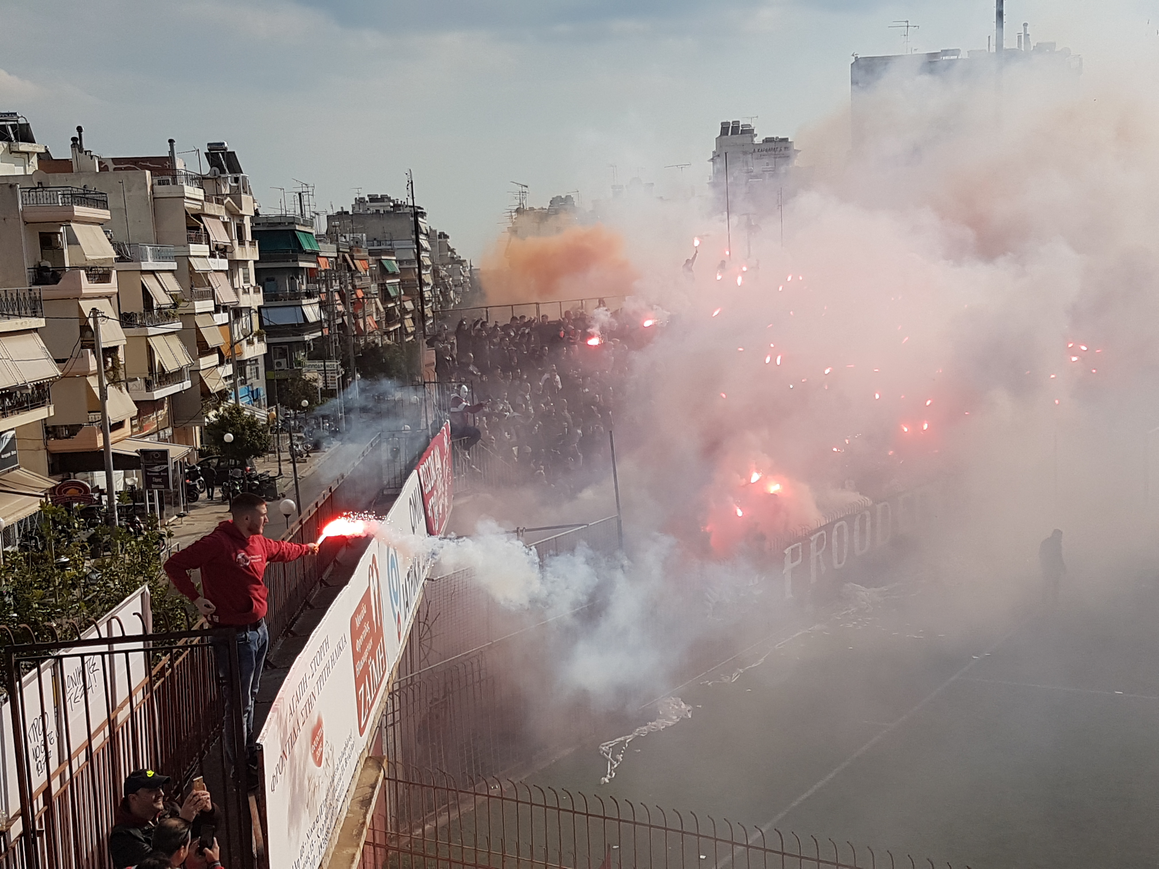 In de pauze zorgt een supporter van Proodeftiki voor het nodige vertier. Hij klimt namelijk de hekken over en rent gewapend met een fakkel het veld over om deze in het uitvak te gooien. Supporters van Ionikos zoeken snel een veiliger onderkomen en zo te zien wordt er niemand geraakt. Missie gedeeltelijk geslaagd dus. De supporter rent weer snel het veld en klimt terug de tribune op. Zo te zien maakt de politie zich over zijn actie niet heel erg druk.