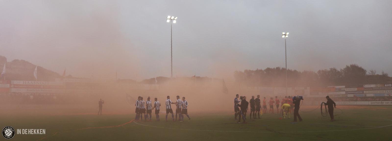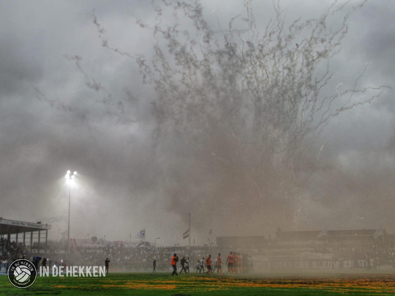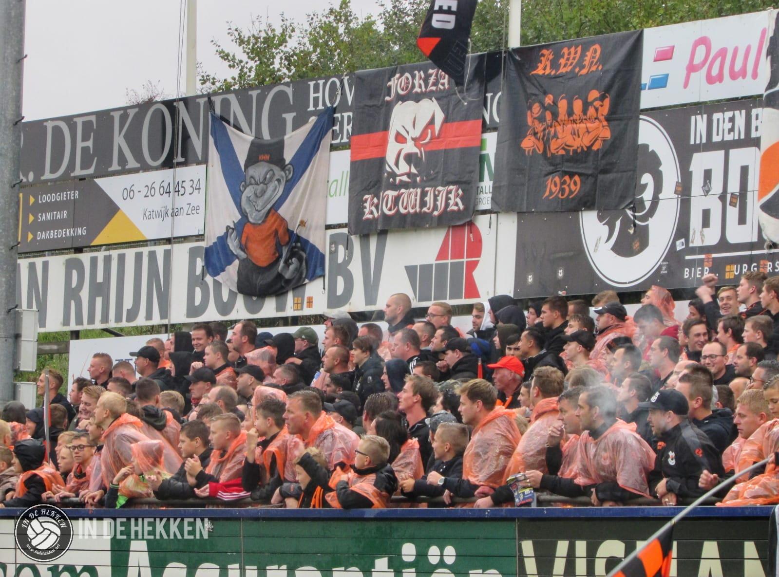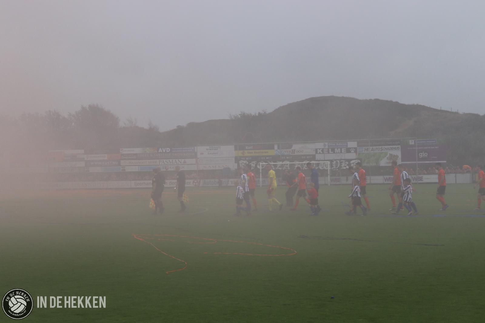 Zodra de spelers het veld opkomen, worden rookpotten ontstoken bij de fanatieke aanhang van VV Katwijk. Vele doeken zijn meegenomen en ook de nodige oranje poncho’s zijn aanwezig. Vlaggen wapperen en een aantal rookpotten eindigen net binnen het veld. De confettikanonnen gaan niet veel later af, zowel bij de thuis- als de uitsupporters. Echt een prachtig gezicht! Luid gezang van beide kanten verhoogde de sfeer. Tientallen vuurpijlen (en paraplu’s met middelvingers erop) gaan nog de lucht in, voordat er afgetrapt wordt. Alhoewel, na het opruimen van de blauwwitte en oranje confettislierten kan het pas écht beginnen. De spanning is om te snijden!