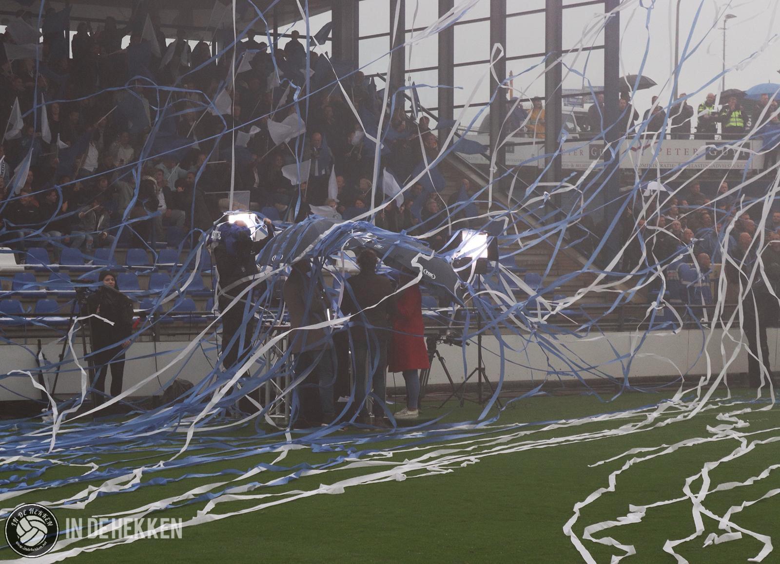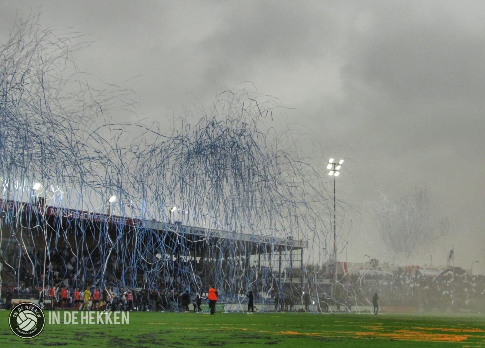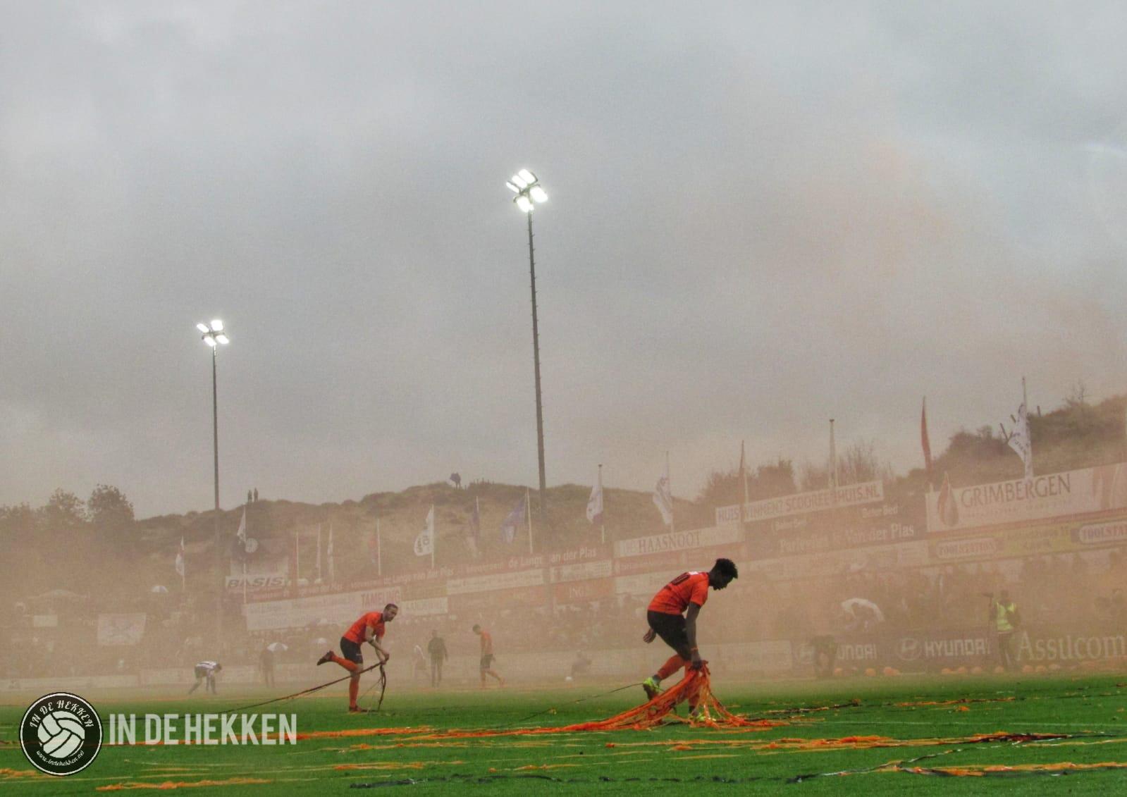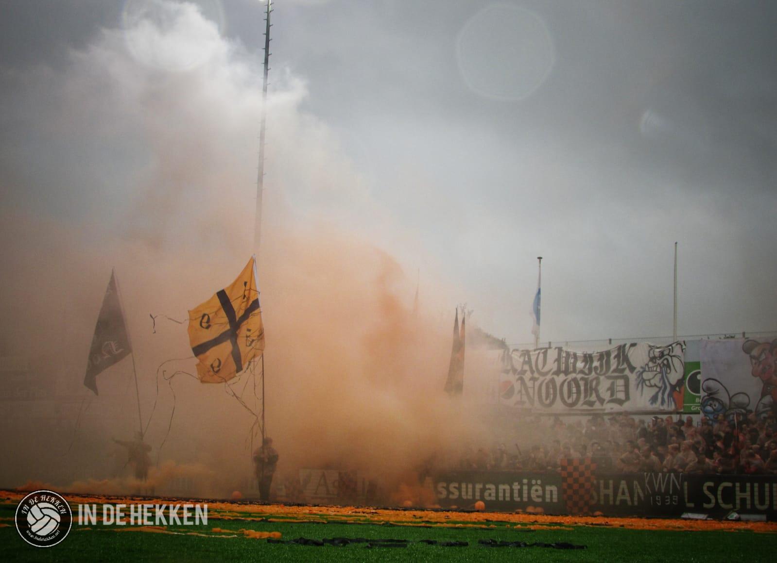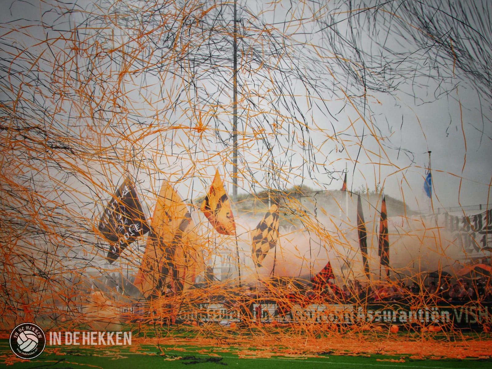 Zodra de spelers het veld opkomen, worden rookpotten ontstoken bij de fanatieke aanhang van VV Katwijk. Vele doeken zijn meegenomen en ook de nodige oranje poncho’s zijn aanwezig. Vlaggen wapperen en een aantal rookpotten eindigen net binnen het veld. De confettikanonnen gaan niet veel later af, zowel bij de thuis- als de uitsupporters. Echt een prachtig gezicht! Luid gezang van beide kanten verhoogde de sfeer. Tientallen vuurpijlen (en paraplu’s met middelvingers erop) gaan nog de lucht in, voordat er afgetrapt wordt. Alhoewel, na het opruimen van de blauwwitte en oranje confettislierten kan het pas écht beginnen. De spanning is om te snijden!