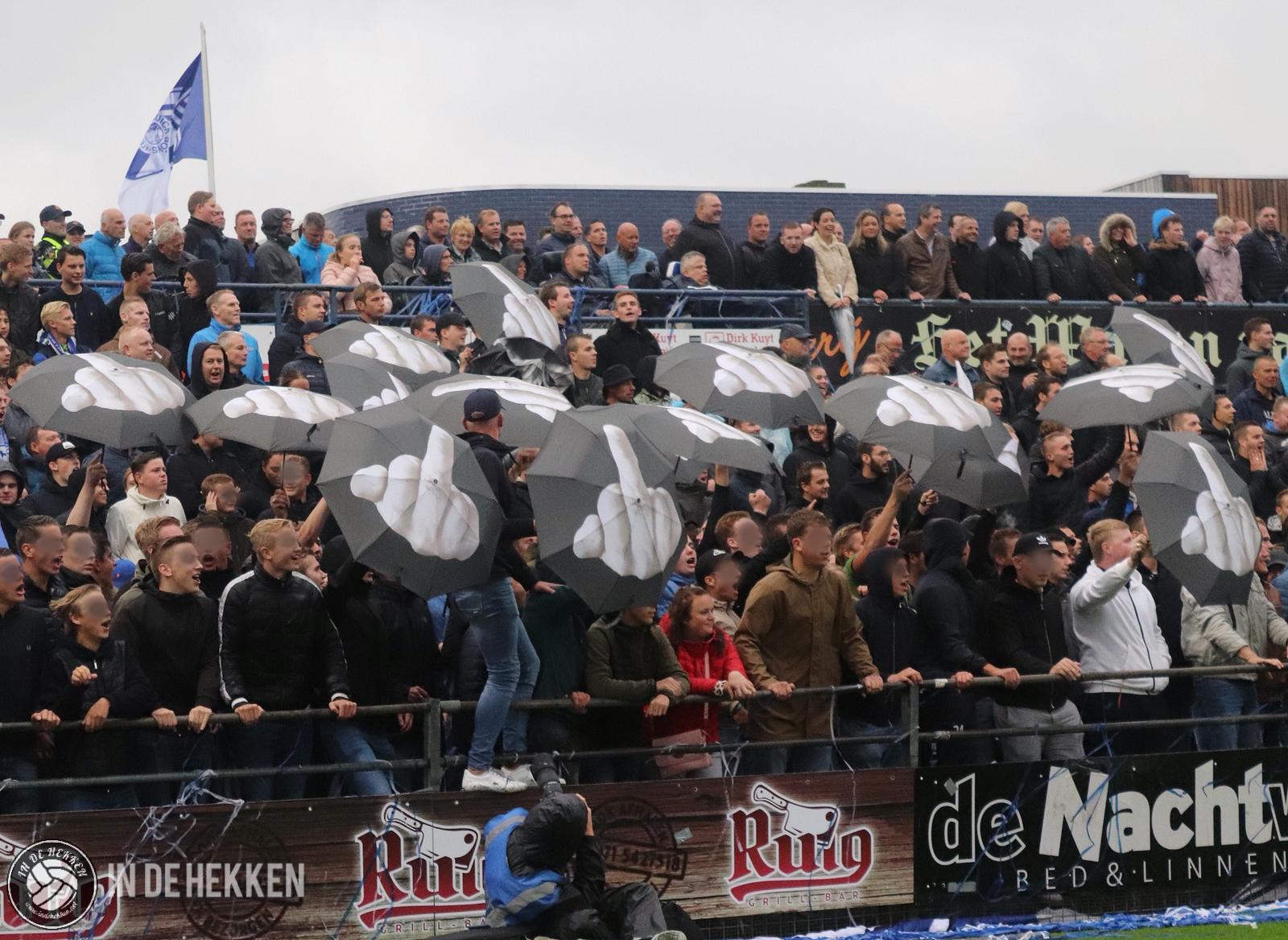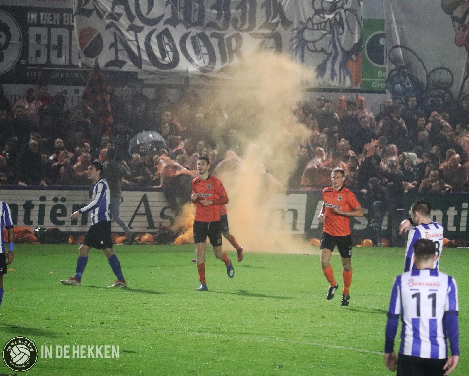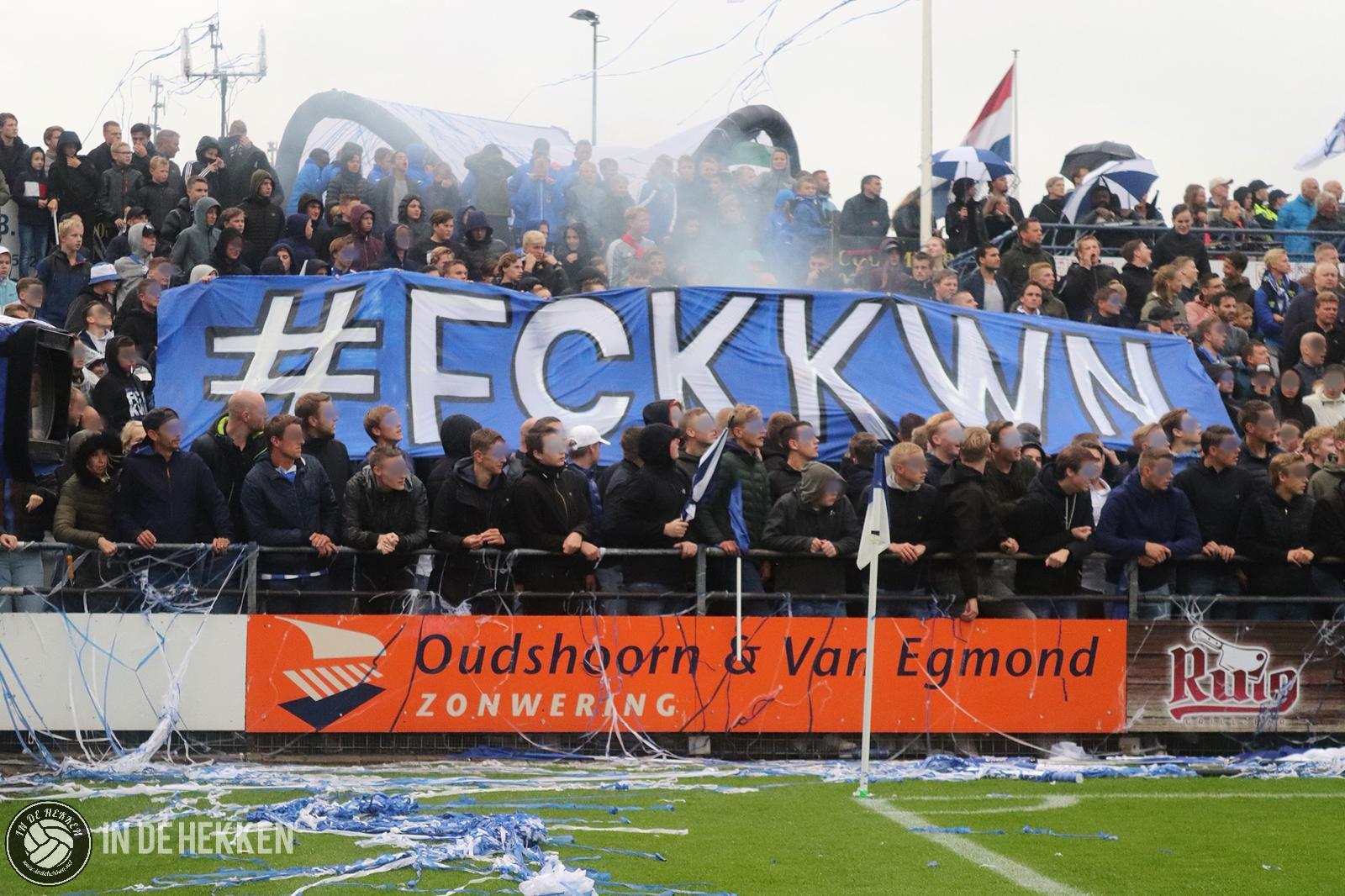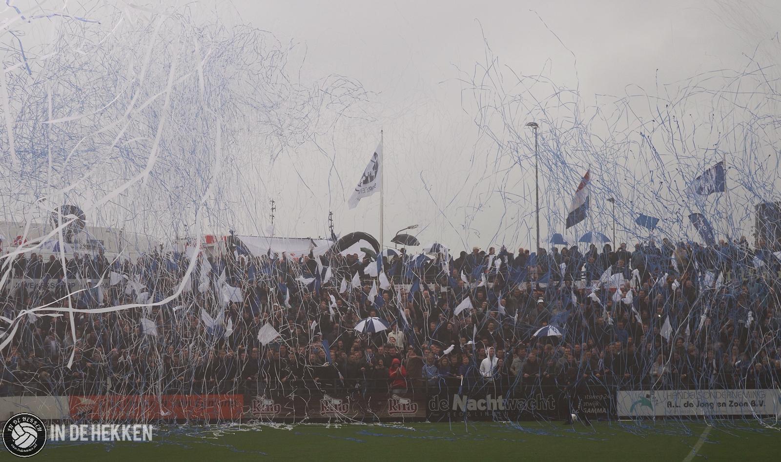 Zodra de spelers het veld opkomen, worden rookpotten ontstoken bij de fanatieke aanhang van VV Katwijk. Vele doeken zijn meegenomen en ook de nodige oranje poncho’s zijn aanwezig. Vlaggen wapperen en een aantal rookpotten eindigen net binnen het veld. De confettikanonnen gaan niet veel later af, zowel bij de thuis- als de uitsupporters. Echt een prachtig gezicht! Luid gezang van beide kanten verhoogde de sfeer. Tientallen vuurpijlen (en paraplu’s met middelvingers erop) gaan nog de lucht in, voordat er afgetrapt wordt. Alhoewel, na het opruimen van de blauwwitte en oranje confettislierten kan het pas écht beginnen. De spanning is om te snijden!