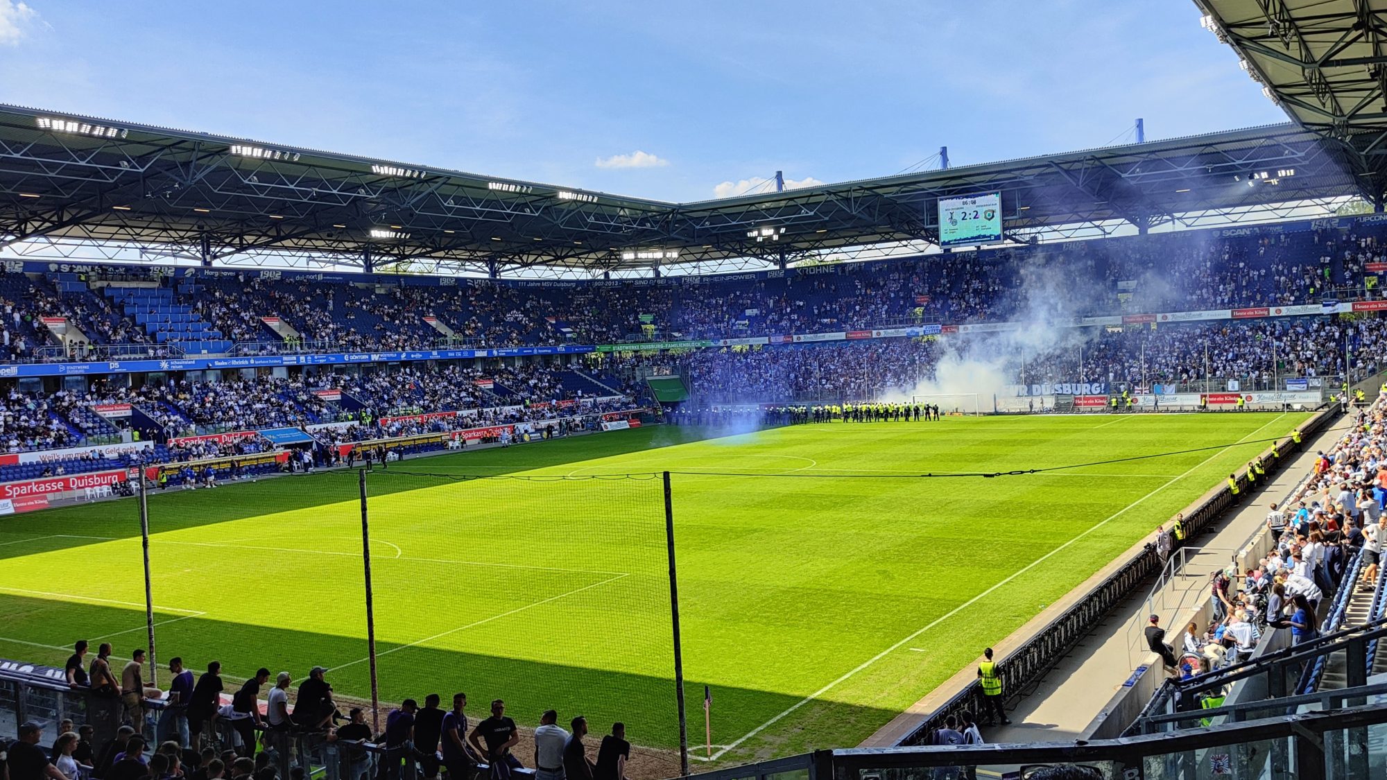 In de tweede helft is het sfeervolle uitvak enigszins beduusd als Duisburg plots op voorsprong komt, al is dit van korte duur voor de 2-2 alweer valt. Het doek Ihr seid ‘ne Schande für Duisburg was even weggehaald, maar als het opnieuw tevoorschijn komt verandert Duisburg in Sodom en Gomorra. Rond de 85ste minuut openen supporters een hek en bestormen ze het veld, waarbij de gehele reclameboarding wordt omgegooid. Ze smijten met vuurwerk en rookbommen, terwijl de politiemacht moet rennen om de stewards te hulp te schieten. Wanneer de groep is omsingeld proberen gemaskerde supporters nog uit te breken, maar door traangas en pepperspray worden ze terug het vak in gedreven.
