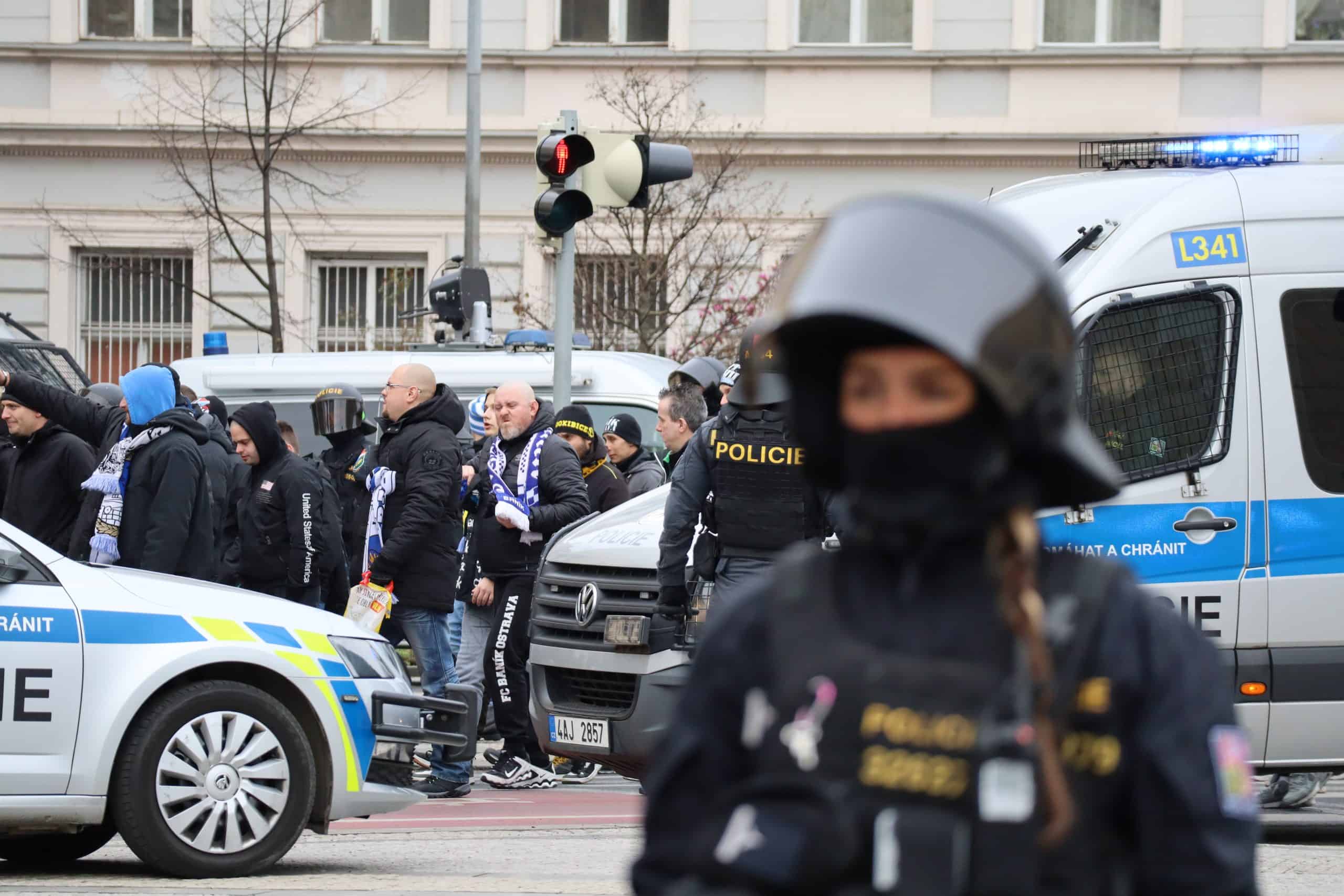 Als we de tram uitstappen bij het Generali stadion ofwel het stadion van Sparta Praag zien we dat er al een grote politiemacht op de been is. Verderop in de straat zien we dat de politie al meerdere wegen heeft afgesloten. Naar alle waarschijnlijkheid zullen de Ostrava supporters elk moment aankomen. Als we het van wat dichterbij gaan bekijken zien we de aankomst van Ostrava bij het tramstation en onder grote politiebegeleiding lopen ze naar het stadion. Naast de supporters van Ostrava zijn ook hun vrienden van GKS Katowice en Sparatk Trnava aanwezig. Dit belooft een vurige middag te worden.