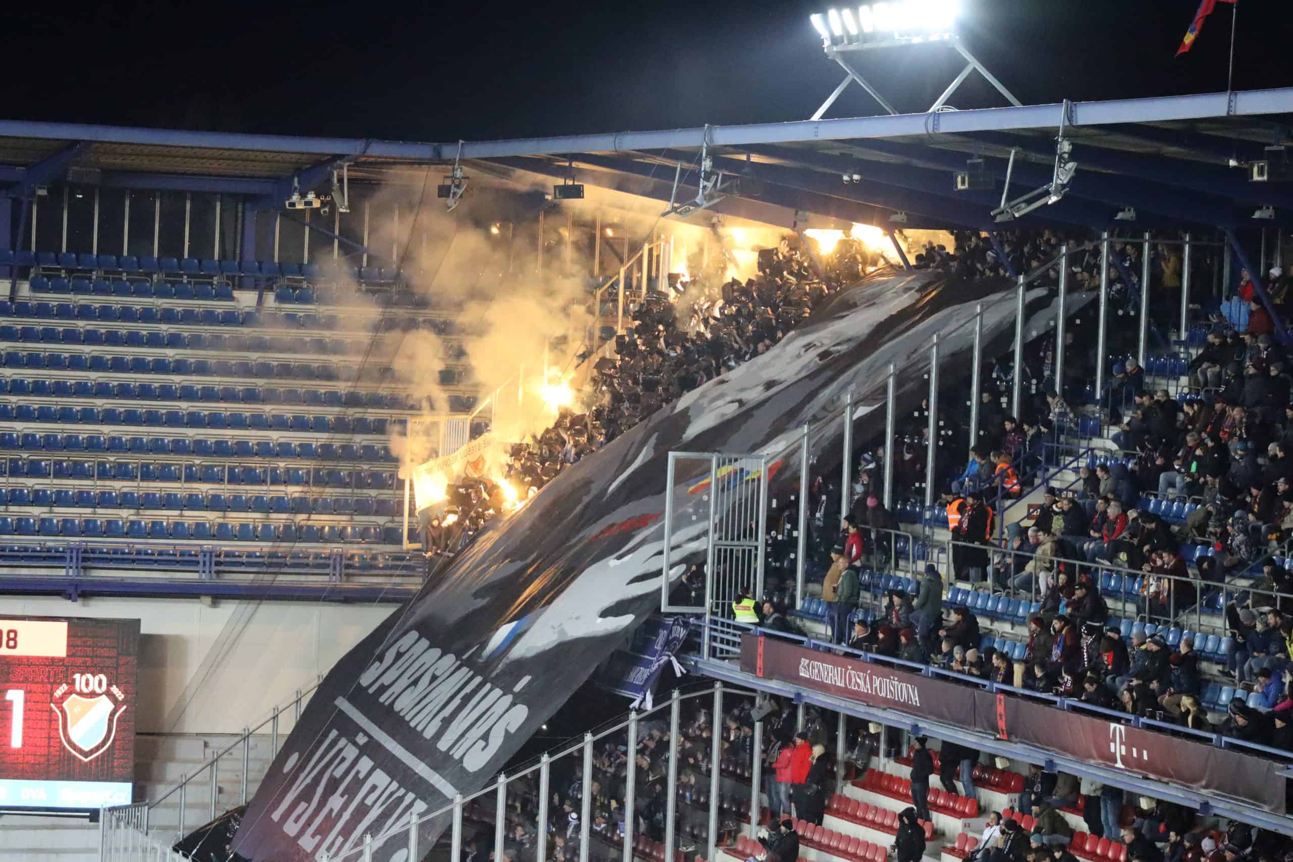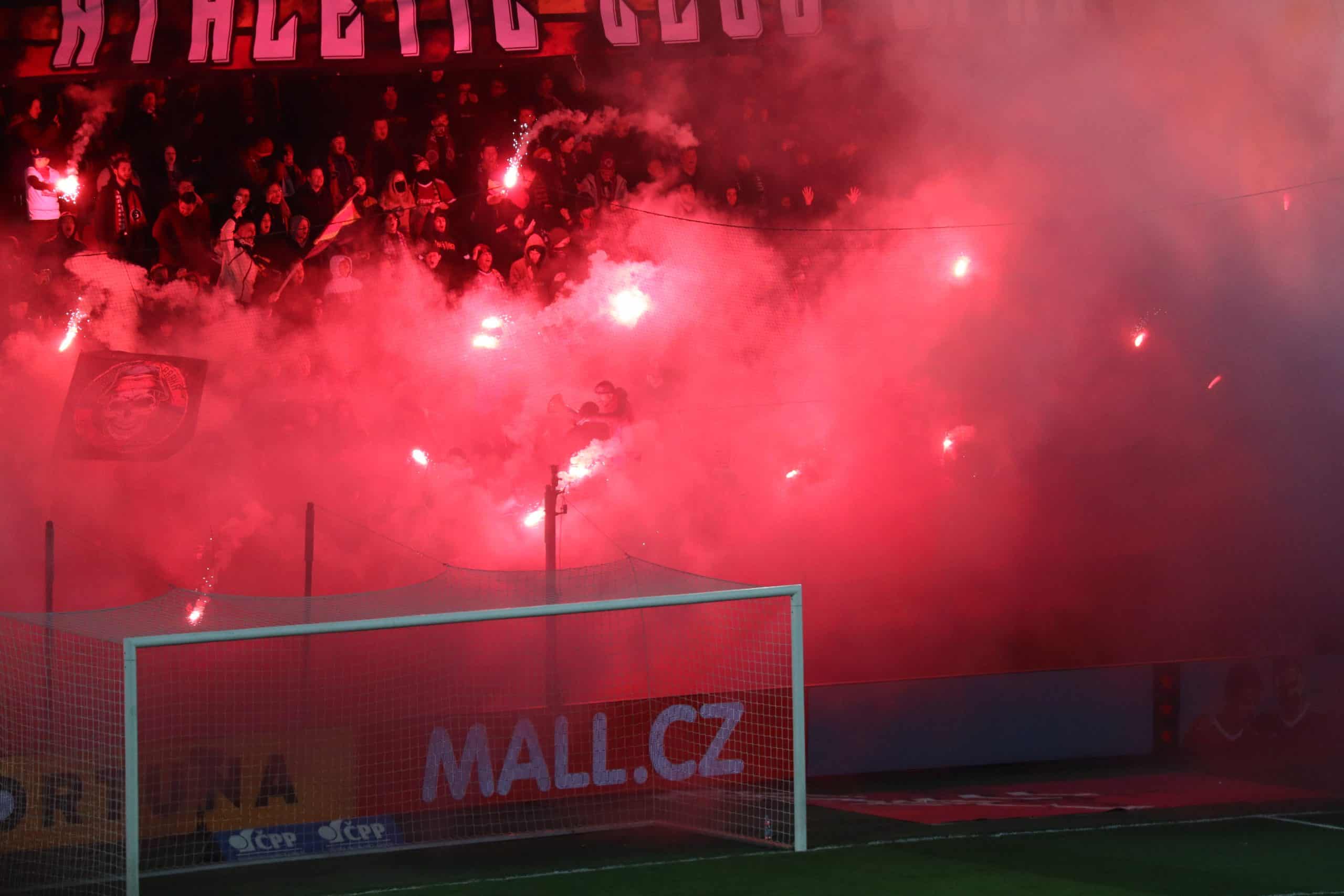Om 19:00 wordt er afgetrapt in de Generali Arena. Sparta Praag begint goed aan de wedstrijd maar het is Banik dat al binnen 8 minuten de 0-1 maakt. Het uitvak viert groot feest en spontaan wordt er al een strobo afgestoken. Helaas voor Banik blijft de voorsprong niet lang staan: Sparta komt in de 15e minuut al op gelijke hoogte te staan en nog geen paar minuten later zijn we getuige van de eerste tifo van de dag. Ook is hierbij al wat vuurwerk te zien, maar nog zeker niet de hoeveelheden die we verwachtten. Vlak voor rust weet Sparta op voorsprong te komen wat gezien het wedstrijdbeeld niet onterecht is.