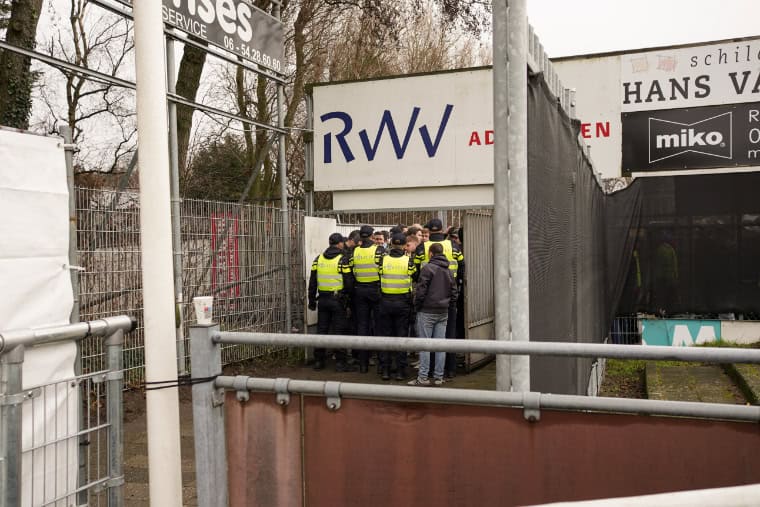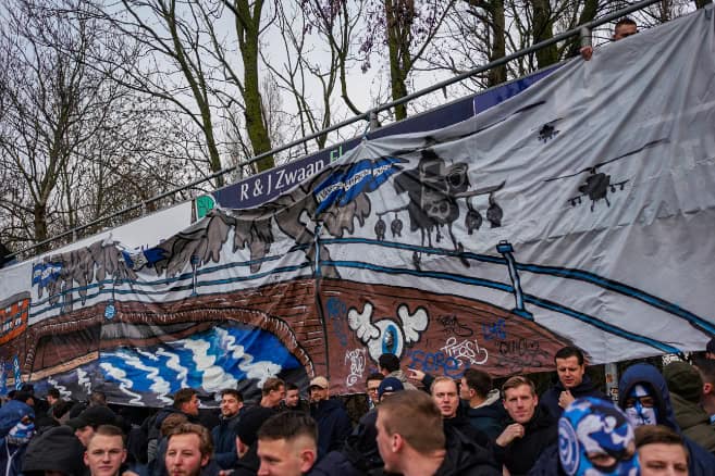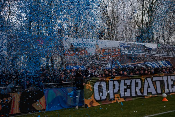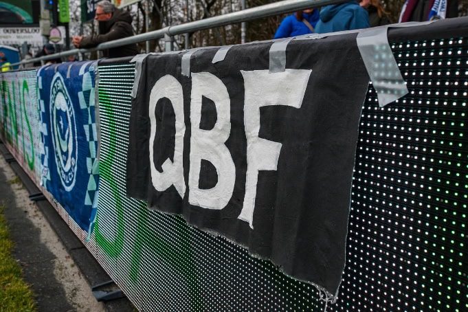Die tijden van uitsupportersverboden zijn voor nu weer voorbij, alhoewel het ook niet allemaal als vanouds is. Geen corteo naar het sportpark, maar een verplichte buscombi voor de gasten van Quick Boys. Dat zijn niet de enige restricties waar de supporters onder te lijden hebben. Zo hangt er in het uitvak nog een doekje met ‘stop supportersverboden’ en is er verder een gigantische politiemacht te zien op het sportpark. Voordat de uitsupporters het ‘uitvak’ mogen betreden hebben deze mannen in blauw het volledige gebied doorzocht voor vuurwerk; en uiteraard niks gevonden!