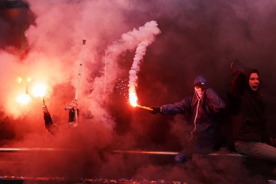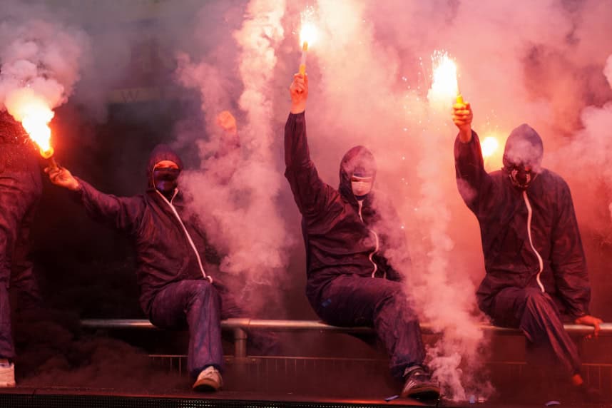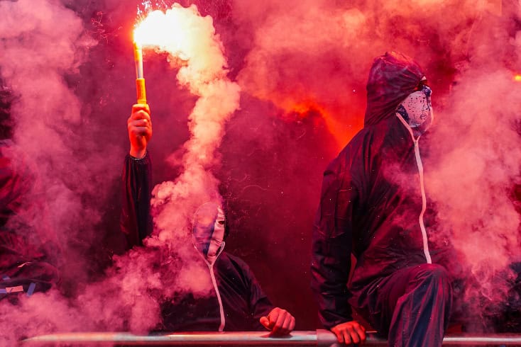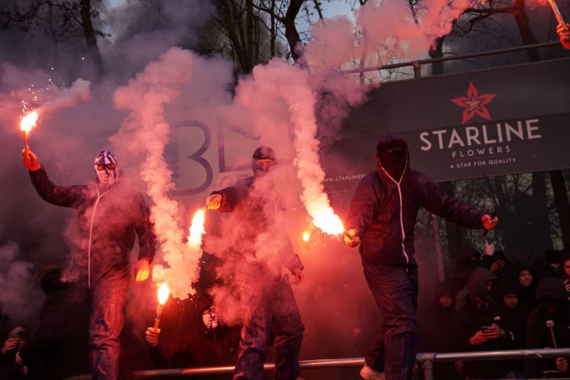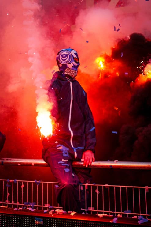 De uitgebreide zoektocht van de politie ten spijt, wordt de sfeeractie uiteraard kracht bijgezet met een goede pyroshow. Door middel van een doek is eerder omgekleed (ook in het amateurvoetbal gaat het allemaal niet zo makkelijk meer tegenwoordig) en zo kunnen 10 tot 20 supporters fakkels afsteken. Opvallend zijn hierbij ook de Portsmouth-logo’s op sommige bivakmutsen, een club waar supporters van Quick Boys als jarenlang een soort vriendschapsband mee onderhouden.