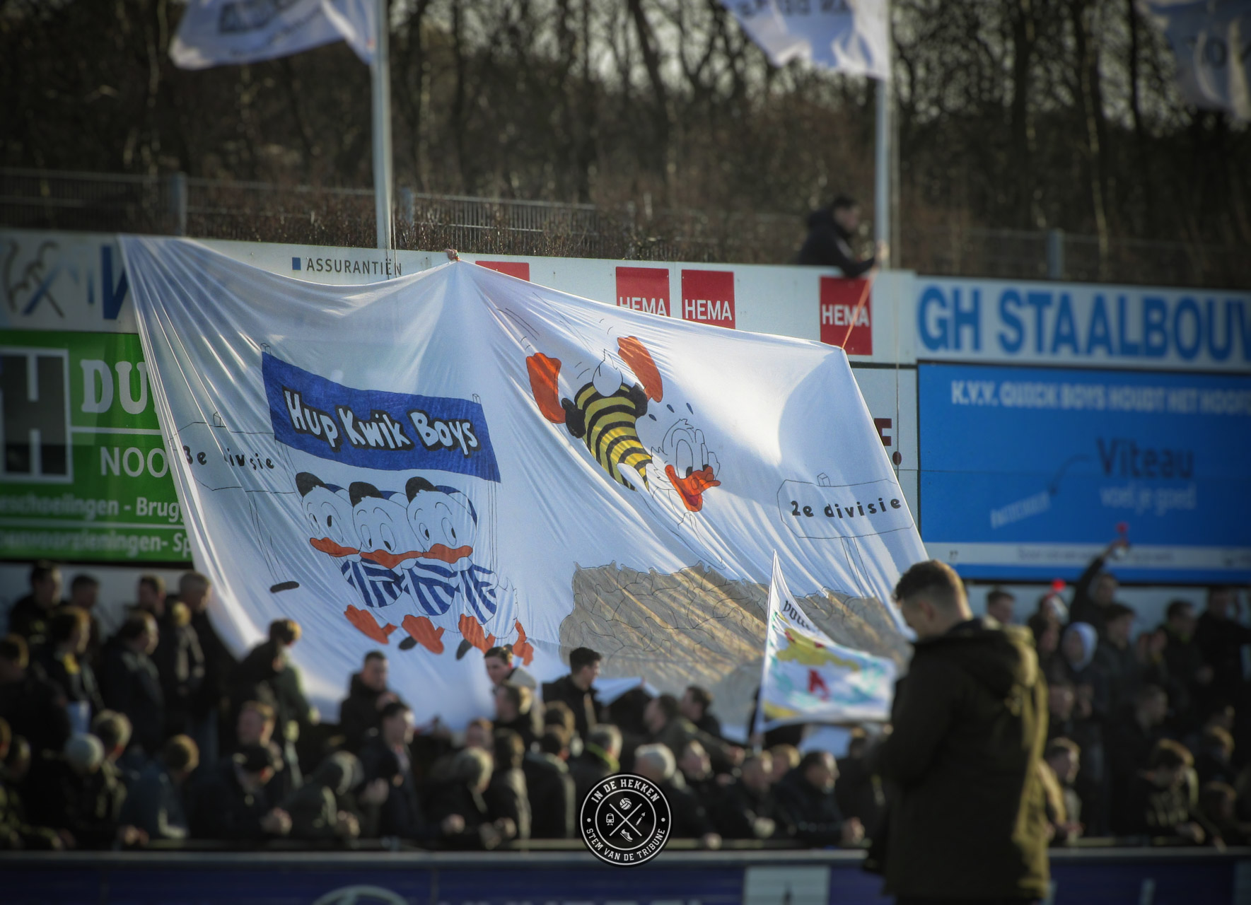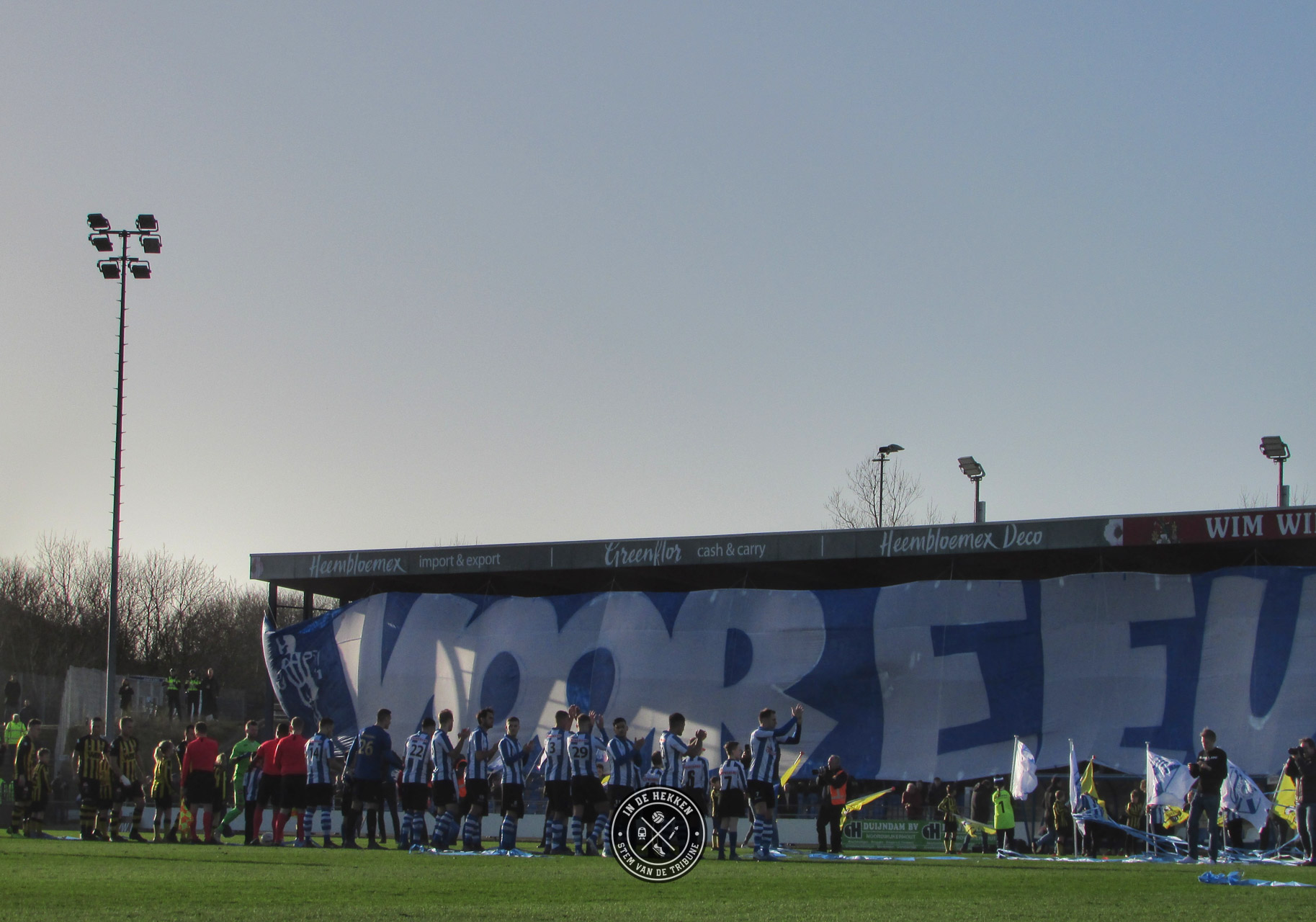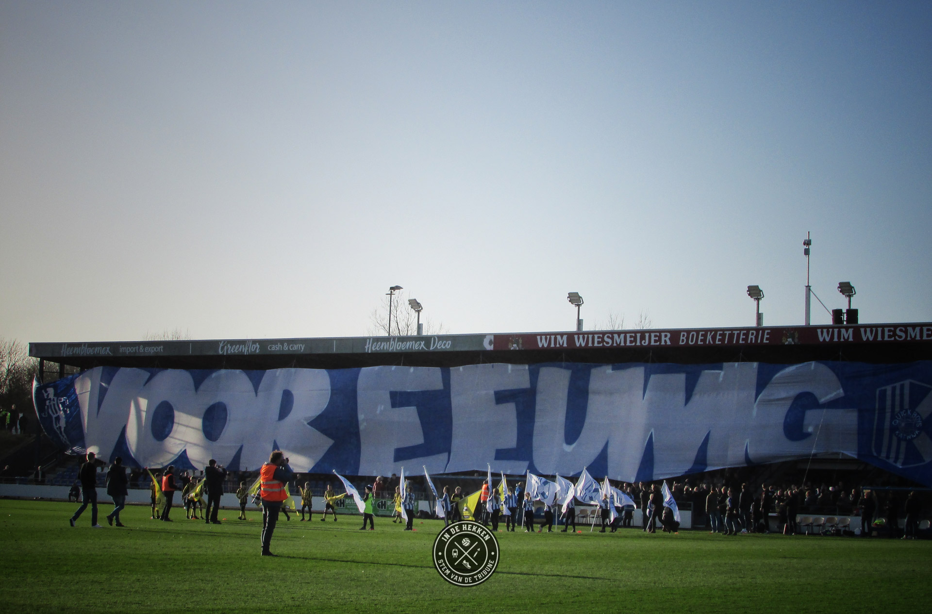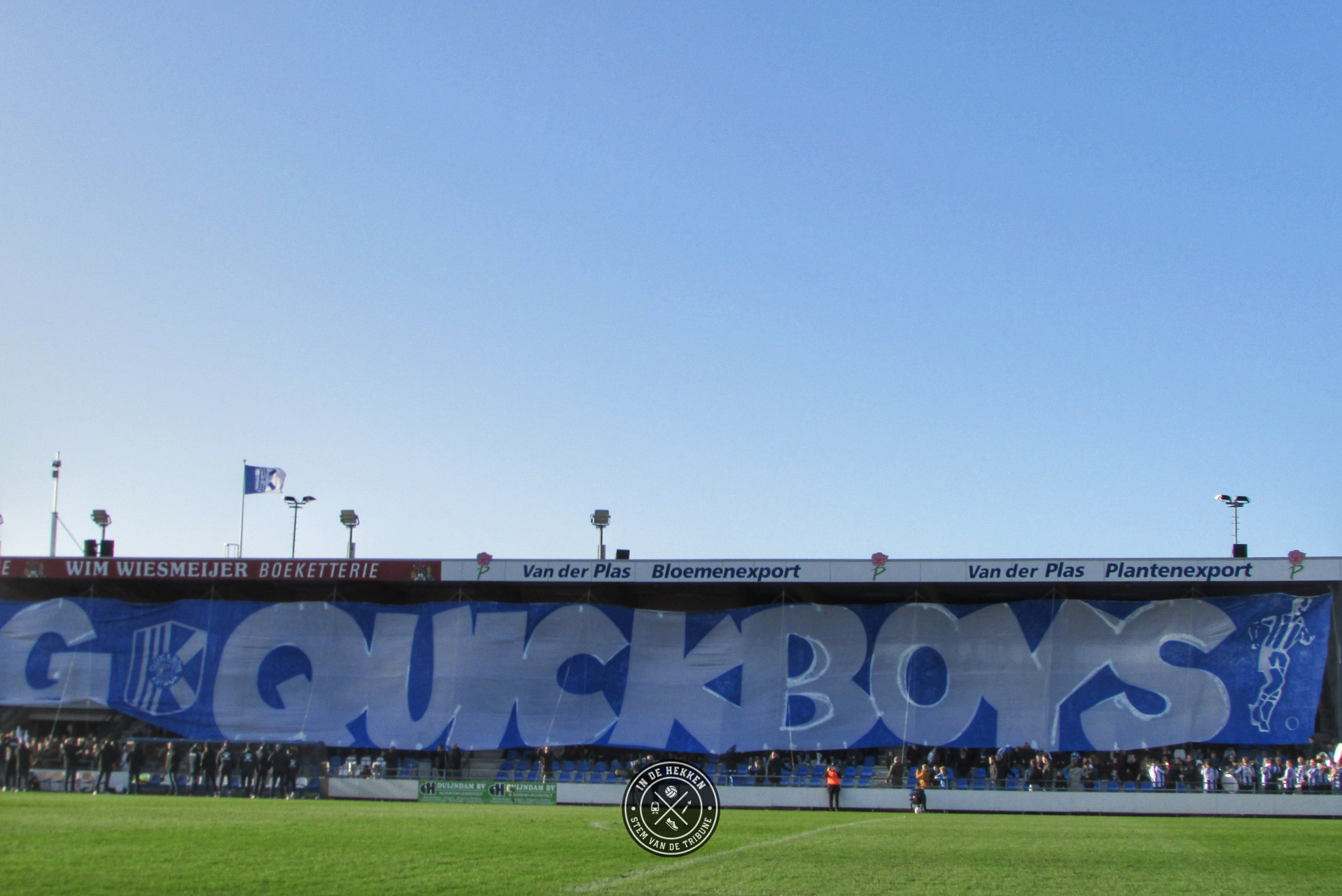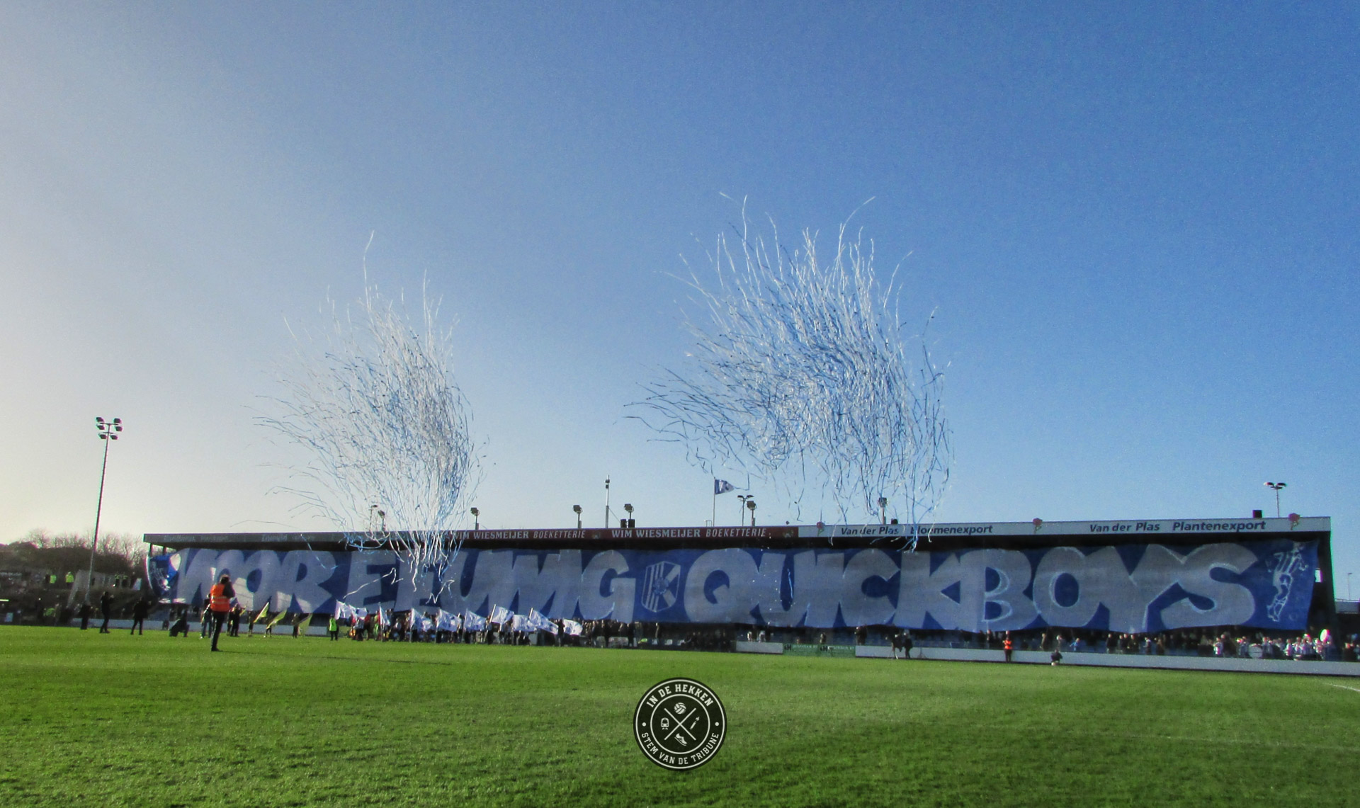 Tijd dus om op 1 februari 2020 een uitgebreid feestje te vieren. En wij mochten erbij zijn. Ondanks dat het vuurwerk rond middernacht geen doorgang kon vinden vanwege de harde wind, mocht dat de pret niet drukken. Het 100 jarig bestaan van de club werd op een prachtige wijze groots gevierd. Voorafgaand aan de wedstrijd tegen Rijnsburgse Boys een doek met “Voor Eeuwig Quick Boys” over de hele lengte van de tribune. Aangevuld met de nodige vuurwerk op het veld en naast het veld een prima startschot voor de volgende 100 jaar in het bestaan van de blauw-witten.
