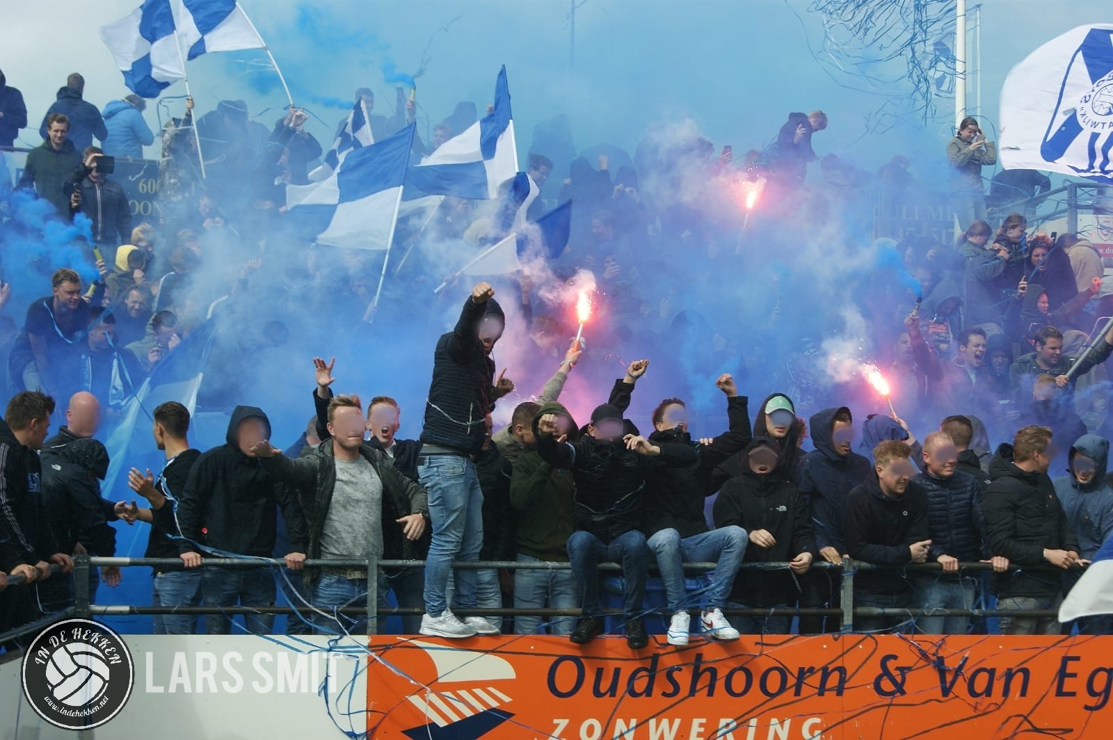 De sproeiers in combinatie met de keiharde tegenwind zorgen ervoor dat de voorste linie aan supporters kletsnat is als de spelers het veld opkomen. Maar dat maakt allemaal niks uit. De fakkels worden ontstoken (en er was nog zo gezegd dat vuurwerk verboden was jongens) en de rookpotten knallen blauw. Met de wind keihard tegen geeft het ook een apart beeld. Ondanks dat alle rook keihard de duinen in verdwijnt, is het toch spectaculair om te zien. Tegenstander VVSB heeft meer geluk, hun gele rookwolk waait juist het veld op en lijkt hierdoor nog groter dan hij is.
