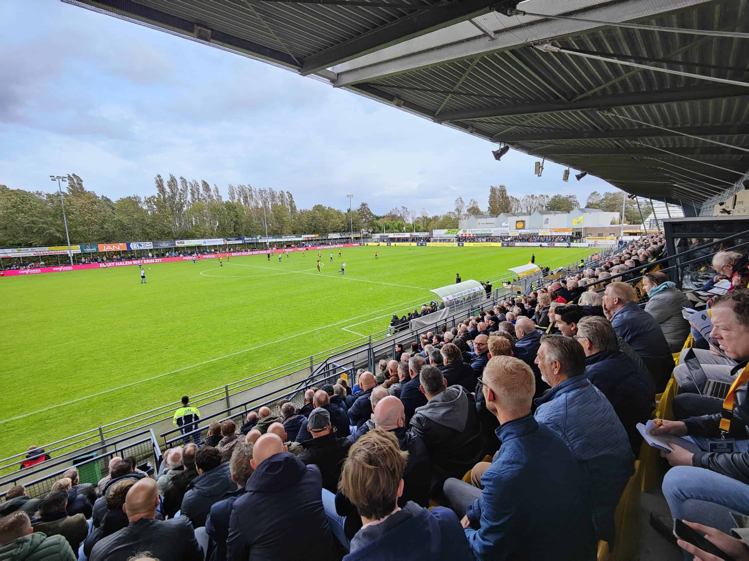 Officieel uitsupportersverbod? Niets van te merken. Quick Boys neemt Sportpark Middelmors van Rijnsburgse Boys over. We zijn bij de derby tussen de Uien en Blauw Witte Narren in de Tweede Divisie.