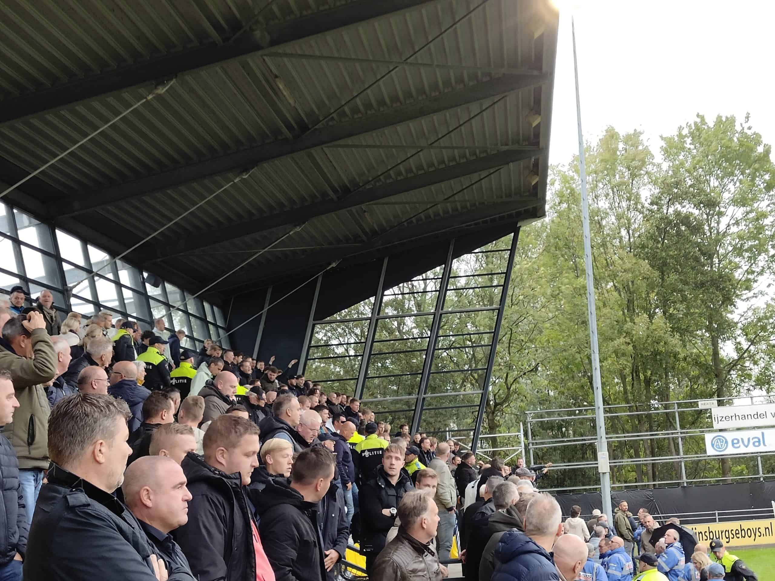 Als de groep van Rijnsburg terug in het stadion is komen de spelers het veld op. Geen tifo, geen spandoek, geen pyro, geen vuurwerk. Helemaal niets. Dit keer schort de sfeer aan veel kanten bij Rijnsburgse Boys. Als vervolgens blijkt dat het stadion vol zit met Quick Boys-supporters wordt het helemaal schrijdend. De linkerkant van de tribune, inclusief het sponsorvak, is ondanks het verbod geheel overgenomen door de rivaal. Aan de andere lange zijde staat nóg een groepje dat zwaait naar de overkant. Bijna komt het tot een confrontatie met de supportersgroep van Rijnsburg, maar beveiliging krijgt het snel door en begeleidt de groep naar de rest van de Quick Boys-supporters. Zo zijn er uiteindelijk een kleine 200 bezoekers binnengekomen. Eenmaal bij elkaar laten de supporters van zich horen en overstemmen ze de jeugdig ogende groep van Rijnsburg.