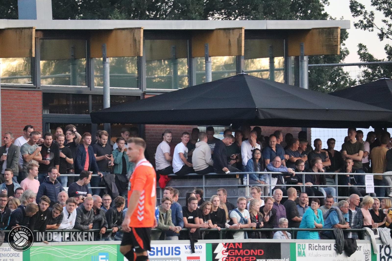 Na een helse fietstocht door onbewoond gebied, gelukkig ondersteund door een paar halve liters, komen we nog ruim op tijd aan voor de aftrap. De Greune Weide is al volgelopen met supporters. Het sportcomplex zelf is niet bepaald gebouwd op dit soort supportersaantallen, of eigenlijk op voetbal in de Hoofdklasse in het algemeen. Alles is echter strak georganiseerd en naast de vaste tribune is nog een tijdelijke tribune gezet om de capaciteit te verhogen. Langs het hele veld zijn staantribune’s gemaakt door middel van het stapelen van pallets. Ook de aanwezigheid van een balkon aan de kantine zorgt ervoor dat er toch genoeg plek is voor de duizenden aanwezige supporters.