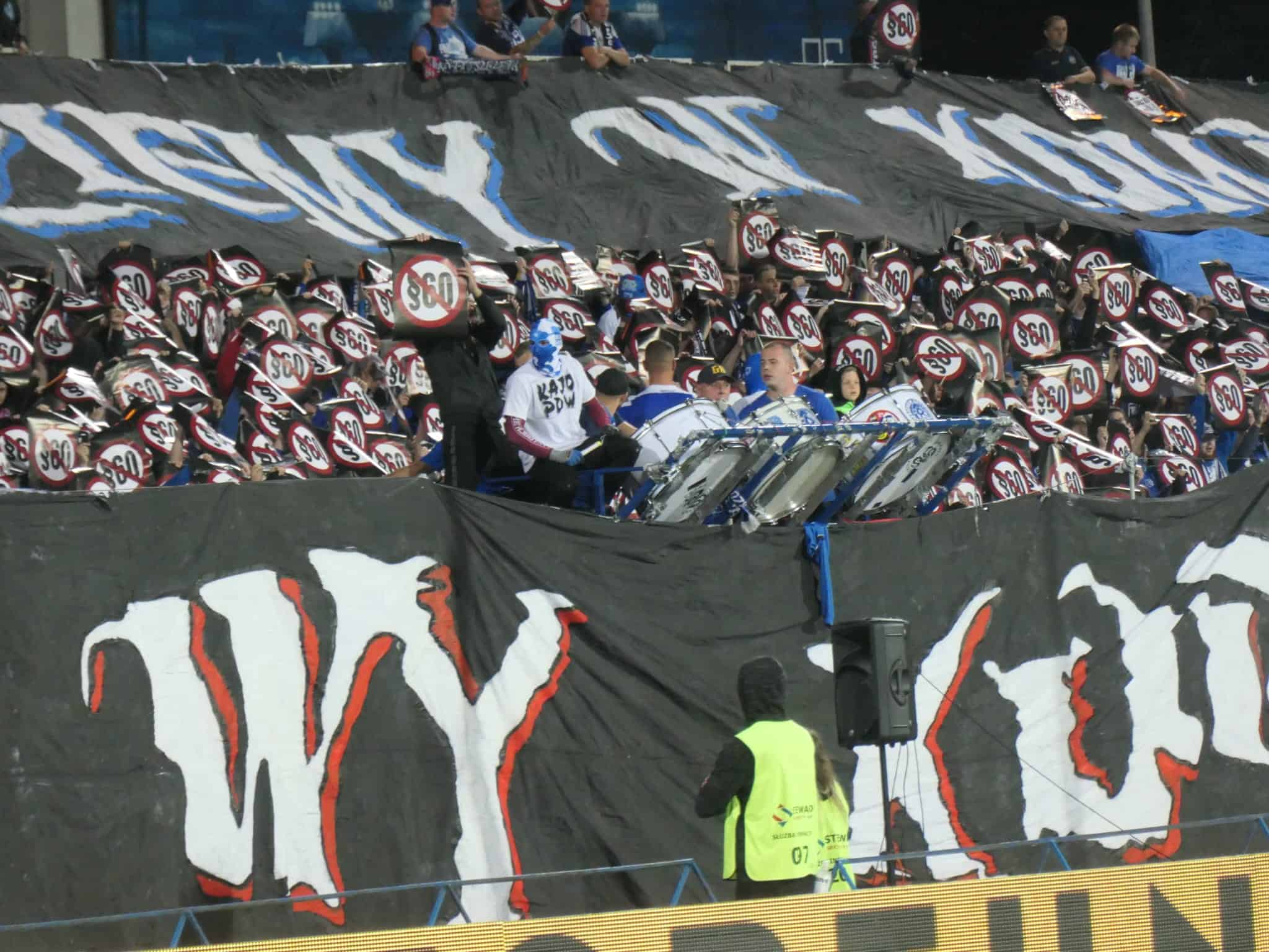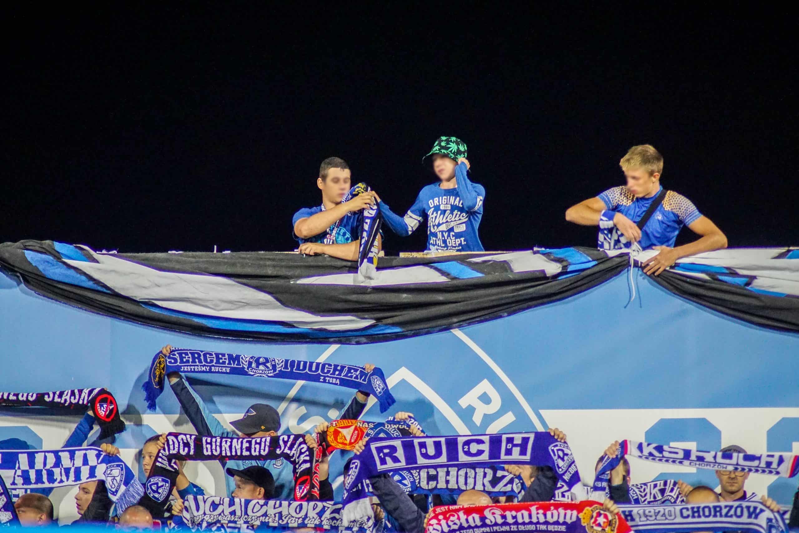 Dit kan een spandoek zijn van Ruch Chorzow zelf, maar wellicht ook van een van hun aanwezige vrienden. Zowel Widzew Lodz als Wisla Krakau als Elana Torun is groots afgereisd voor de belangrijke derby. Atletico Madrid is niet aanwezig, maar we zien in de stad wel enkele stickers en t-shirts van de Spaanse club met wie Ruch Chorzow ook nog een vriendschap heeft. De uitsupporters mogen rekenen op massale steun van goede vrienden Row Rybnik en GKS Katowice, plus een kleine afvaardiging van Hajduk Split.