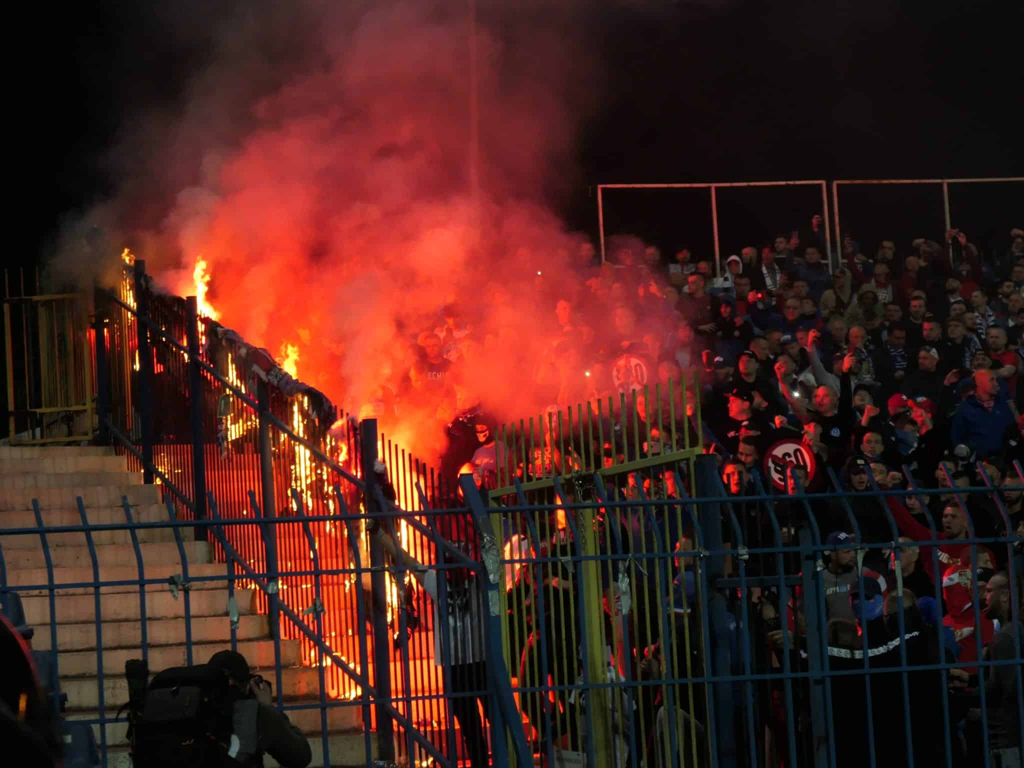 De gehele lange zijde aan de overkant is de huidige generatie hooligans en ultras. Reguliere supporters? Die vormen een hele kleine minderheid op de hoofdtribune. Dat maakt het tot een orkaan van geluid. Dit alles wordt nog eens extra geholpen door het schitterende ouderwetse stadion dat de Nederlandse keuring nooit zou doorstaan. Zo heeft het (zelfs voor de pers) op geen enkele plek in het stadion toiletten. Alle supporters moeten het doen met mobiele toiletten. Op de hoofdtribune na is alles onoverdekt. Je voelt je in dit stadion echt weer 30 jaar terug in de tijd.