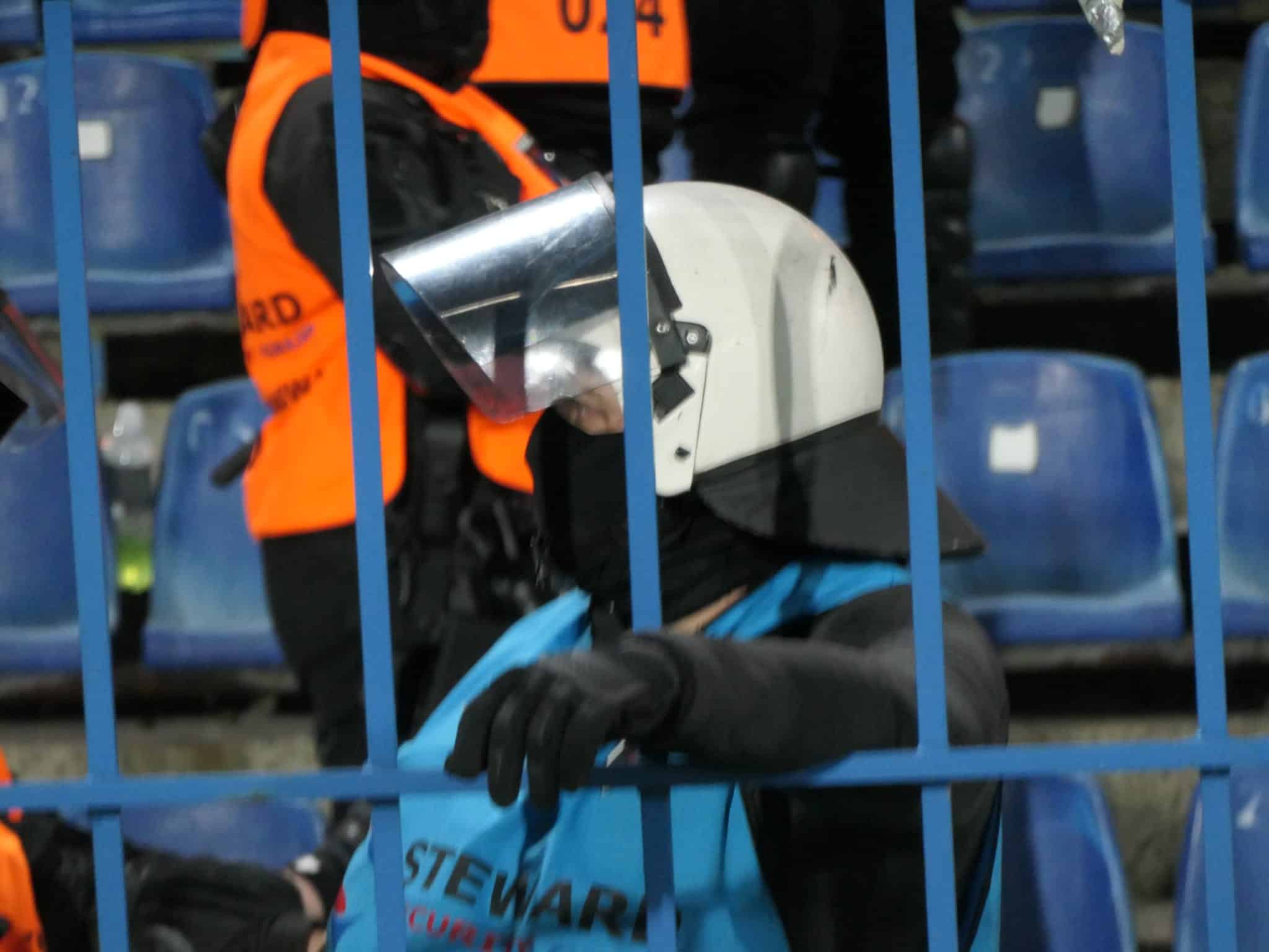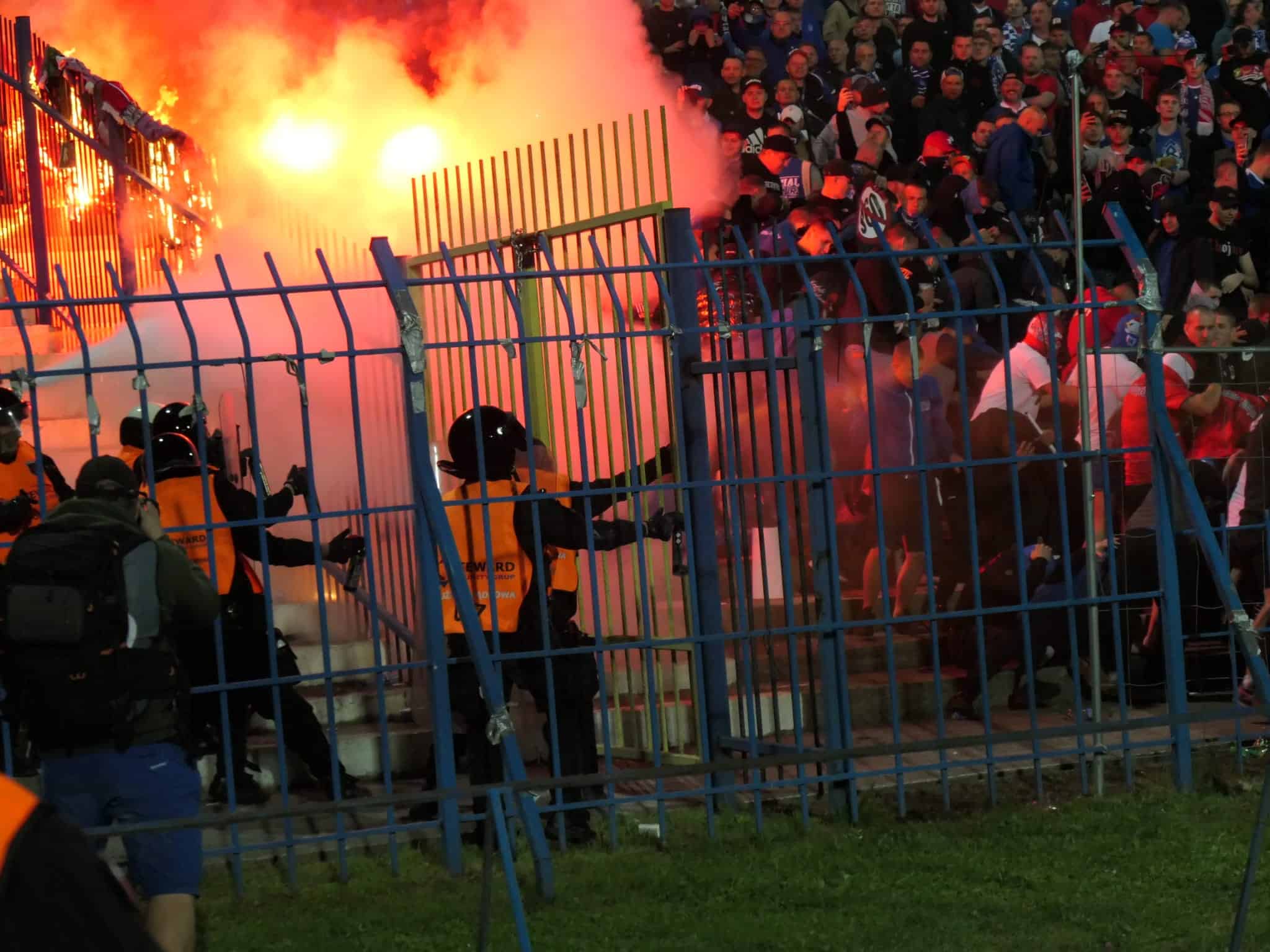 Terwijl ik naar de korte zijde loop voor beter zicht op dit spektakel komt al het gespuis juist de andere kant op. Supporters met vechthandschoenen aan of bivakmutsen op haasten zich naar de rellen toe terwijl de lucht zich vermengd tot een tranentrekkende mix van brandlucht en traangas. Minutenlang gaat het er hard aan toe vanuit beide kanten. De spanning die nu ontstaat gaat de hele wedstrijd lang niet meer weg.