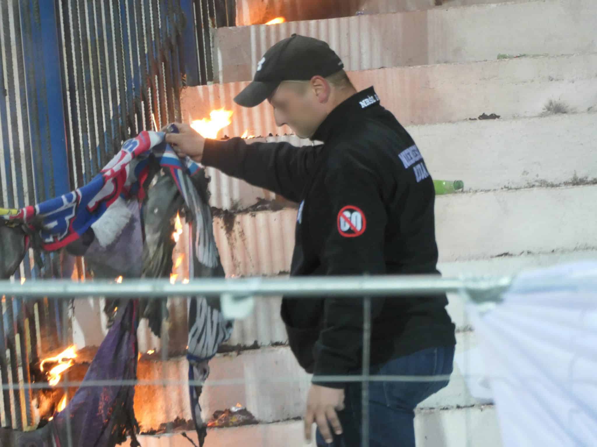 Alsof de sfeer nog niet hatelijk genoeg is, is het tijd voor de supporters van Ruch om het naar het volgende level te tillen. Op het hek zo dicht mogelijk bij het uitvak stallen de hooligans buitgemaakte materialen uit. Niet alleen sjaals van Ruch Chorzow decoreren het hek, maar ook veel spul van de grote vriend GKS Katowice. Nadat dit hele rijtje mooi is uitgestald is het tijd om de hele verzameling in de fik te zetten. Het hek veranderd in één grote brandende rij textiel.
