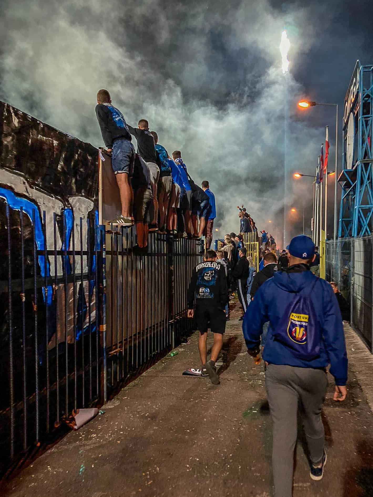 In de rust krijg ik dankzij de bevriende Poolse fotograaf de uitnodiging van de ultrafotograaf om de tweede helft op het vak tussen de ultras te bekijken. Zo’n toffe aanbieding sla ik natuurlijk niet af. Zo verdwijn ik van het veld en loop ik even later tussen de hooligans door naar de tent toe voor wat drinken. De tweede fotograaf blijft op het veld achter voor goede beelden Als de tweede helft begint met voetballen sta ik zo midden in de actie, waardoor de spanning een hele nieuwe dimensie aanneemt.