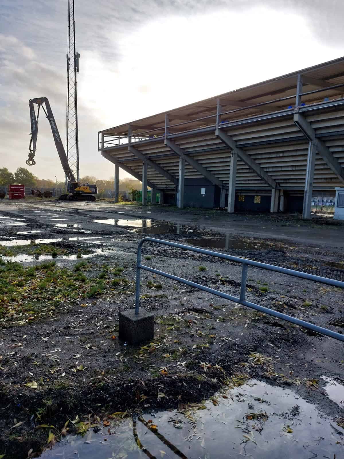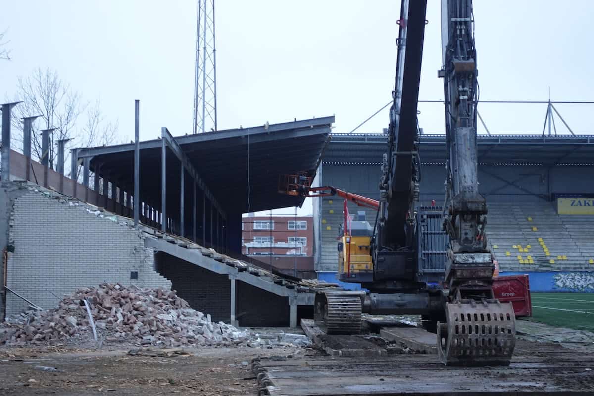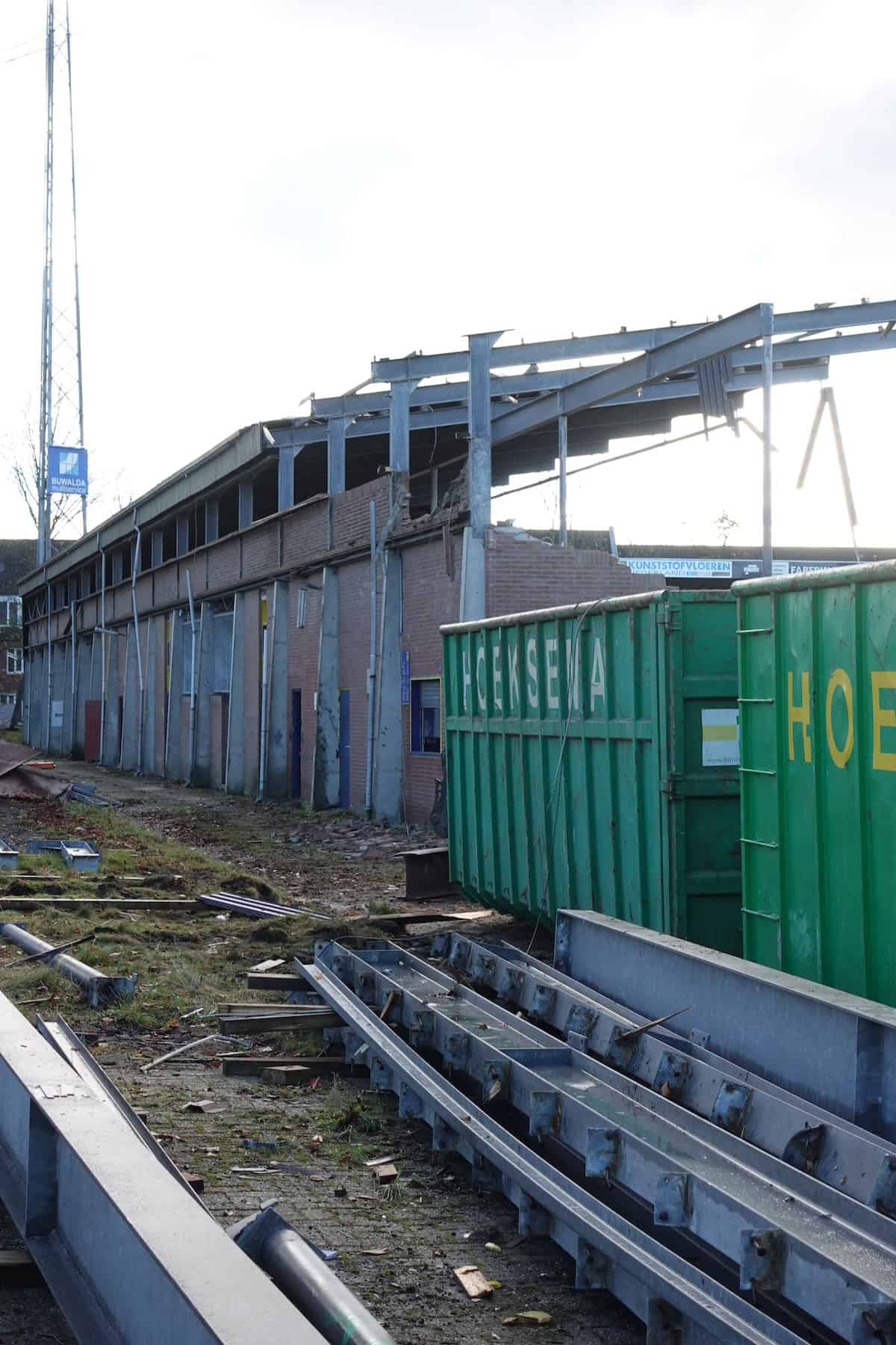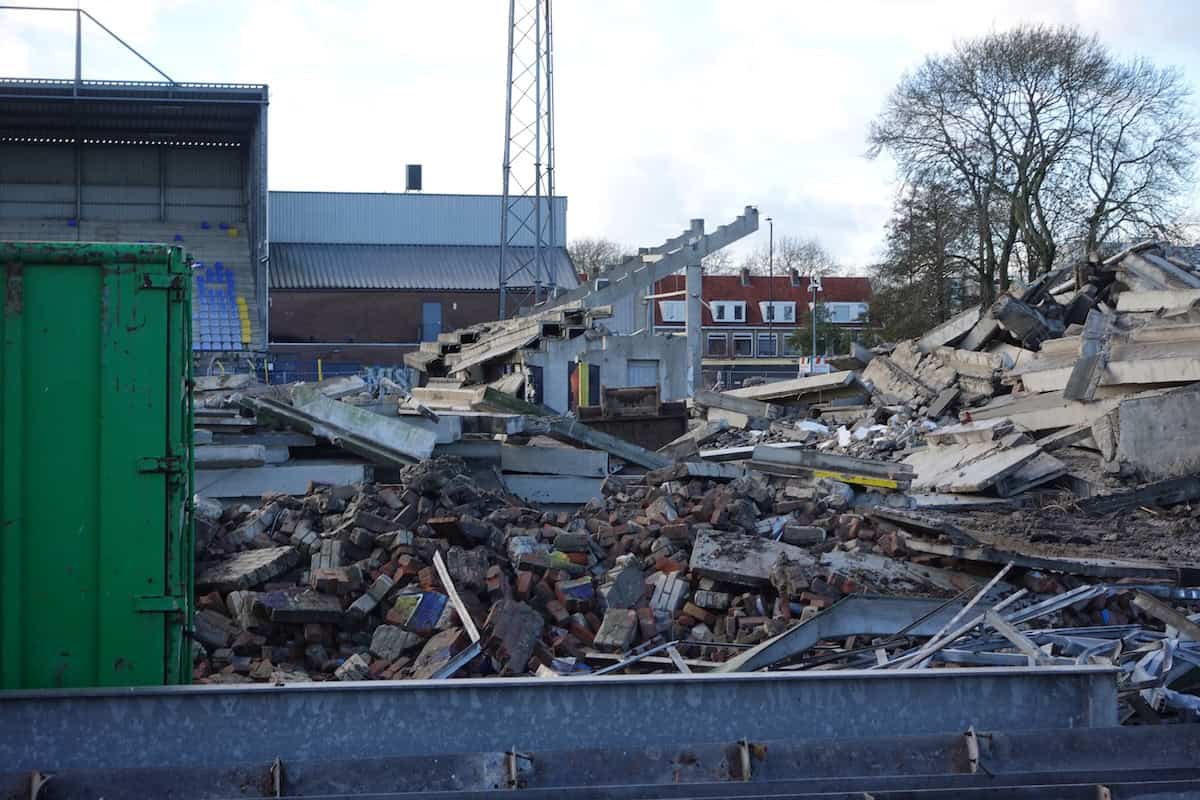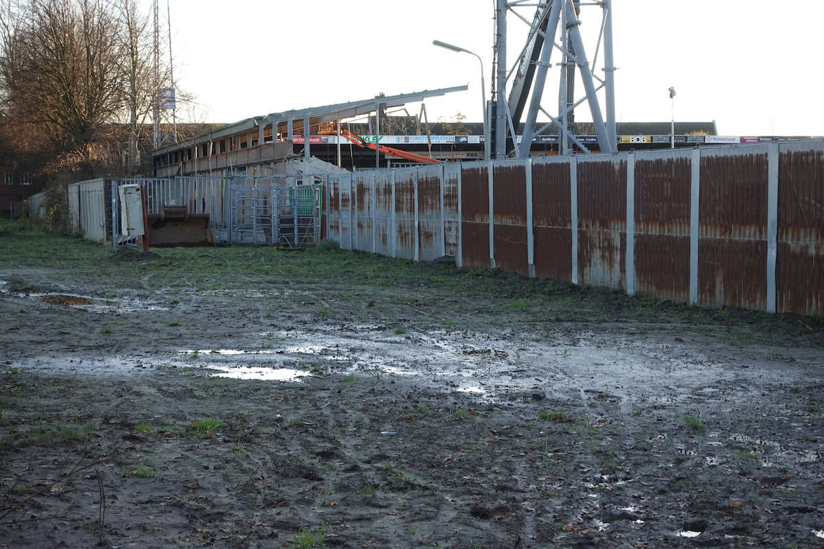 De Noord-tribune is eind november bijna volledig verdwenen. Alleen het deel waar de ingang van supportershome ’t Hert zat staat nog overeind. Het gebied tussen waar ooit Noord stond en wat nog over is van Zuid oogt als een gevulde bomkrater: af en toe verwrongen staal en vooral gestapeld puin van beton en stenen muurdelen. De slopers zijn ondertussen aanbeland bij het ontmantelen van het stalen geraamte van de voormalige zittribune. Achter de tribune oogt het gek genoeg een stuk opgeruimder dan tijdens stoeltjesophaaldag afgelopen juni. Toen stond de afgetakelde geel-blauwe schaftkeet er nog. Over niet al te lange tijd ziet het hele terrein er waarschijnlijk net zo uit: vlakgemaakt en bouwrijp.