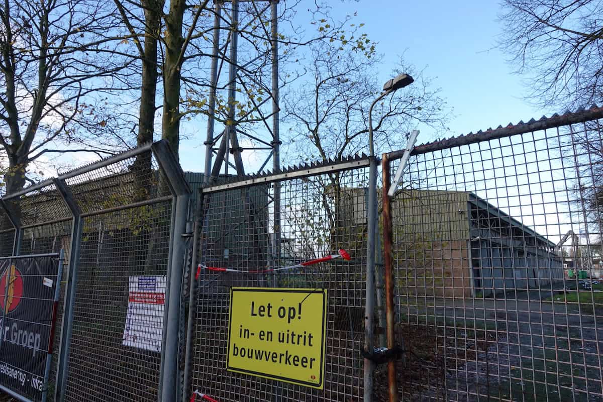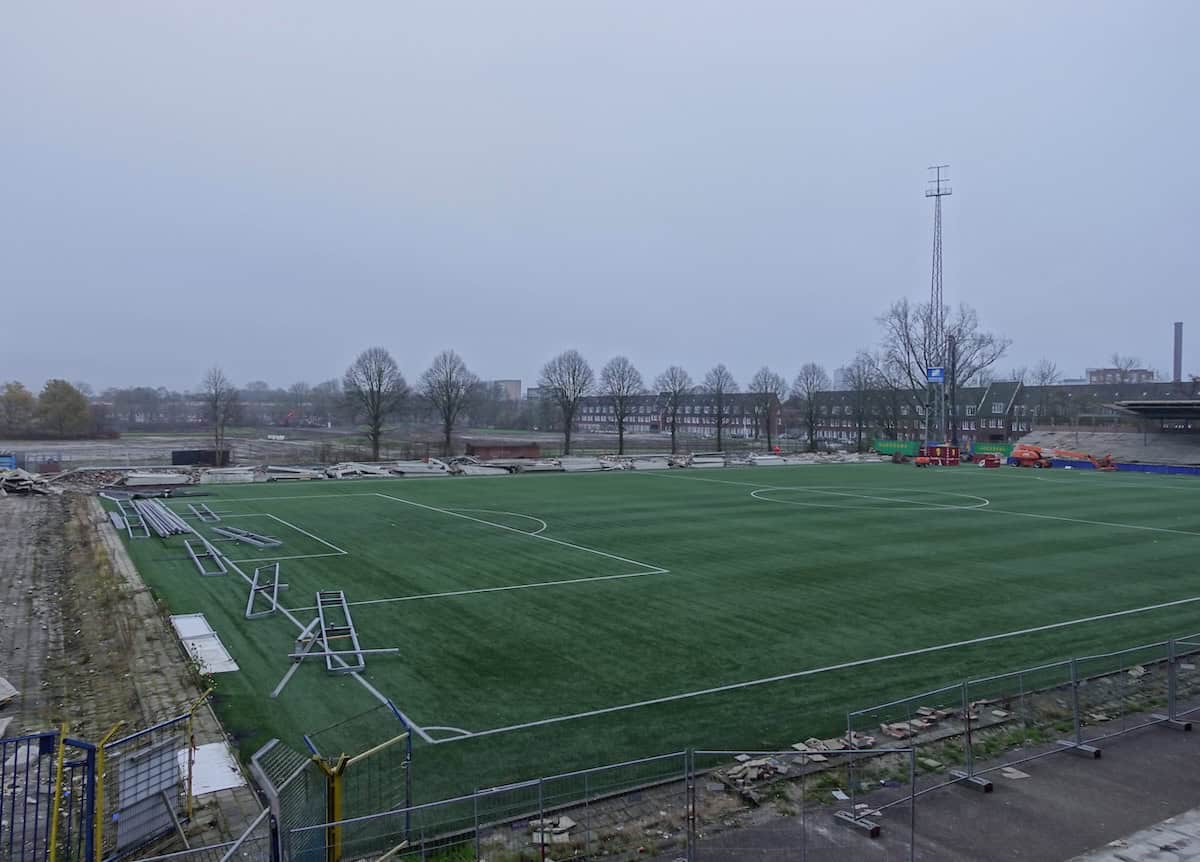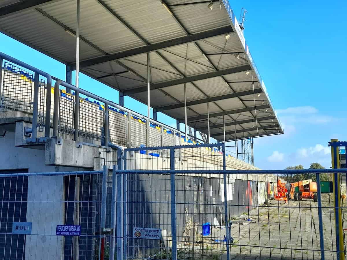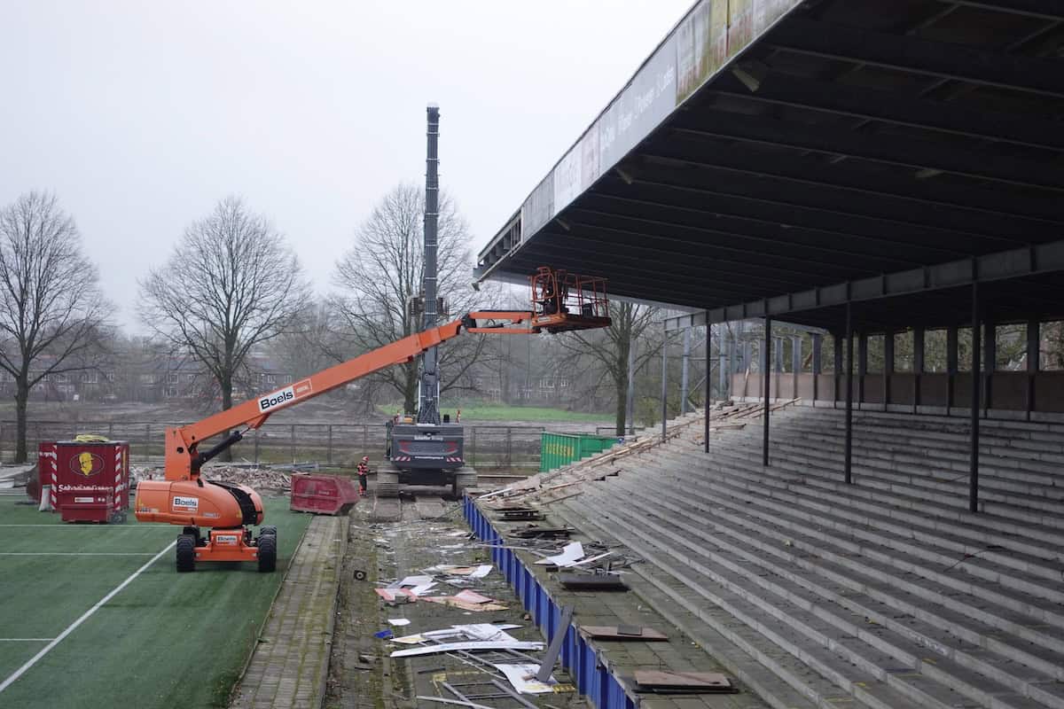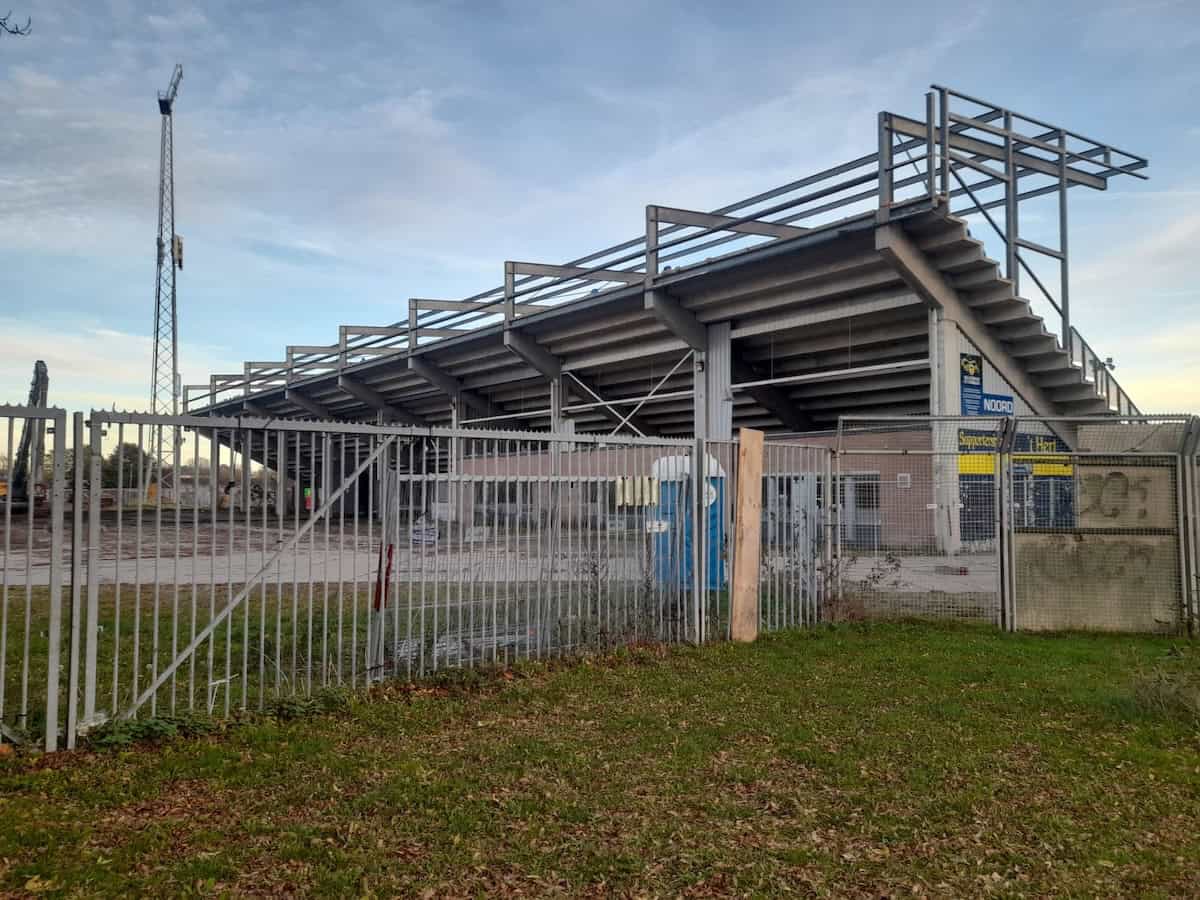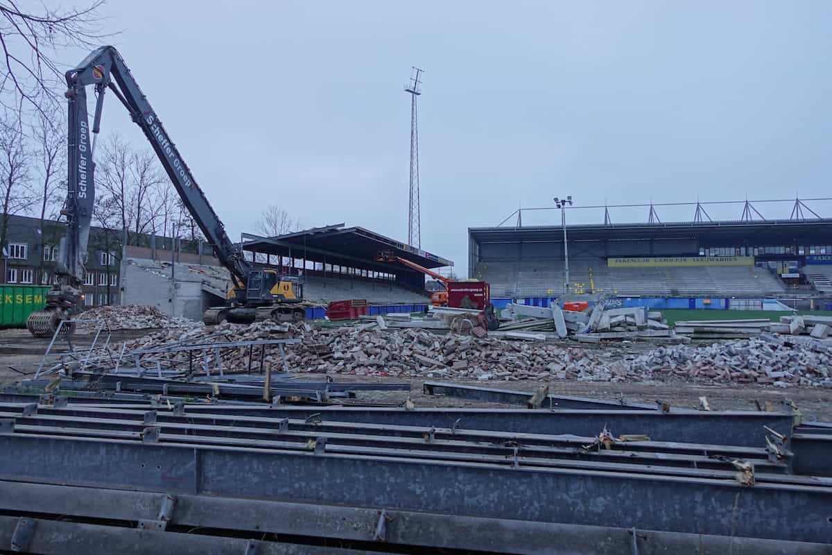 De Noord-tribune is eind november bijna volledig verdwenen. Alleen het deel waar de ingang van supportershome ’t Hert zat staat nog overeind. Het gebied tussen waar ooit Noord stond en wat nog over is van Zuid oogt als een gevulde bomkrater: af en toe verwrongen staal en vooral gestapeld puin van beton en stenen muurdelen. De slopers zijn ondertussen aanbeland bij het ontmantelen van het stalen geraamte van de voormalige zittribune. Achter de tribune oogt het gek genoeg een stuk opgeruimder dan tijdens stoeltjesophaaldag afgelopen juni. Toen stond de afgetakelde geel-blauwe schaftkeet er nog. Over niet al te lange tijd ziet het hele terrein er waarschijnlijk net zo uit: vlakgemaakt en bouwrijp.