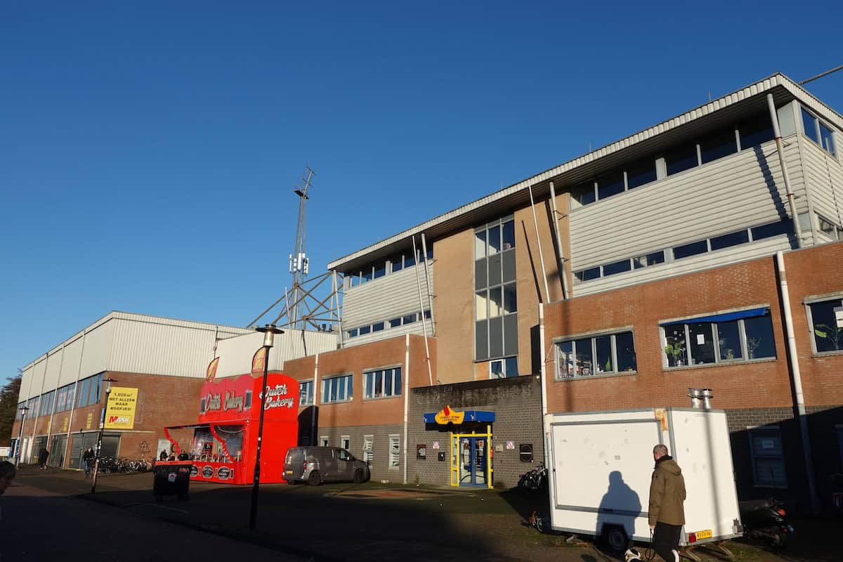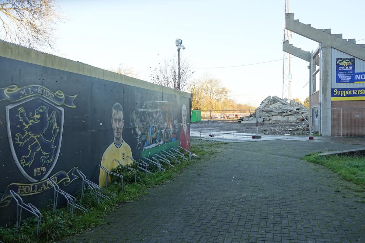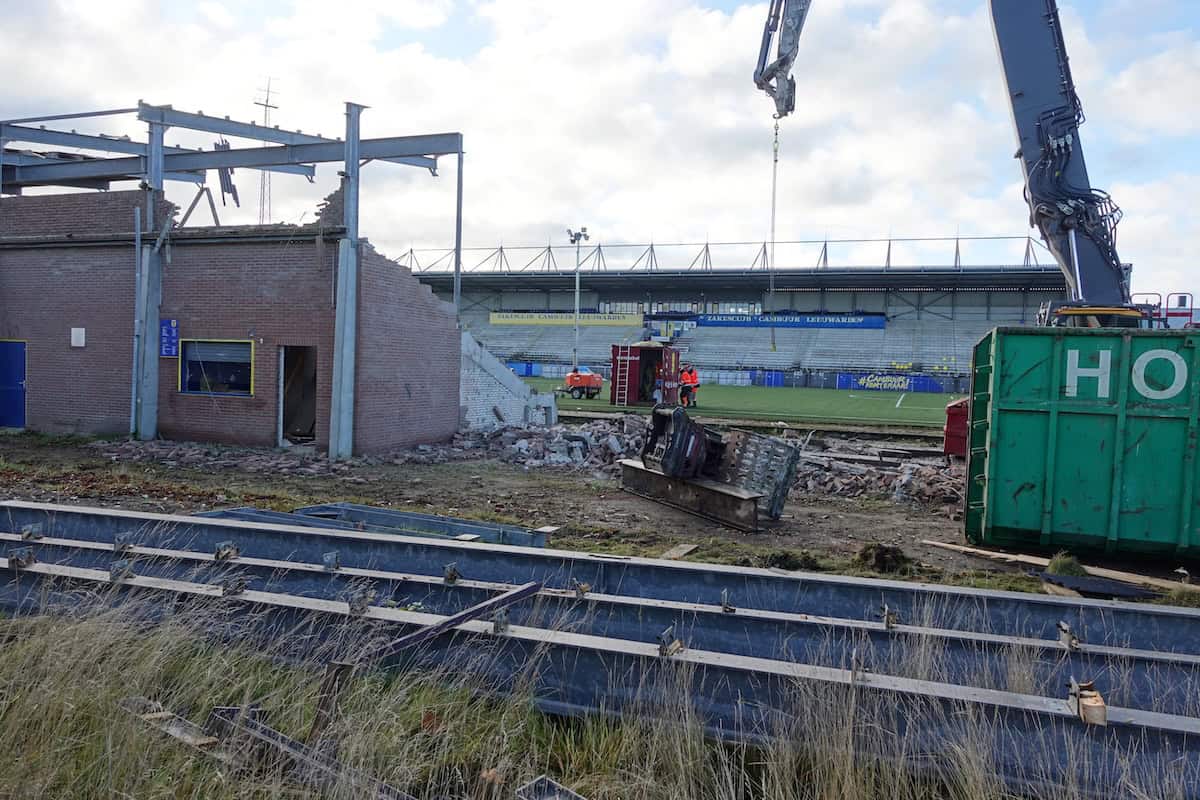 Op twee vrijdagmiddagen, eind 2025, reis ik naar Leeuwarden om de sloop van dichtbij mee te maken. Aangekomen op het Cambuurplein parkeer ik mijn OV-fiets bij de levendig drukke supermarkt die tegen de oude hoofdtribune (West) aangeplakt zit. Het is halverwege de middag, bij de oliebollenkraam is het rustig. De Vietnamese loempiakar blijkt gesloten. Ik wandel richting de oude Oost-tribune, die nog maar voor een deel overeind staat. Het hek naar de voormalige voetbalvelden van v.v. Leeuwarden is open en ik ga het terrein op. Het heeft flink geregend de afgelopen weken en wanneer ik van het gebaande pad richting stadionhek loop, zak ik regelmatig weg in de blubber. De sloop van dichtbij gadeslaan lukt niet: de vriendelijke slopers laten mij luid en duidelijk weten dat het oude stadion verboden terrein is voor ramptoeristen.