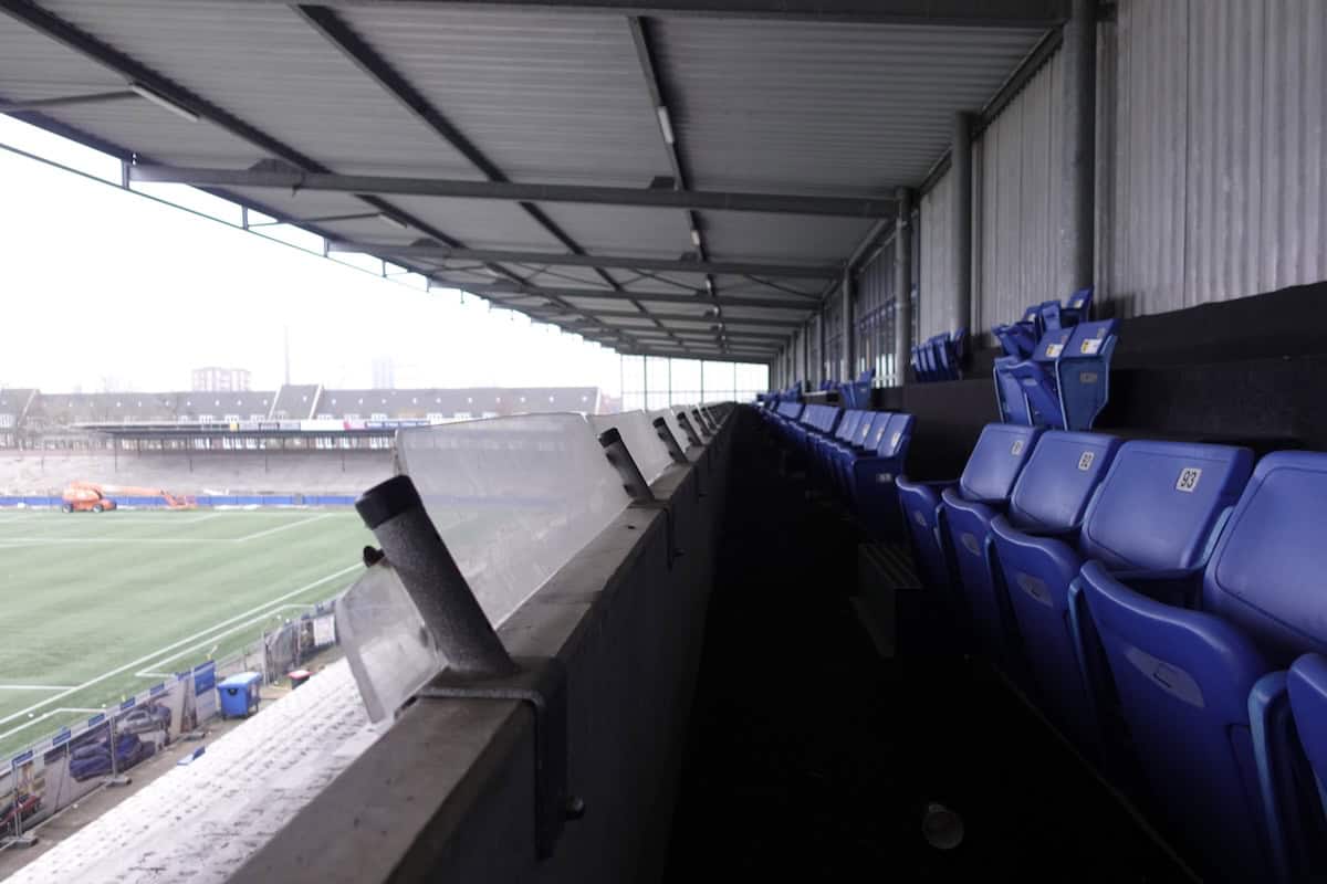 Ik ga bij de voormalige hoofdingang (West) van het stadion naar binnen. Wellicht kan ik via De Klomp de oude hoofdtribune betreden, zodat ik niet alleen foto’s door de hekken maak. Bij binnenkomst is het een grote chaos, onder andere als gevolg van acties van vandalen eerder in 2025. Zelfs het clublogo heeft het moeten ontgelden. Ik loop een trap op die naar De Klomp leidt. In de grote ruimte doen mensen spelletjes of kijken wat rond bij de tweedehands kleding. Er hangt een ongedwongen sfeer. Via een deur kom ik op het bordes, waar Cambuur in 2013 gehuldigd werd als kampioen van de Eerste Divisie, na een spectaculaire ontknoping op de slotdag van de competitie. Het bordes is nu het rookterras voor de mensen van De Klomp. Ik sta ter hoogte van de middenstip, met uiteraard een goed uitzicht. Aan de kant van de Oost-tribune staan alleen nog bomen overeind, zoals die eind jaren zeventig ook achter de oude onoverdekte zittribune zichtbaar waren.