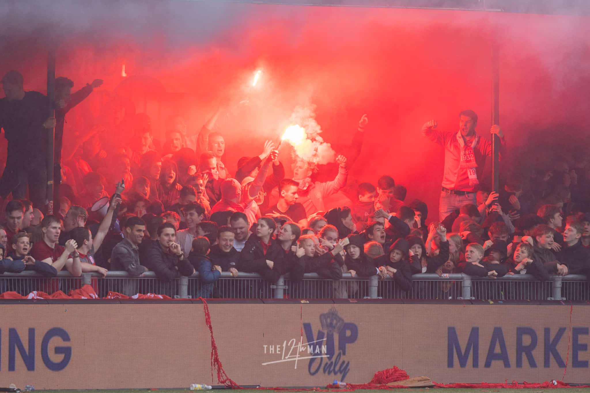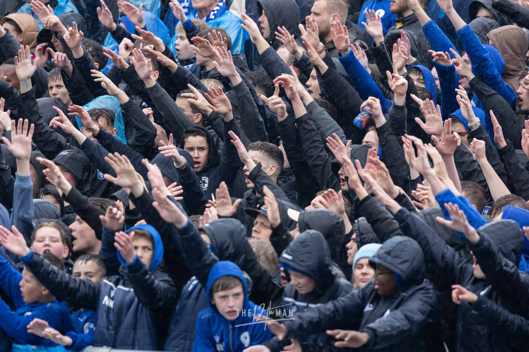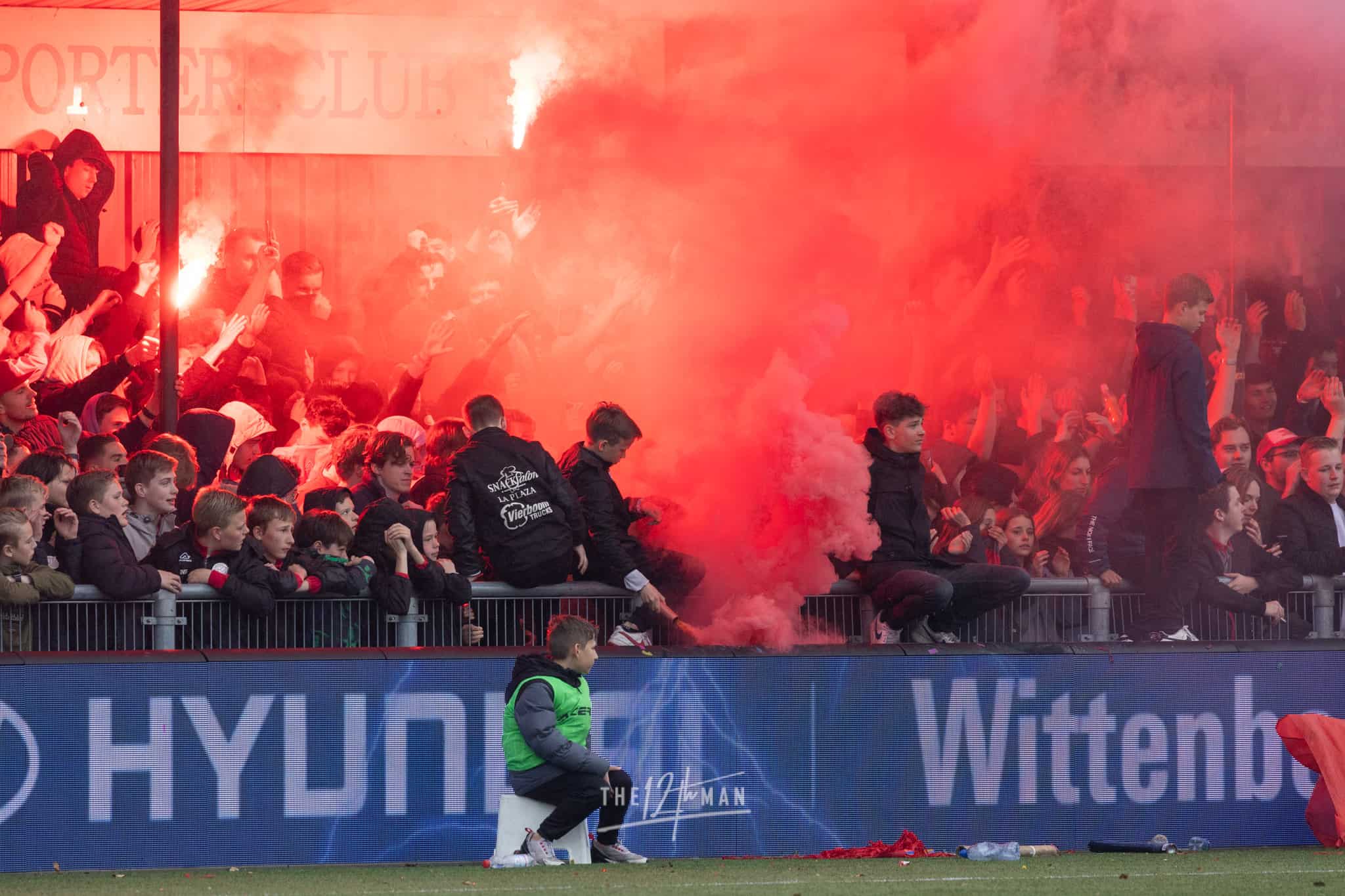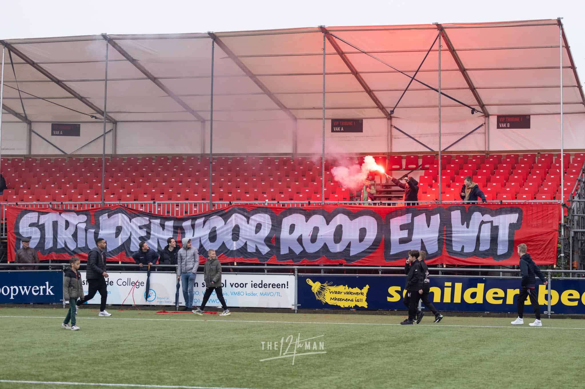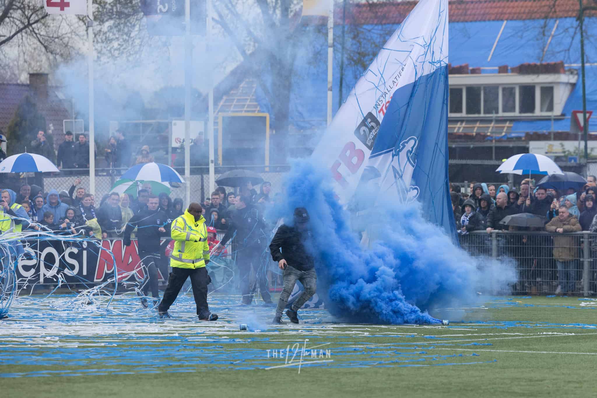 Aan de kant van de Rooien gaan vervolgens ook nog de nodige rookpotten aan. Zowel op de tribune als op het dak van de tribune. Het laatste woord is weer aan de Blauwen die wat vuurwerkpotten met blauwe rook linten afsteken achter de Midden-Noord tribune (supporters Vogels) en achter het doel. De toon is gezet. Een heerlijk begin van deze Spakenburg Derby. Als ze dit doorzetten, krijgen we een fantastische middag.