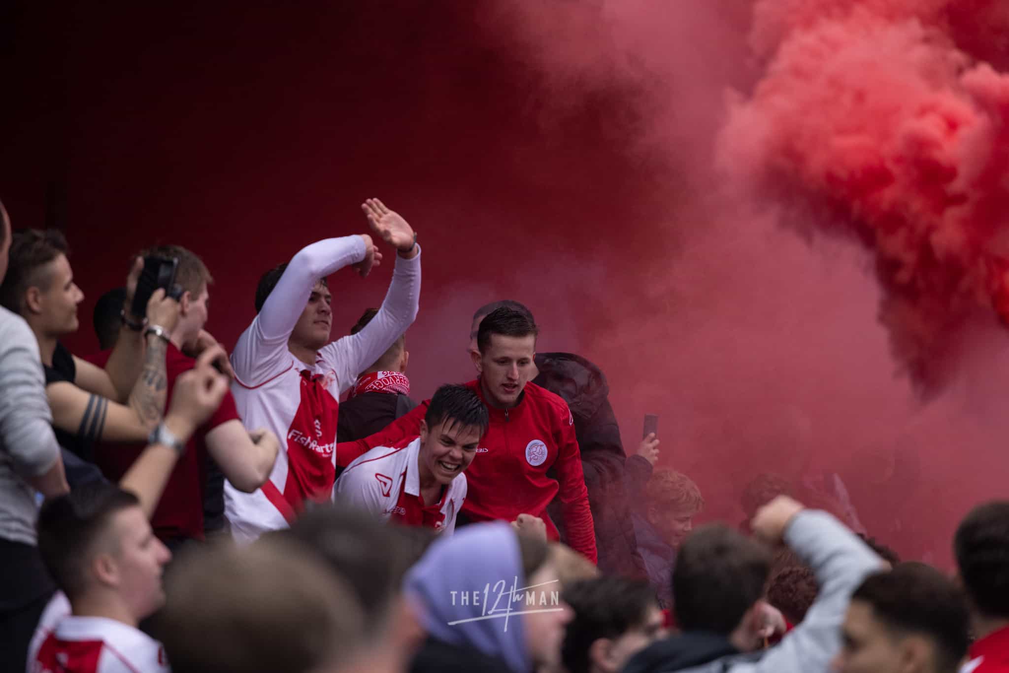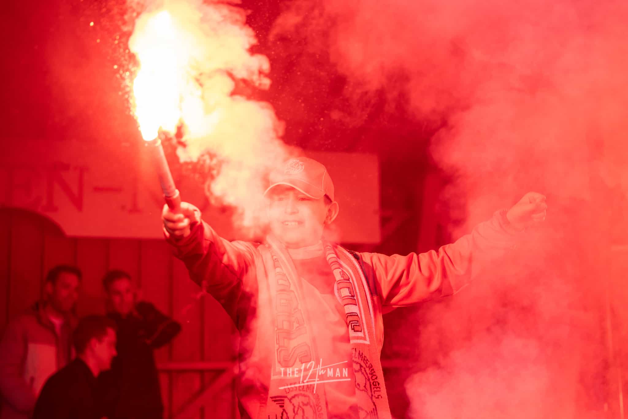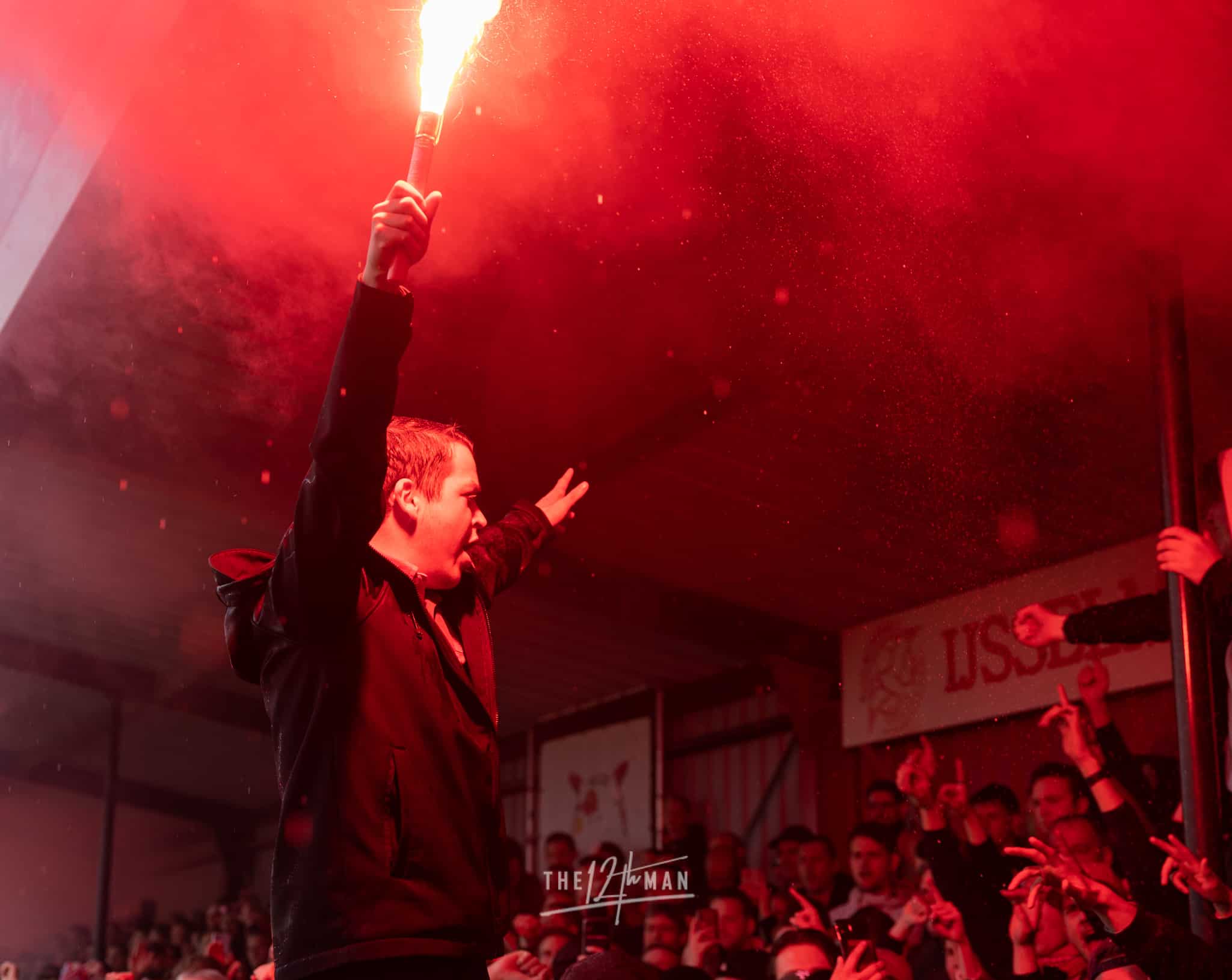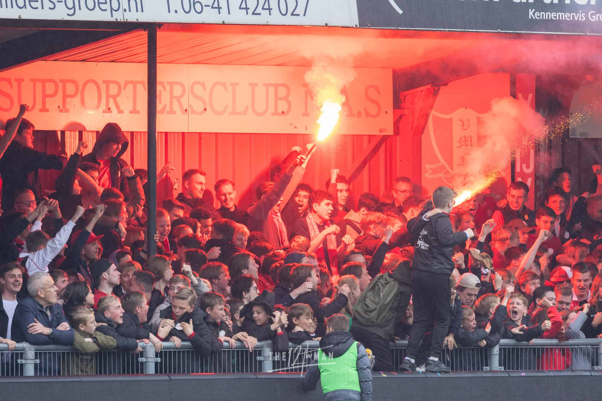 Aan de kant van de Rooien gaan vervolgens ook nog de nodige rookpotten aan. Zowel op de tribune als op het dak van de tribune. Het laatste woord is weer aan de Blauwen die wat vuurwerkpotten met blauwe rook linten afsteken achter de Midden-Noord tribune (supporters Vogels) en achter het doel. De toon is gezet. Een heerlijk begin van deze Spakenburg Derby. Als ze dit doorzetten, krijgen we een fantastische middag.