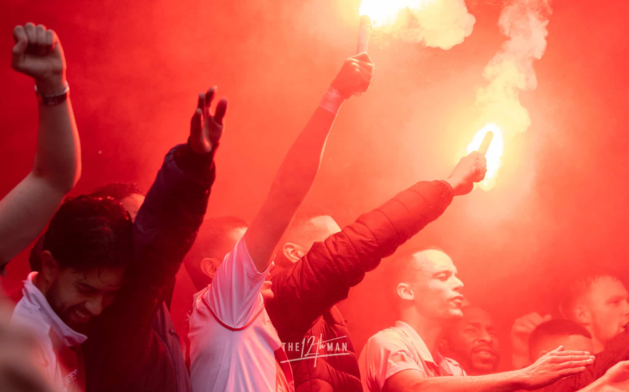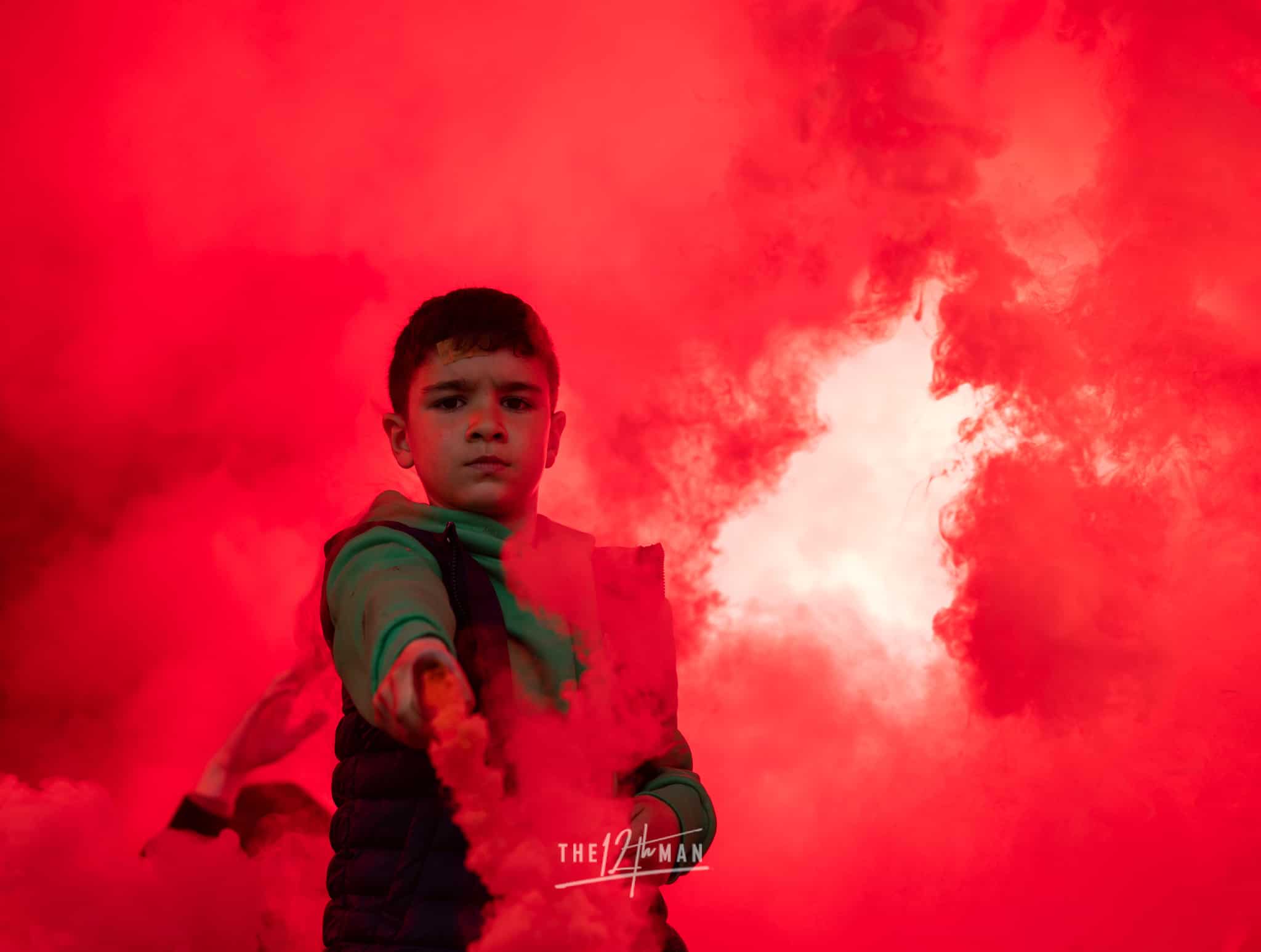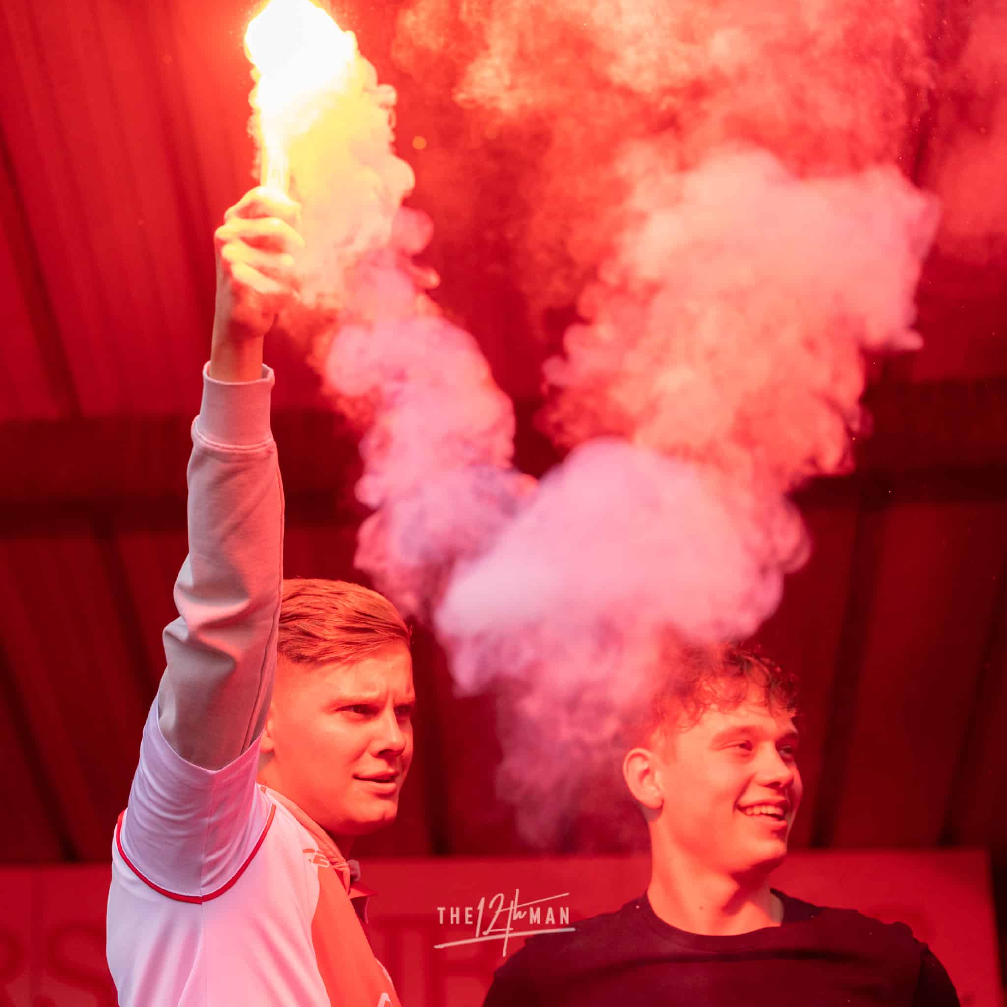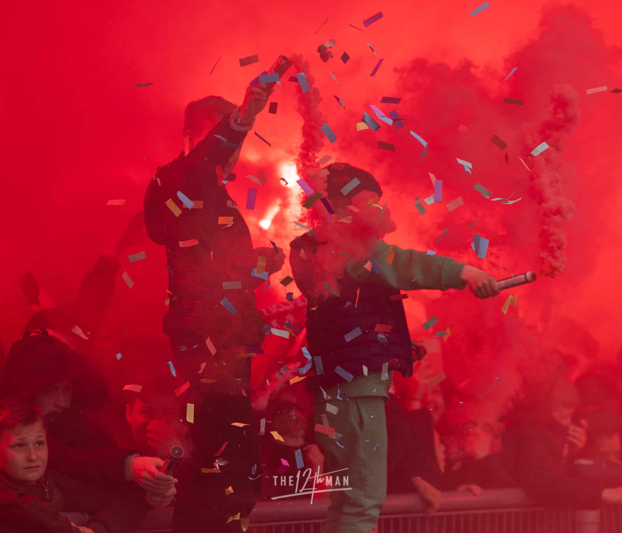 Aan de kant van de Rooien gaan vervolgens ook nog de nodige rookpotten aan. Zowel op de tribune als op het dak van de tribune. Het laatste woord is weer aan de Blauwen die wat vuurwerkpotten met blauwe rook linten afsteken achter de Midden-Noord tribune (supporters Vogels) en achter het doel. De toon is gezet. Een heerlijk begin van deze Spakenburg Derby. Als ze dit doorzetten, krijgen we een fantastische middag.