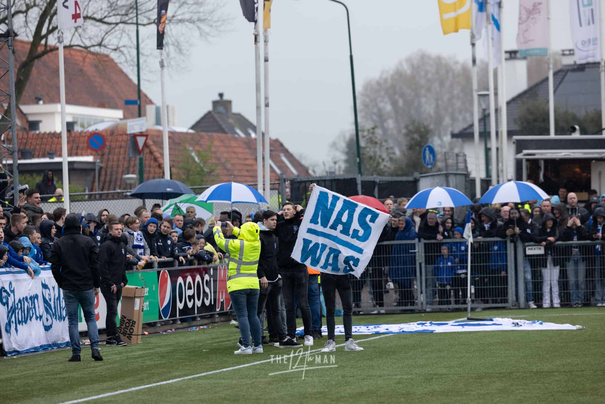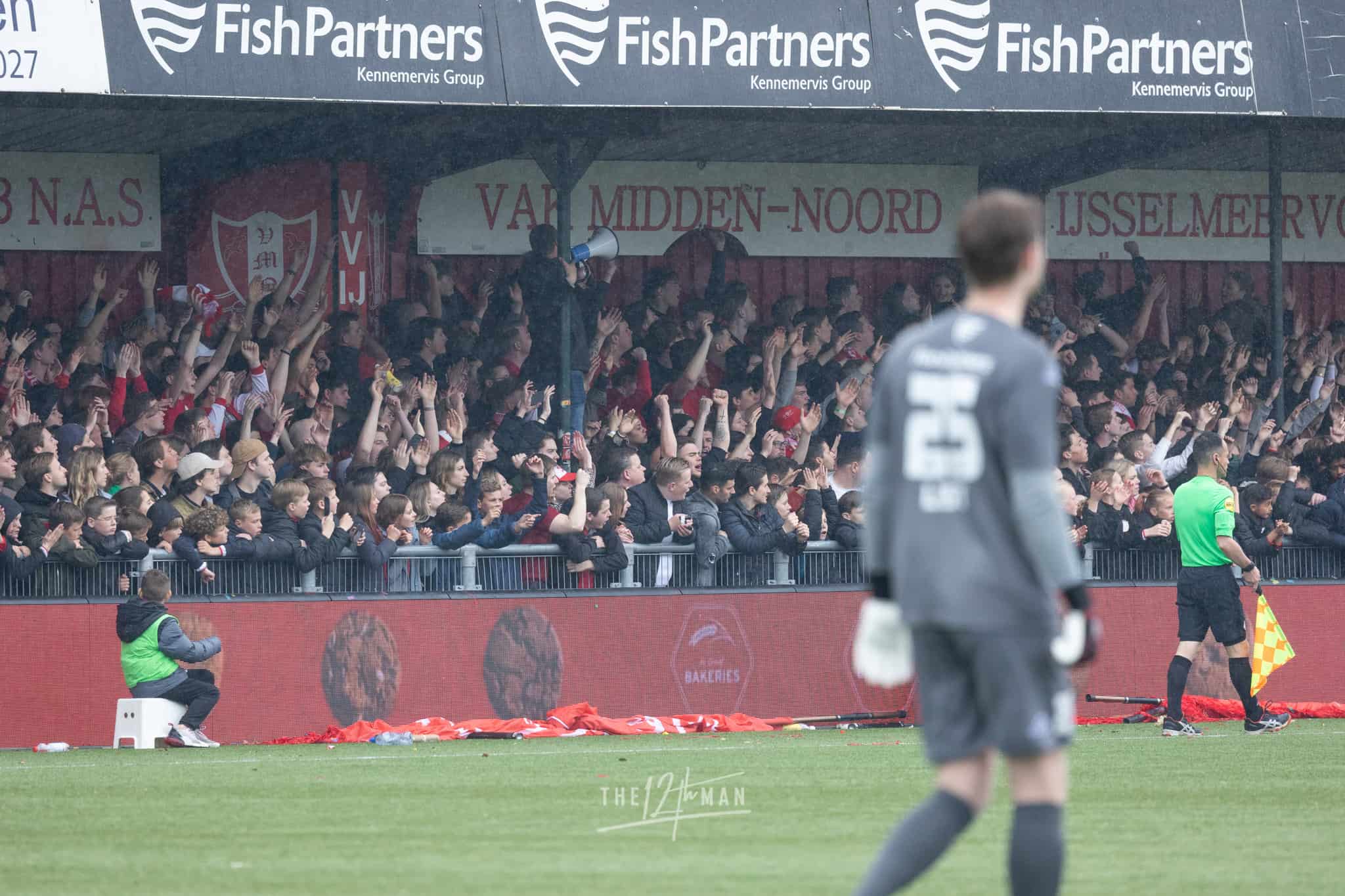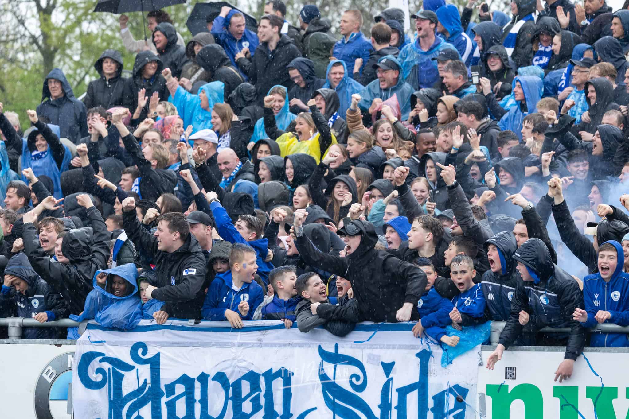 Aan gastvrijheid overigens geen gebrek. Ook nu weer hartelijk ontvangen op de Westmaat aan de kant van IJsselmeervogels. De spanning is voelbaar bij de thuisploeg al durft een enkeling zich toch te wagen aan een positieve uitslag voor de Roden. Het weer zit in ieder geval niet mee. Vlak voor de aftrap gaan de hemelsluizen open wat voorlopig ook zo zal blijven. Het deert de Spakenburgers niet. De Westmaat is afgeladen vol met ook nu weer de nodige internationale aandacht, vooral van vloggers.