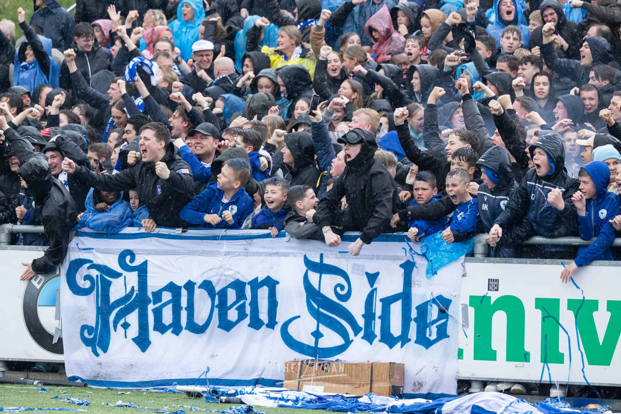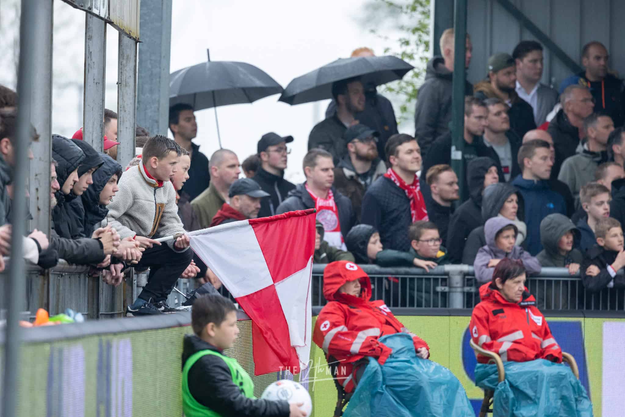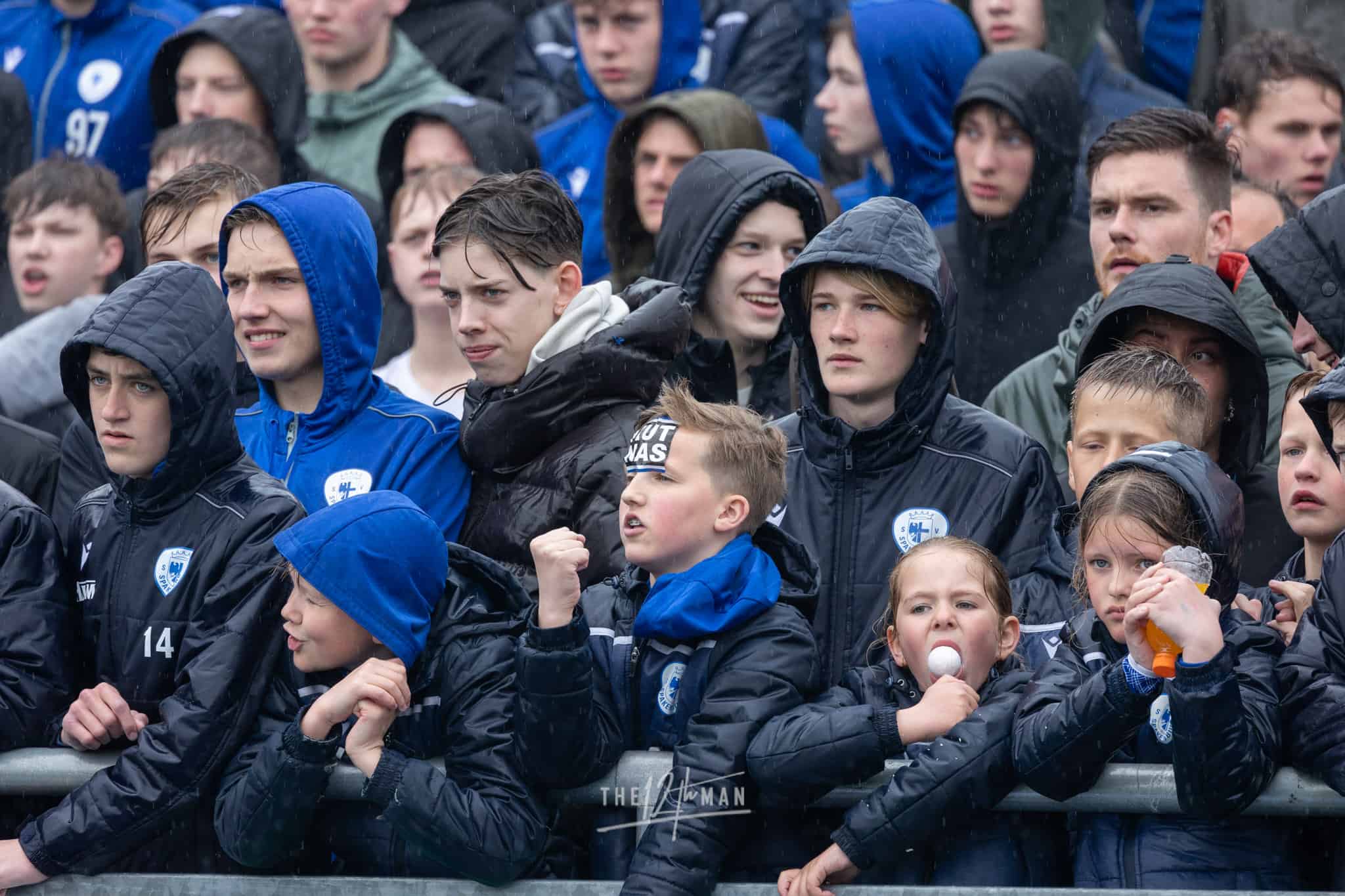 Aan gastvrijheid overigens geen gebrek. Ook nu weer hartelijk ontvangen op de Westmaat aan de kant van IJsselmeervogels. De spanning is voelbaar bij de thuisploeg al durft een enkeling zich toch te wagen aan een positieve uitslag voor de Roden. Het weer zit in ieder geval niet mee. Vlak voor de aftrap gaan de hemelsluizen open wat voorlopig ook zo zal blijven. Het deert de Spakenburgers niet. De Westmaat is afgeladen vol met ook nu weer de nodige internationale aandacht, vooral van vloggers.