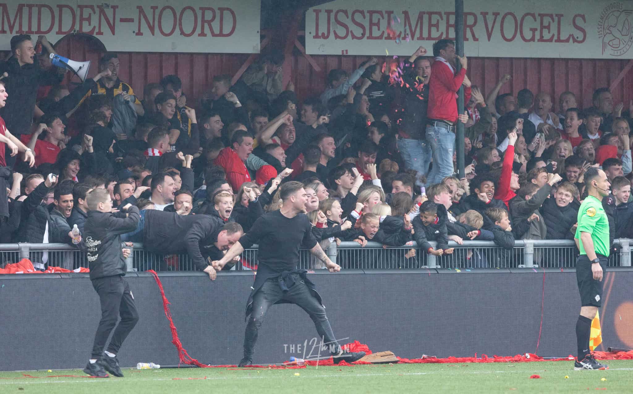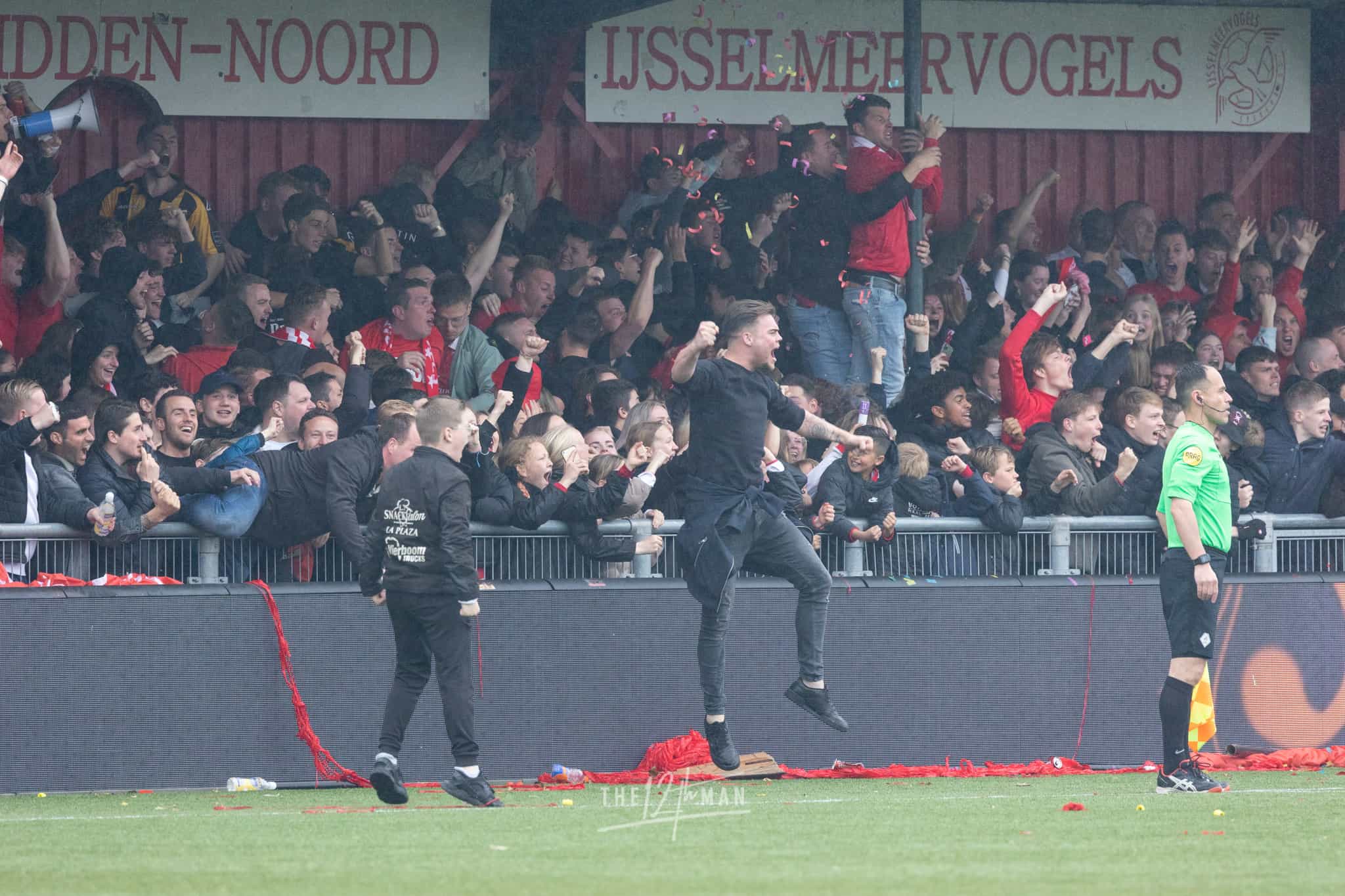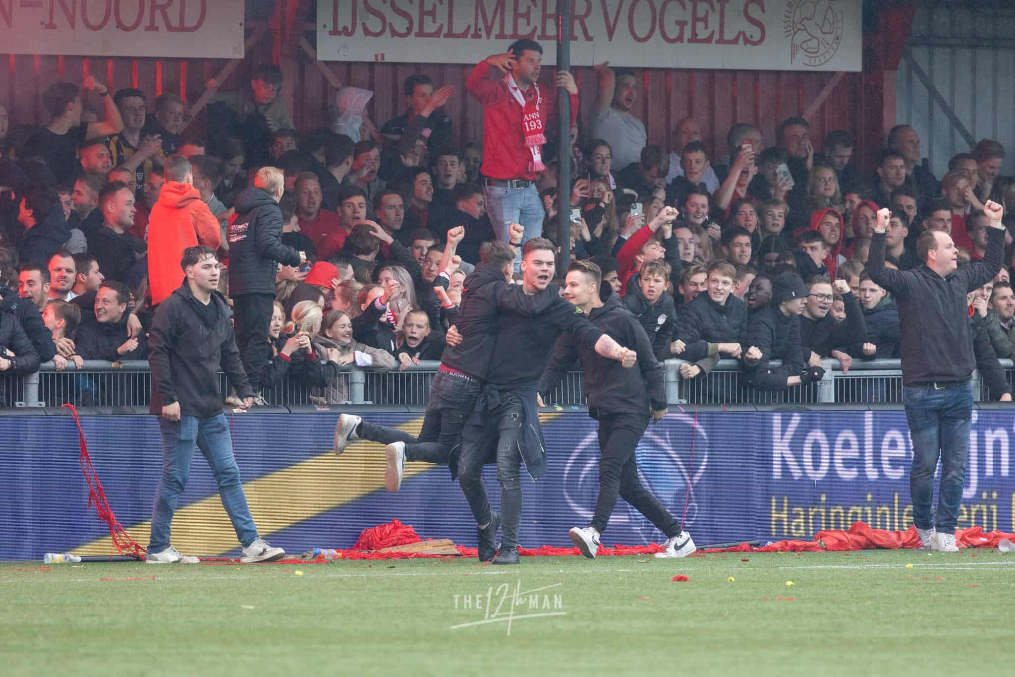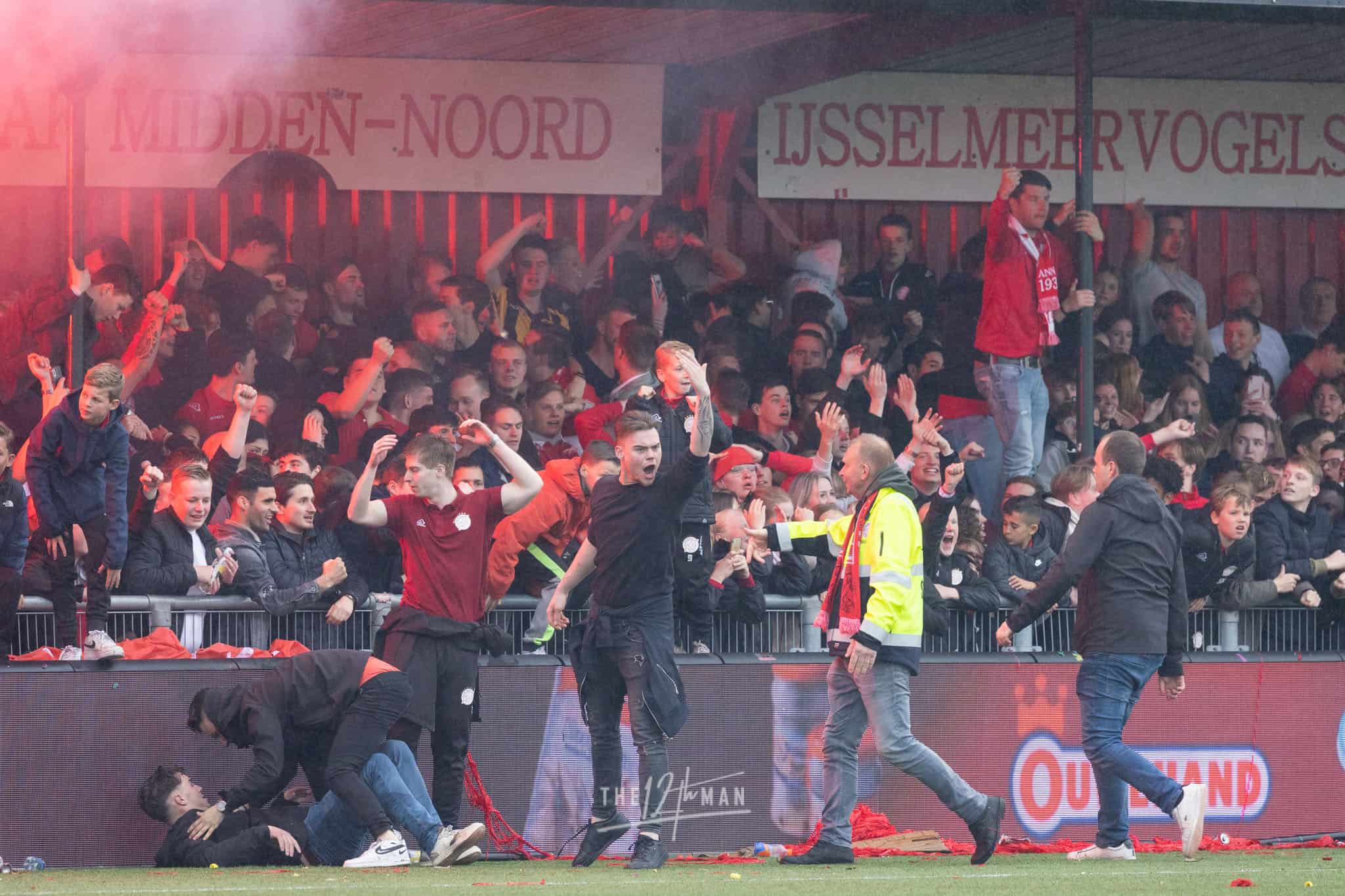 Vandaag wordt het feest nog net iets groter als El Haddouti zijn sterke invalbeurt bekroond met nog een doelpunt in blessuretijd. Nu zijn de supporters van IJsselmeervogels niet meer te houden. Een ware pitch invasion barst los. Van alle tribunes vliegen de supporters het veld op. Voor de scheidsrechter genoeg reden om maar direct af te fluiten, ook al stond er nog een minuut blessuretijd op de klok.