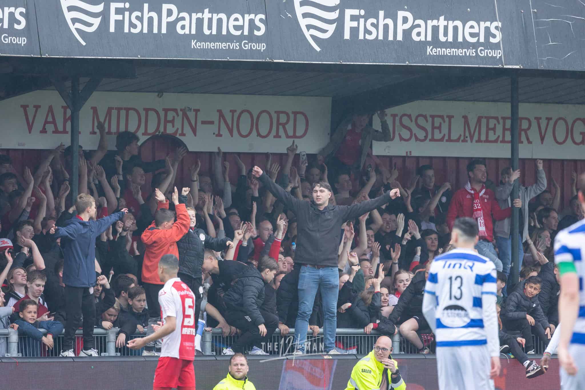 Het feest met de spelers hield nog lang aan op het veld. Alsof ze het kampioenschap hadden gewonnen. Zo belangrijk is winnen van je rivaal en dorpsgenoot dus. Daarnaast is het voor IJsselmeervogels ook de laatste strohalm in de strijd tegen degradatie. Nog altijd een 16e plaats wat nacompetitie betekent. Ze hebben 3 punten achterstand op Excelsior Maassluis en TEC. Nog vier cruciale wedstrijden te gaan.