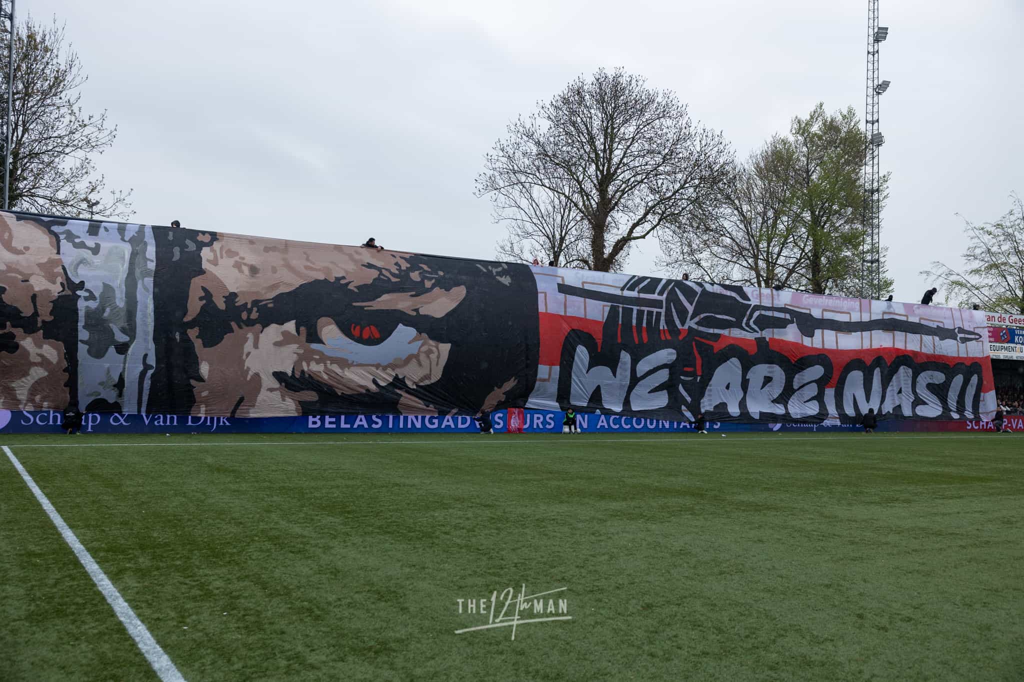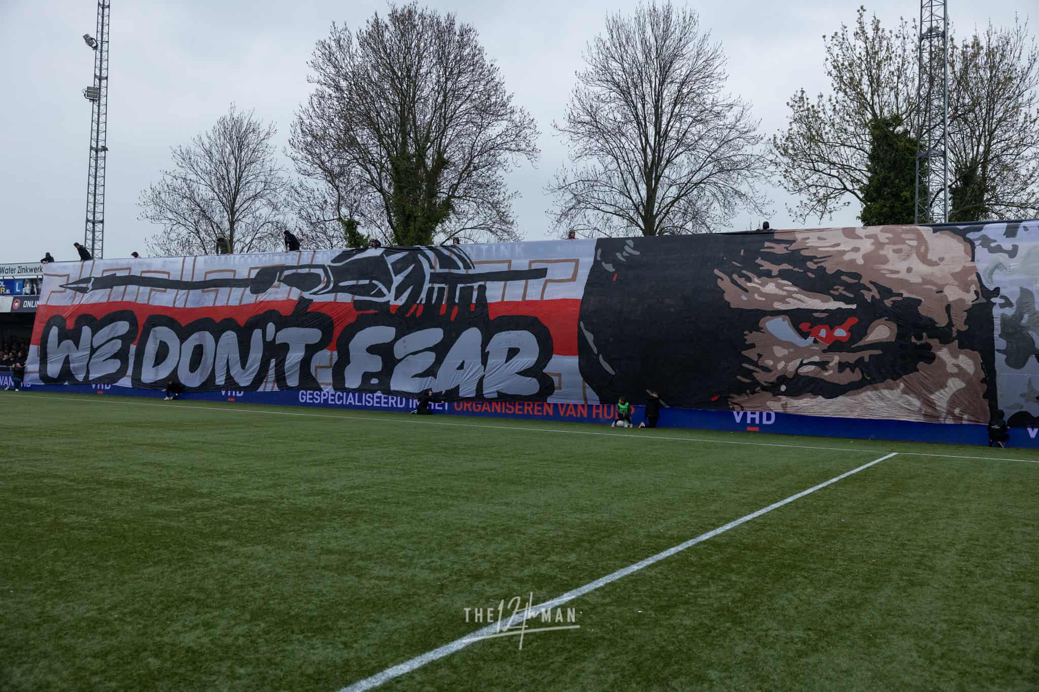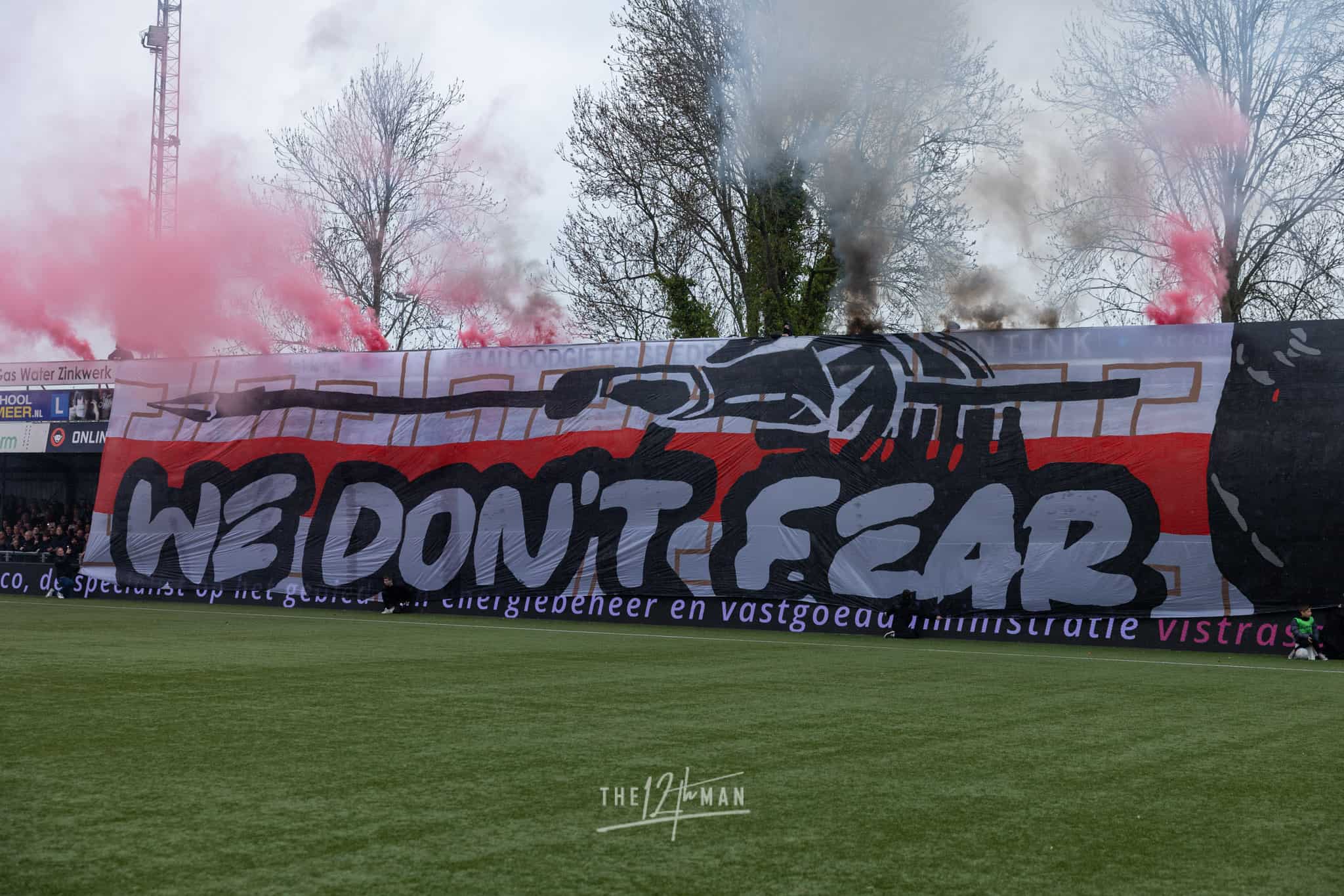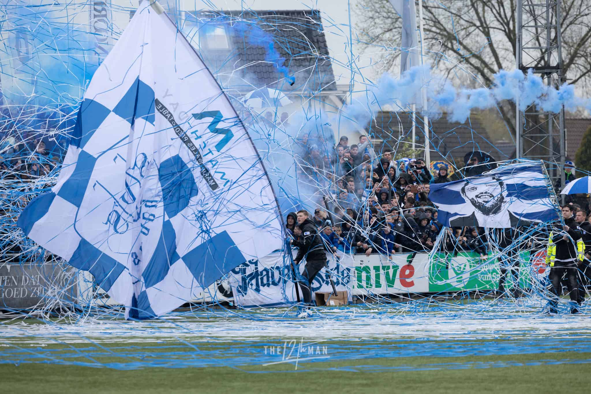 Dat ze bij de Vogels prachtige doeken kunnen maken, zag ik in 2019 al. Ook ditmaal stellen ze niet teleur. Bijna over de gehele lange zijde wordt een groot doek uitgerold als de spelers het veld betreden. “We don’t fear, we are NAS”, verwijzend naar de voormalig naam van IJsselmeervogels en hun supportersclub. In het uitvak worden blauw-witte linten weggeschoten en wat blauwe rookpotten het veld opgegooid.
