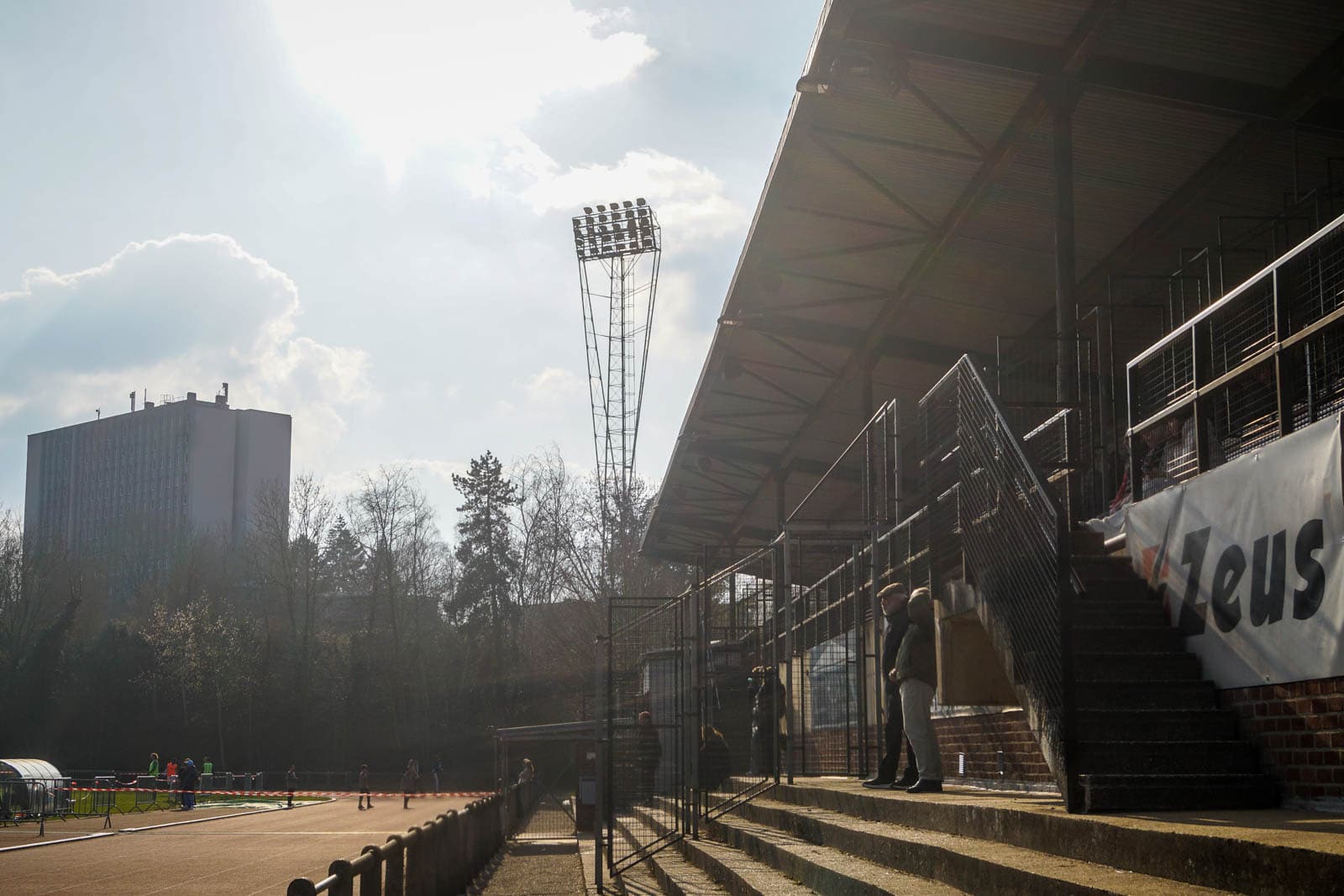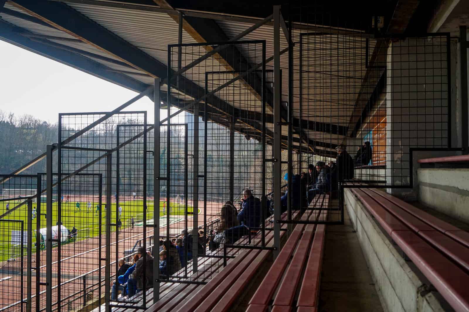 Een paar minuten voor de aftrap betreden we de hoofdtribune voor wat de Facebook van de club aankondigt als een ware ‘derby régional‘ tegen La Calamine – een mede-subtopper uit het nabijgelegen Kelmis. In totaal hebben zich ongeveer 400 supporters verzameld om deze strijd op het vierde niveau te aanschouwen, waaronder toch minimaal 50 groundhoppers. We zijn niet de enige met het plan voor een dubbel in Rostock, want in de kantine is een groep van 20 Hansa-aanhangers zich in rap tempo aan het bezatten. De voordelen van vrij vervoer!