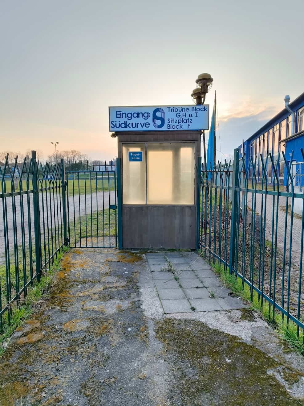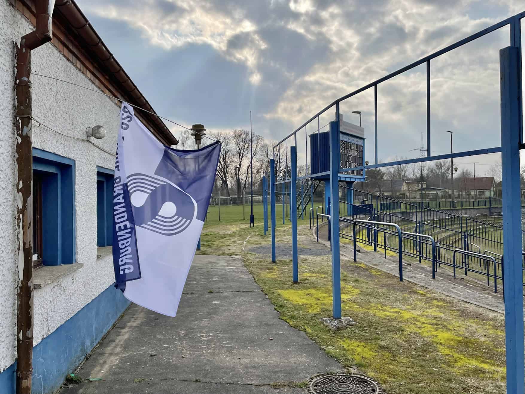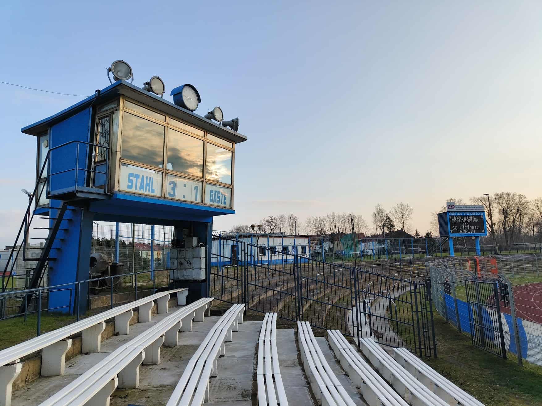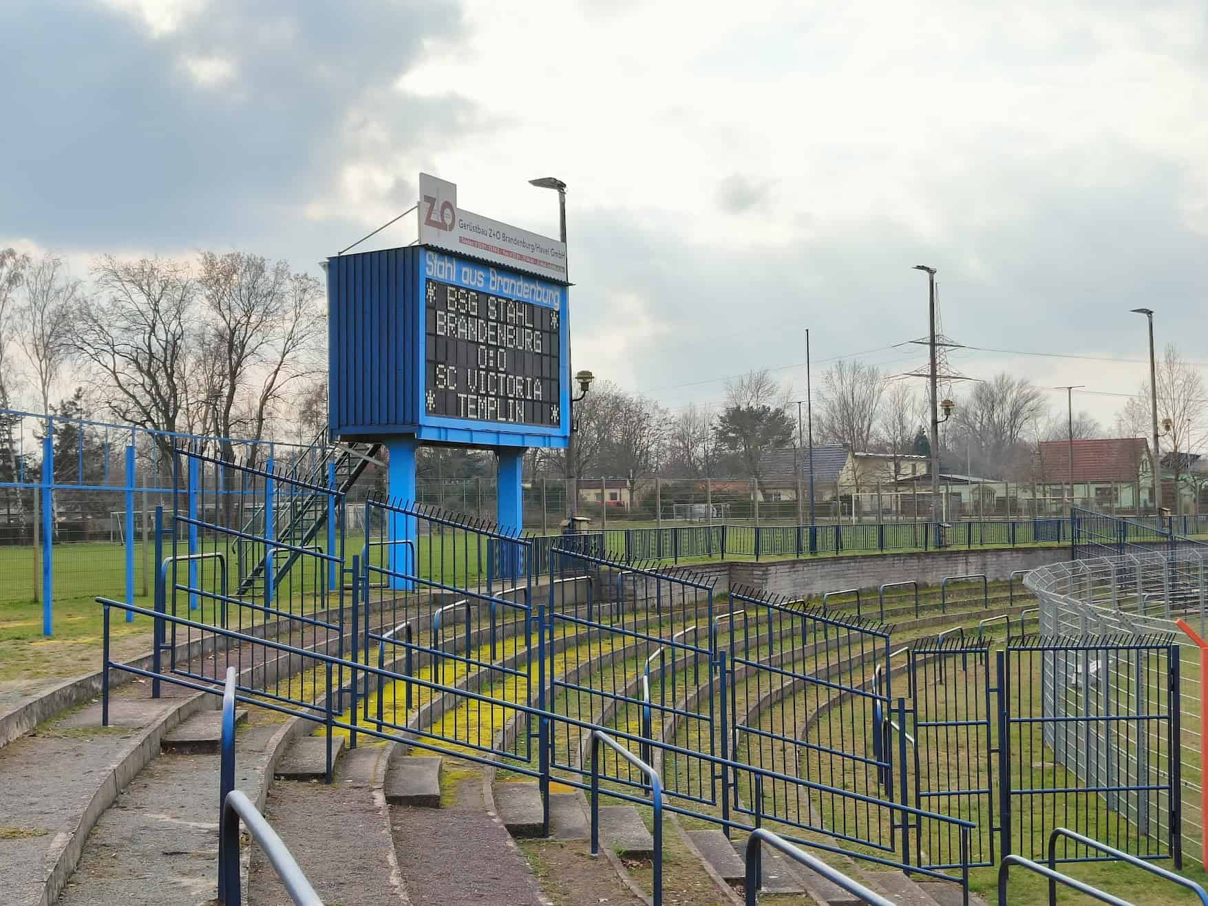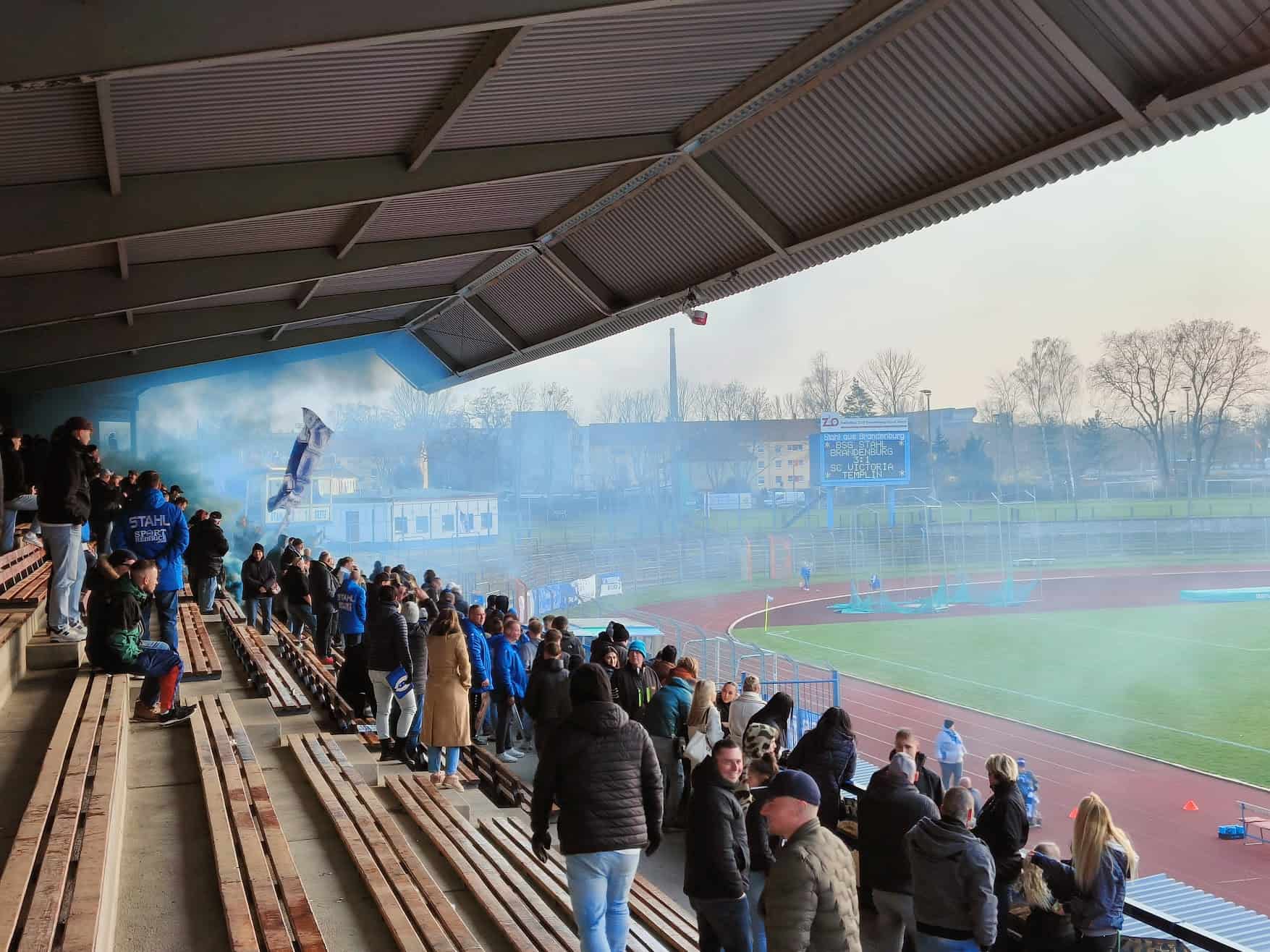 Vandaag speelt Stahl tegen het lager geklasseerde Victoria Templin en moet winnen om zicht te houden op mogelijke promotie. Al drie seizoenen op rij zijn ze twwede geëindigd en dit seizoen lijkt dat lot ook weer bezegeld. Een uur voor de wedstrijd is het al gezellig druk en we spotten her en der wat groundhoppers. Na een lange reis willen we eerst even naar het toilet voor we aan een welverdiend biertje gaan. Nou, die toilet is er eigenlijk niet en we worden onder de tribune richting de kleedkamers gestuurd. We noemen het maar even kult.