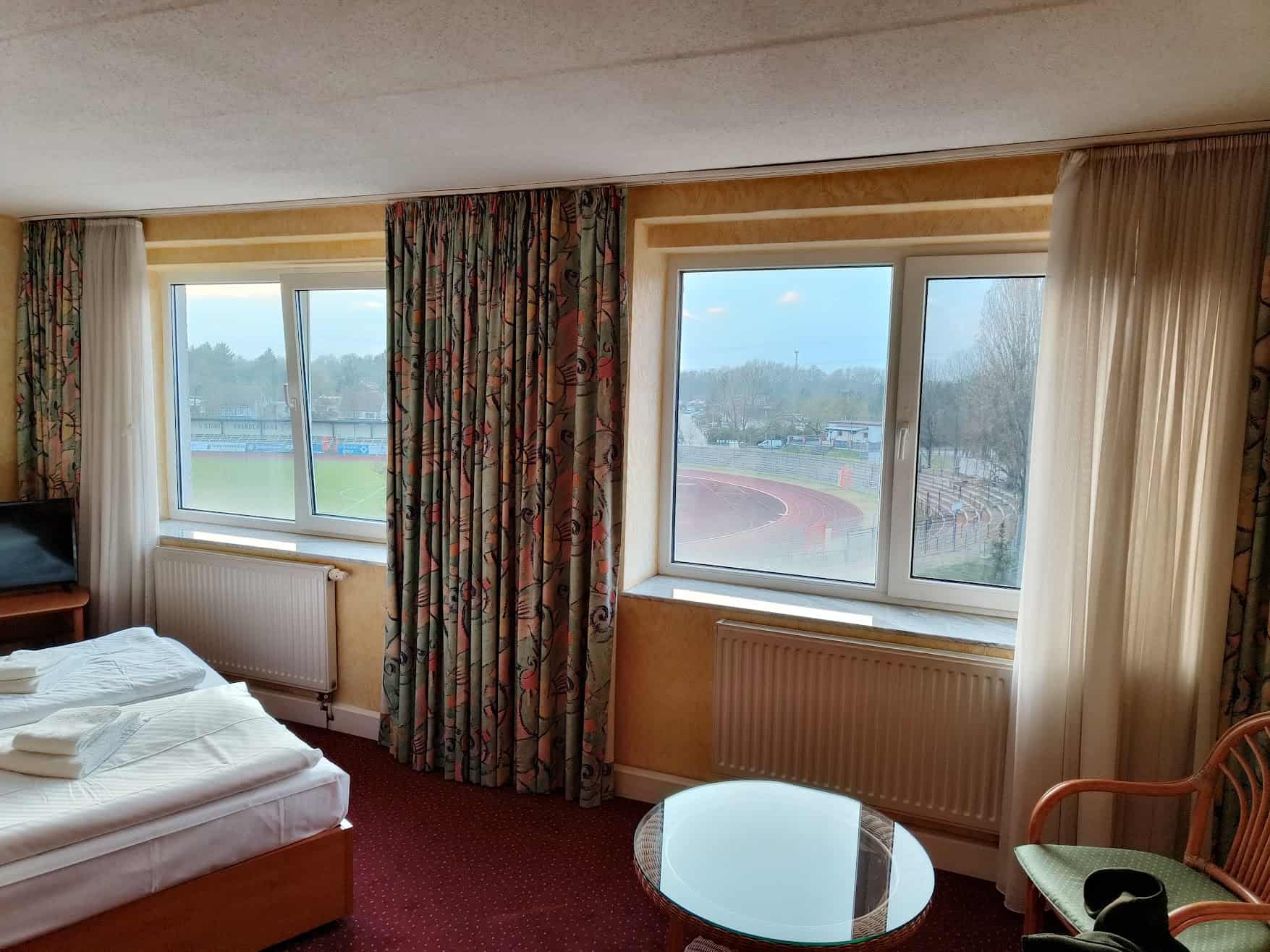 Wij gaan voldaan naar de auto en halen onze spullen op om in te checken bij het naastgelegen hotel. Van buiten een prachtige Plattenbau, maar van binnen best wel luxe! We worden ontvangen als de Niederlandische Stahl-fans, maar de vraag is: zijn onze wensen goed doorgekomen en hebben we kamers met uitzicht? Nou… dat is gelukt. We krijgen beiden een prachtige, ruime kamer met zicht op het speelveld. Erg tof! We besluiten een hapje te gaan eten in het aangrenzende restaurant. Toen we hier de eerste keer waren, zagen we veel negatieve recensies die passen bij de vergane glorie van deze stad. Toch smaken de gerechten prima en nog belangrijker, er is goed bier van de tap.
