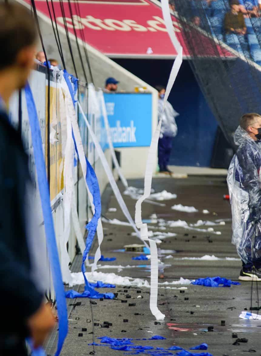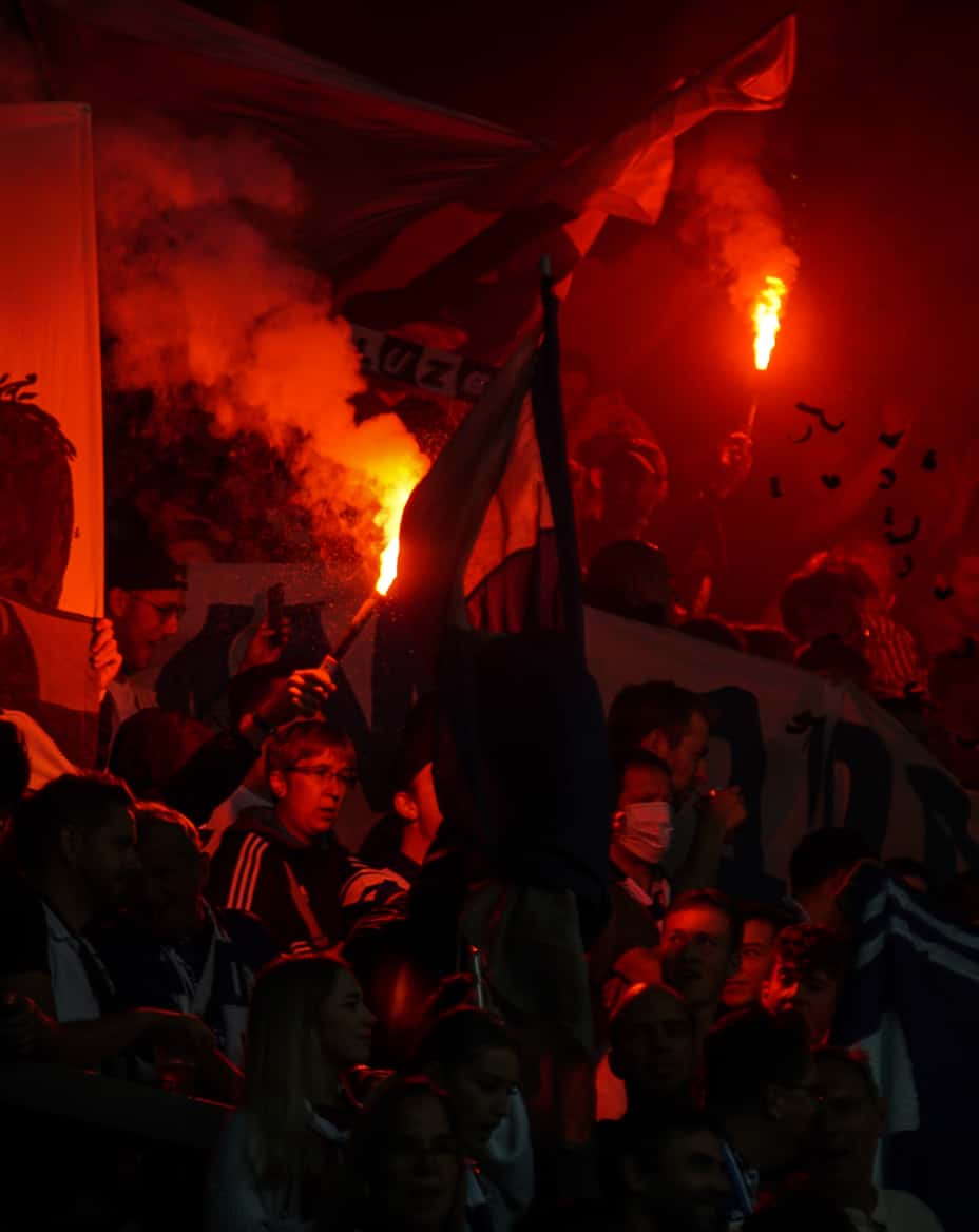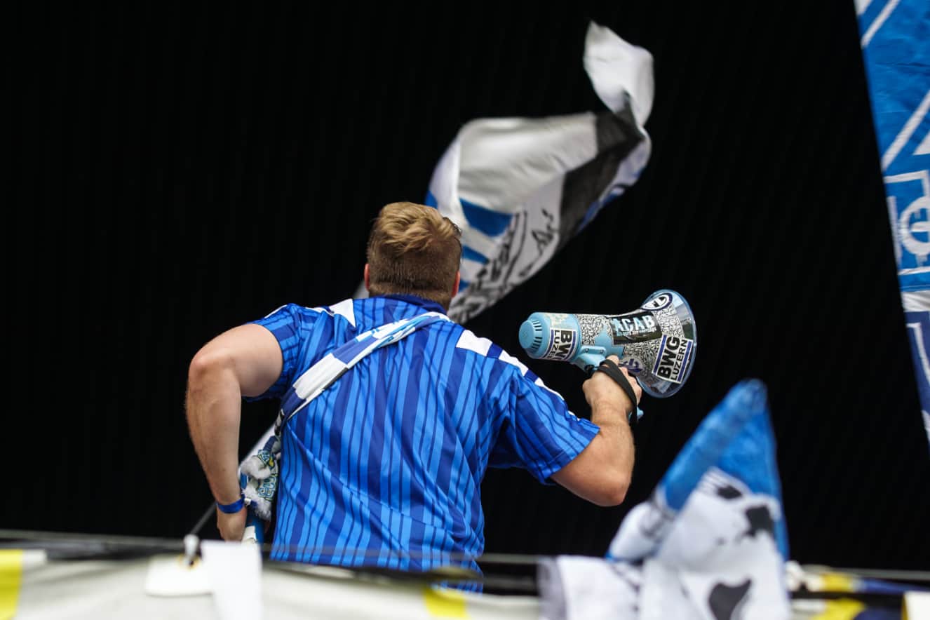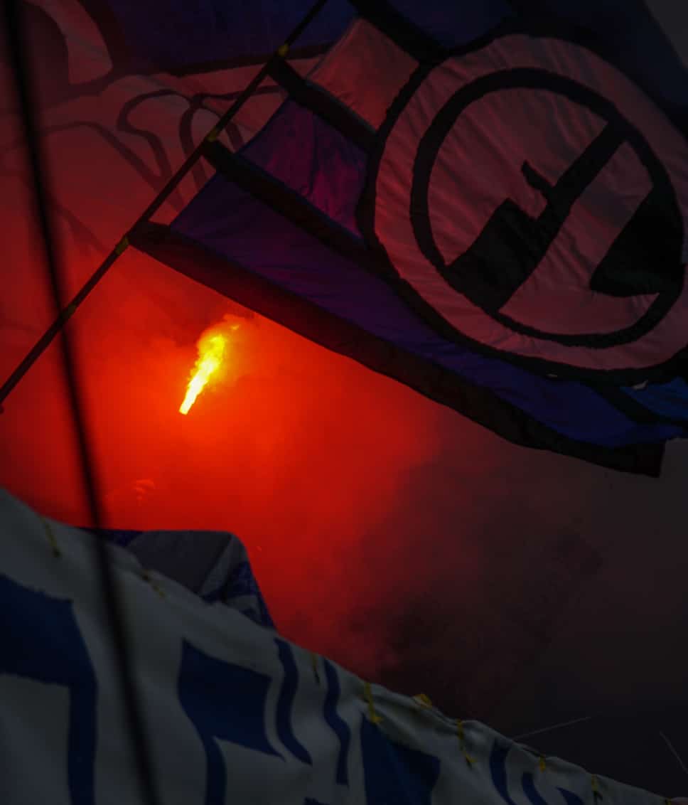 Dat gevoel wordt alleen maar vergroot wanneer de spelers het veld betreden en de droom die we van tevoren hadden, uitkomt. Er staat een sfeeractie op het programma. Mét pyro! De hele korte zijde is gevuld met kleine spandoeken, bandieri’s en andere vormen van liefdesuitingen voor FC Luzern. In het midden gaat het grootste doek omhoog in de vorm van een retroshirt zoals we vandaag al velen malen voorbij hebben zien komen. Vervolgens rollen de blauw en witte slierten papier van de tribune af. Als hierna meerdere personen verschijnen met blauwwitte bivakmutsen op weten we zeker hoe laat het is. Tijd voor vuurwerk! Het aangezicht van meerdere fakkels die ontbranden op een volle staantribune. We waren al bijna vergeten hoe dat ook alweer voelt. Al met al is het een heerlijk allegaartje vol chaos op de tribune, waar op elk stukje iets lijkt te gebeuren. Juist die chaos hebben we zo gemist in de gereguleerde coronasamenleving.